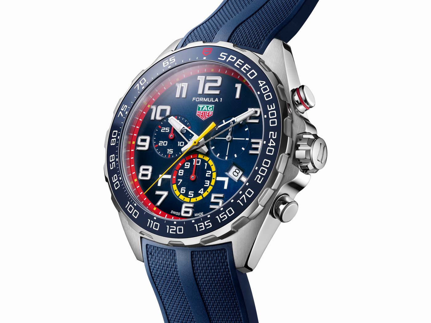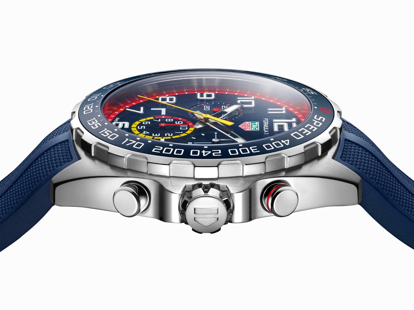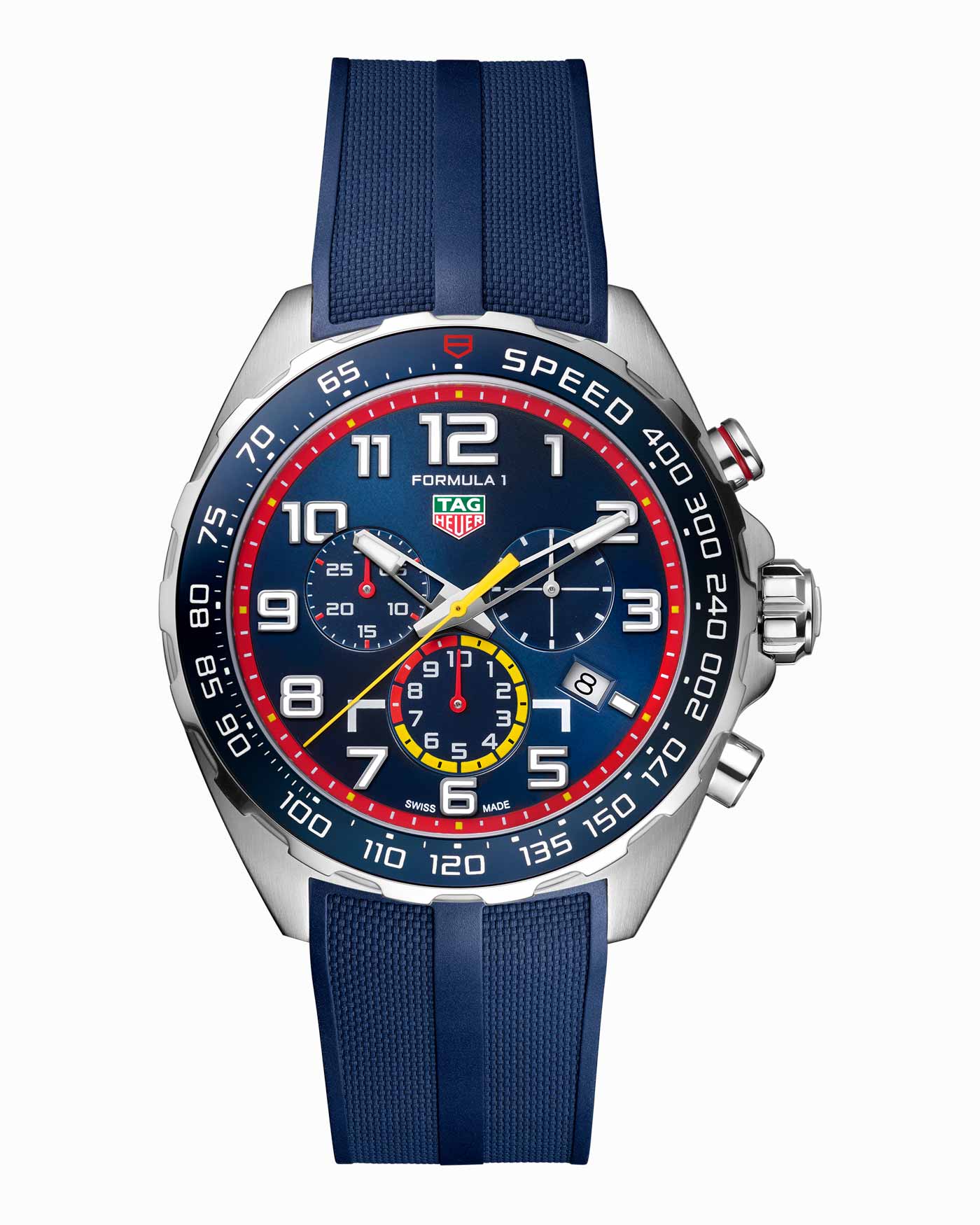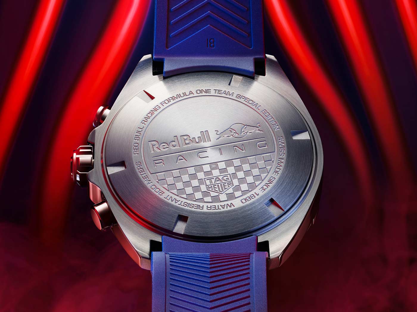 The Formula 1 Red Bull Racing Special Edition, available on a stainless steel bracelet ($2,150.00) or blue rubber strap ($2,000.00) from tagheuer.com