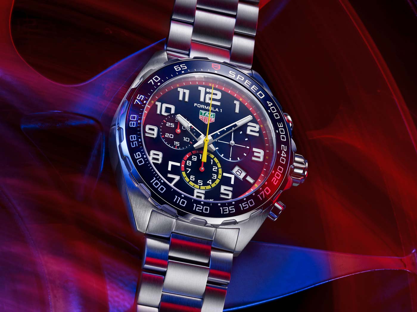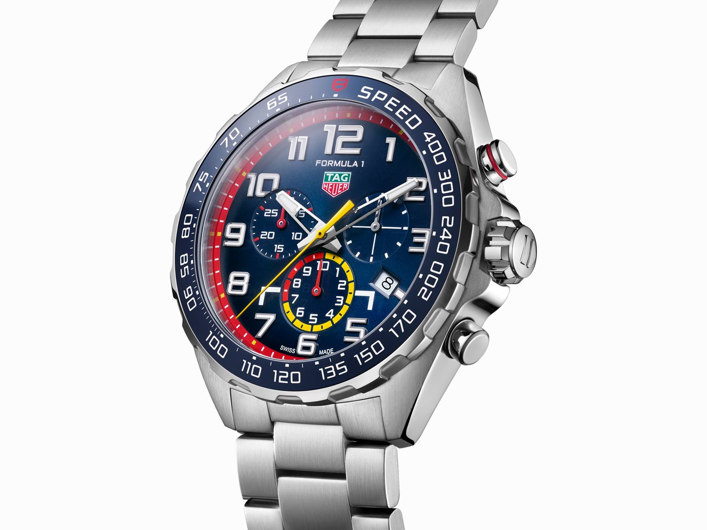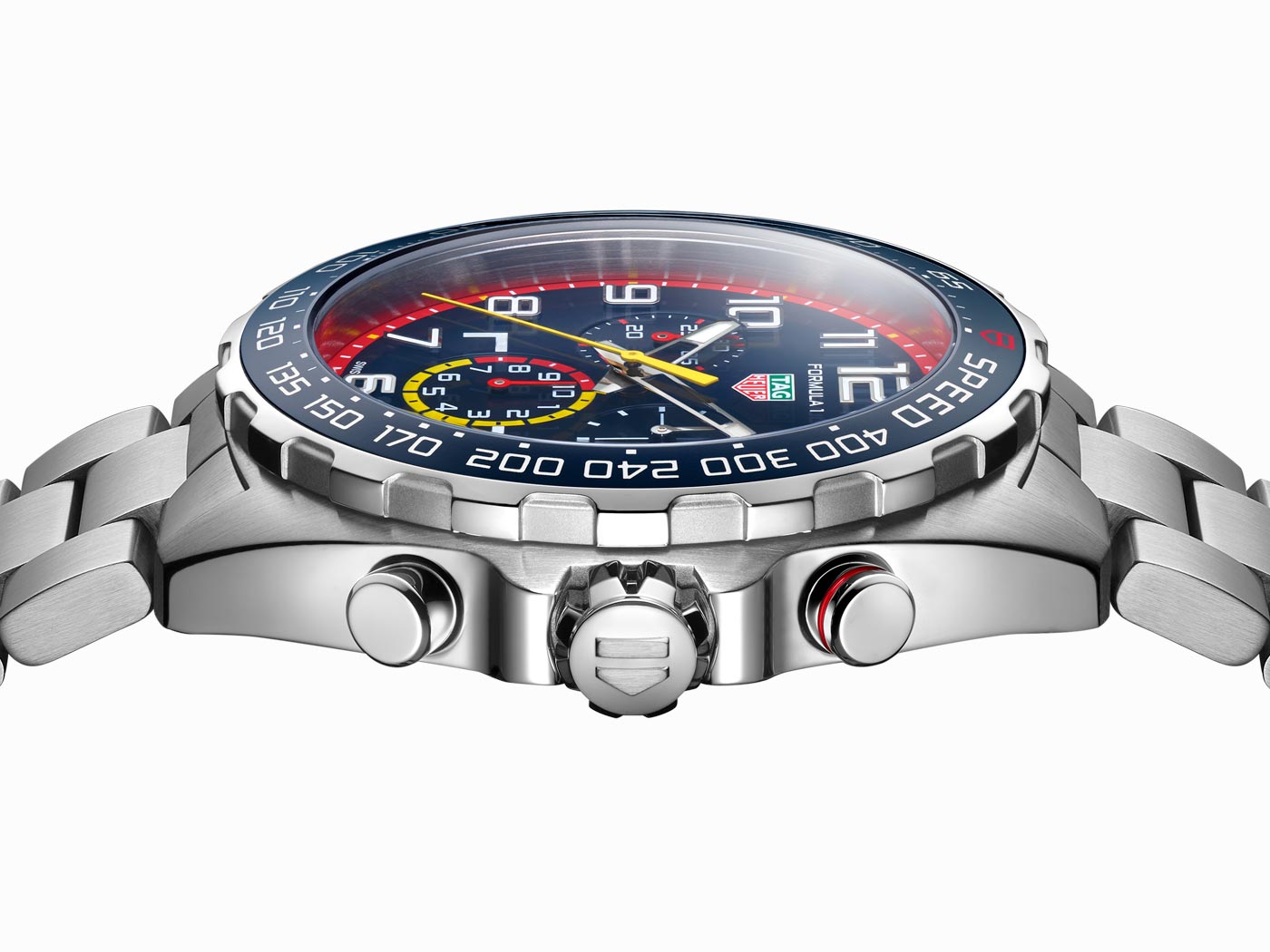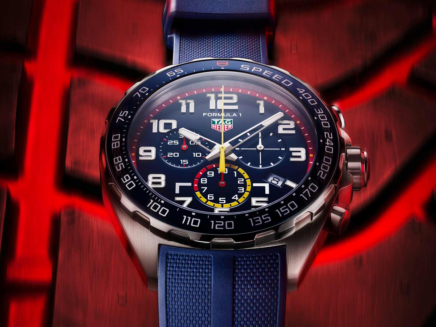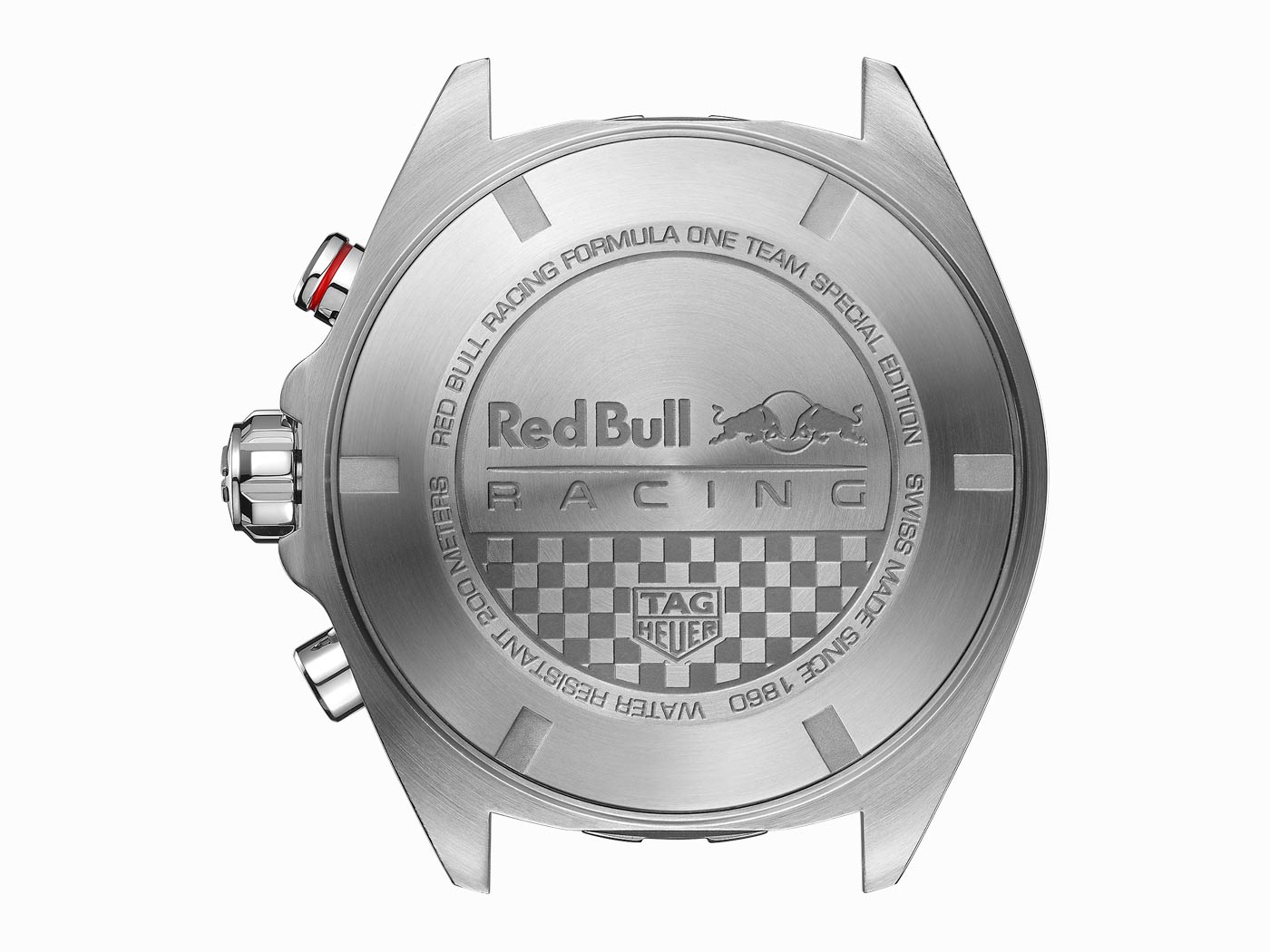 The Formula 1 Red Bull Racing Special Edition, available on a stainless steel bracelet ($2,150.00) or blue rubber strap ($2,000.00) from tagheuer.com