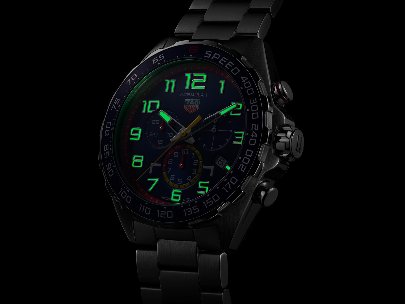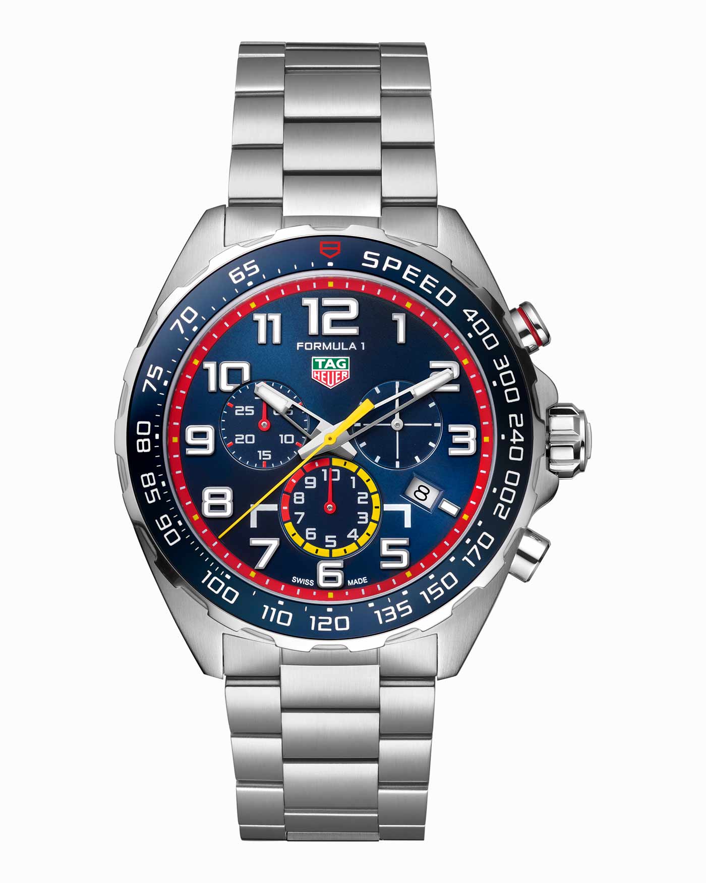 When Red Bull’s Max Verstappen passed Lewis Hamilton during the final lap of the 2021 Abu Dhabi Grand Prix, he secured his first World Drivers’ Championship. This was the first time in seven years that a Mercedes F1 driver didn’t finish the season as world champion, and Red Bull’s first series title since 2013. To celebrate Verstappen’s milestone victory TAG Heuer issued a brand-new version of the Formula 1 Red Bull Racing Special Edition chronograph. As the teams official timekeeper, TAG worked closely with Red Bull to ensure the new design incorporated RBR’s red, yellow and blue color palette. Inside the 43-mm stainless steel case, the new sunray brushed blue dial features a yellow central seconds hand and a 1/10 second chronograph counter at 6 o’clock with red and yellow details. Luminous Arabic numeral reference race car speedometers, while the lines above 5 and 7 recall the starting line of an F1 track. In a nod to F1 fans, the blue aluminum tachymeter bezel is engraved with the word SPEED and the case back is engraved with RBR’s official team graphic.
