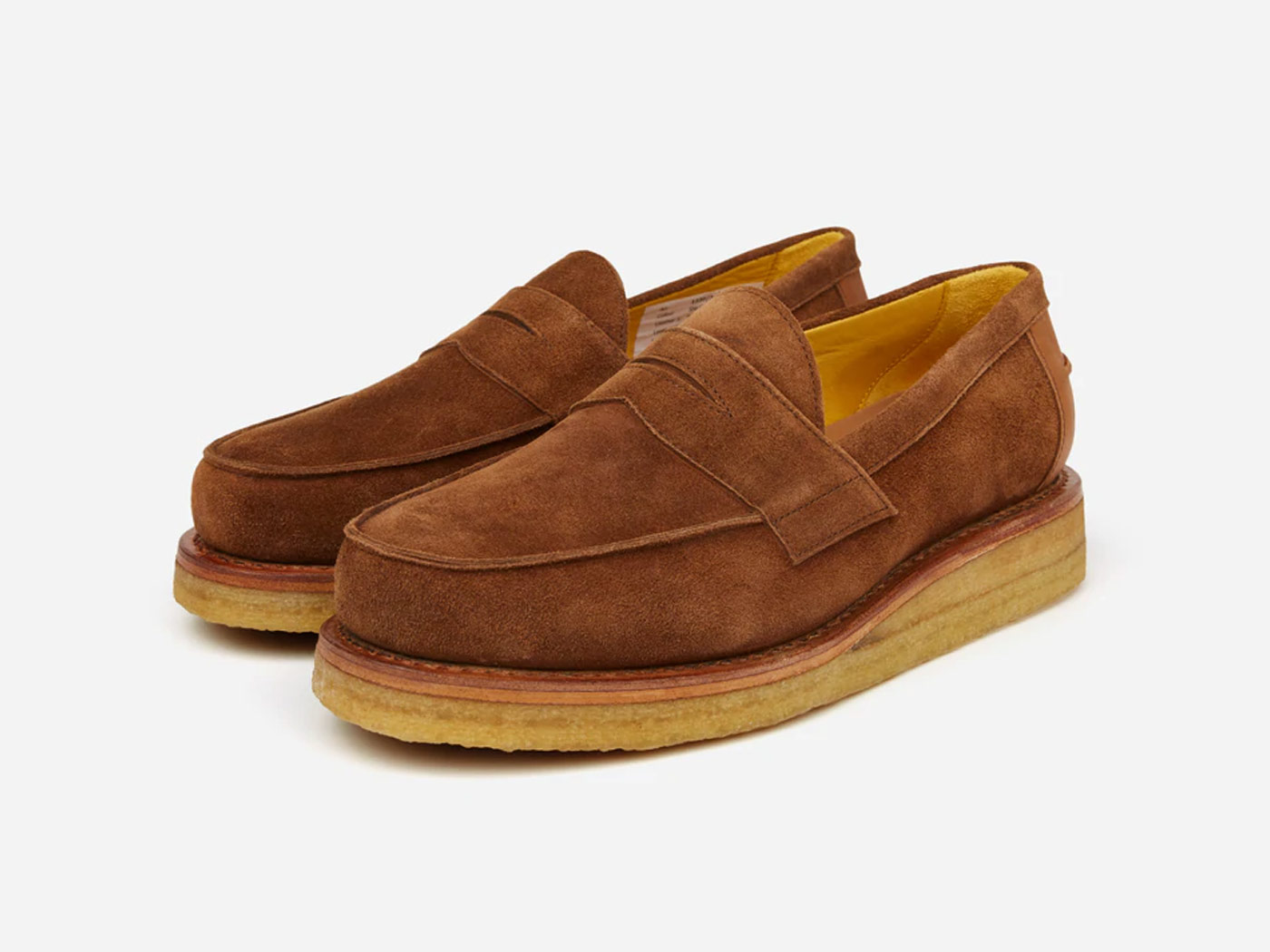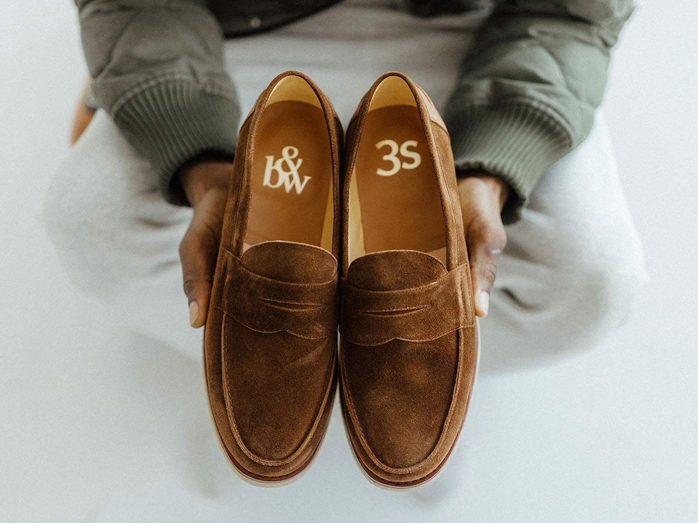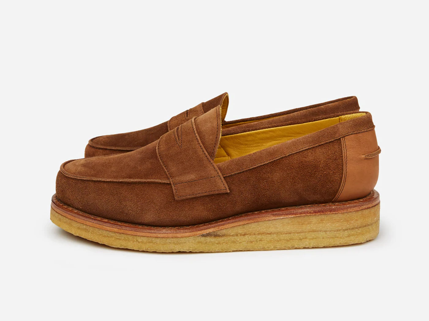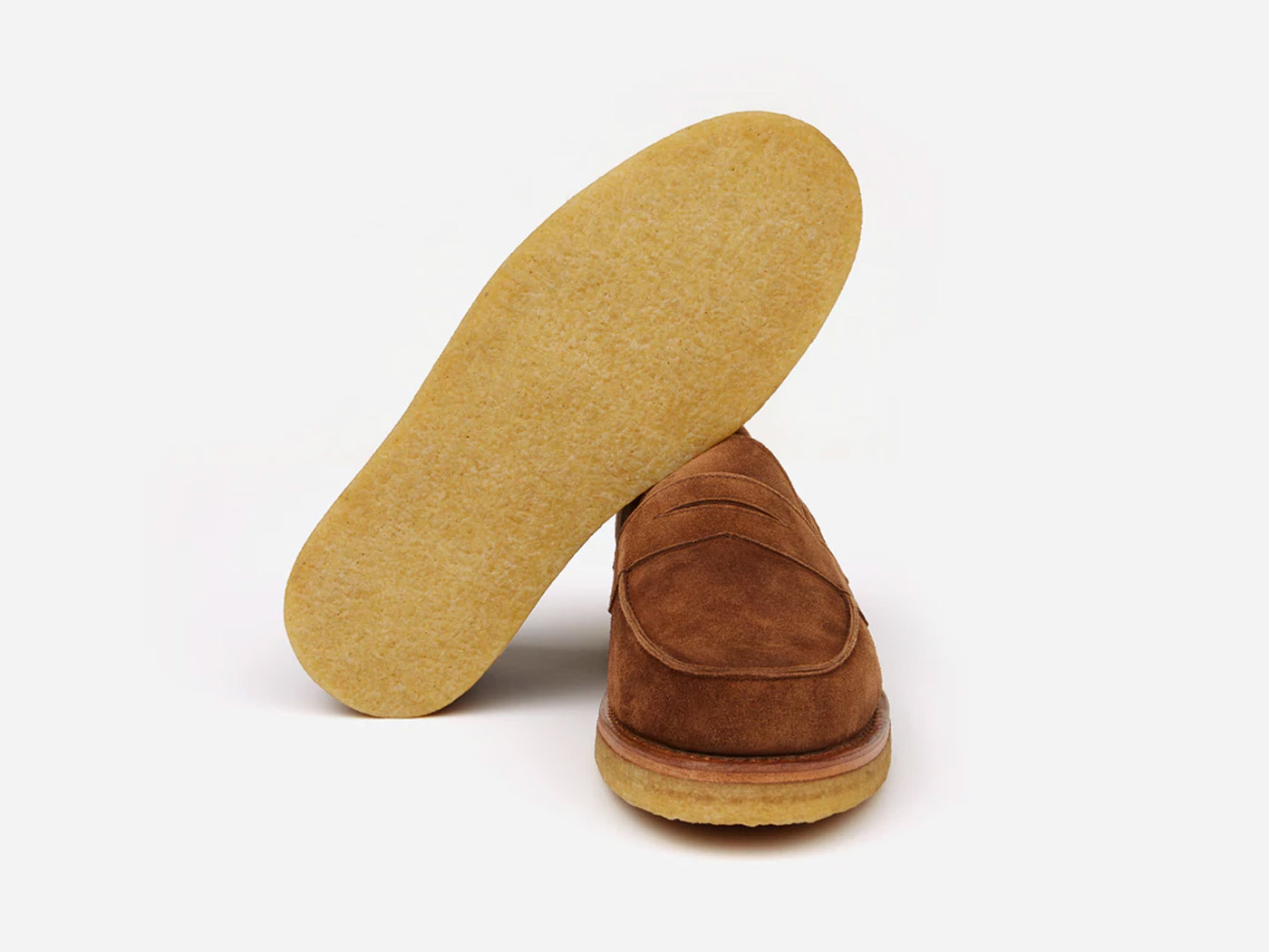Blackstock & Weber created an exclusive version of their Ellis Penny Loafer exclusively for denim focused menswear brand 3sixteen. Made from supple snuff brown suede, the uppers sit on super-thick 100% rubber crepe wedge soles – a first for the self-proclaimed makers of ‘the best loafers in the world.’ A small smooth-out detail on the heel provides a bit of contrast. The shoes are finished with co-branded gold foil B&W and 3S heel stamps on the yellow leather lining.