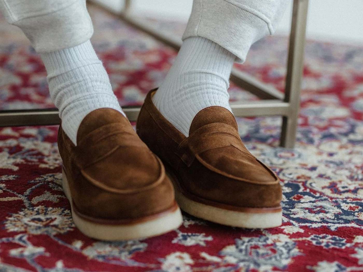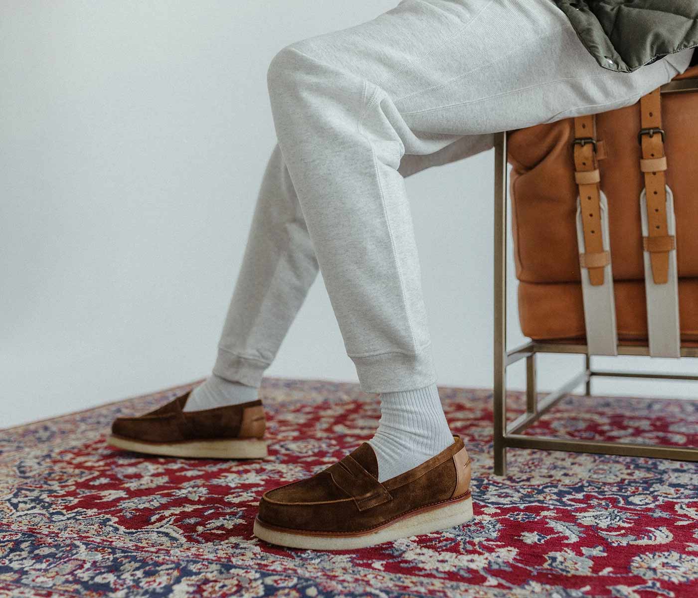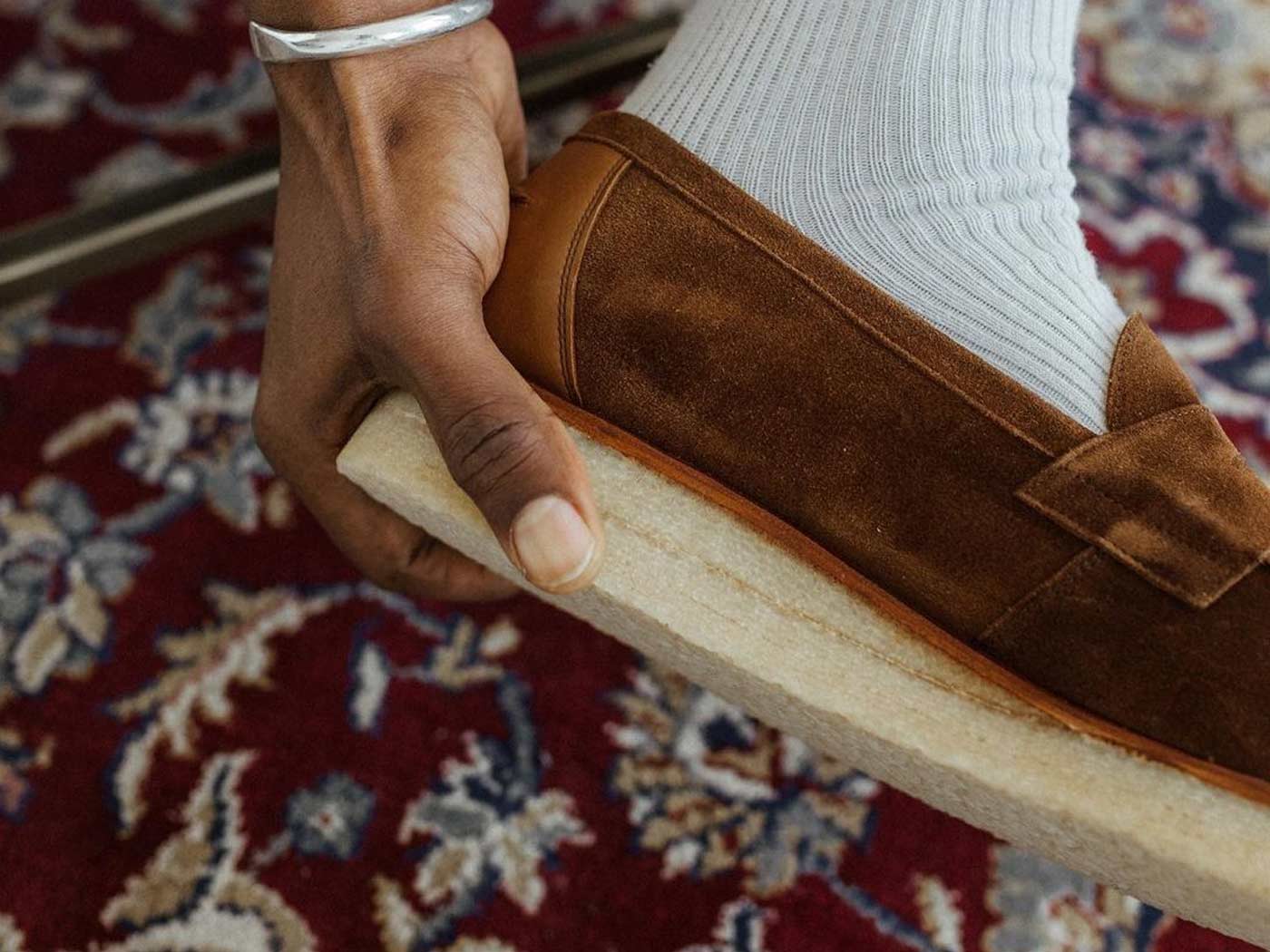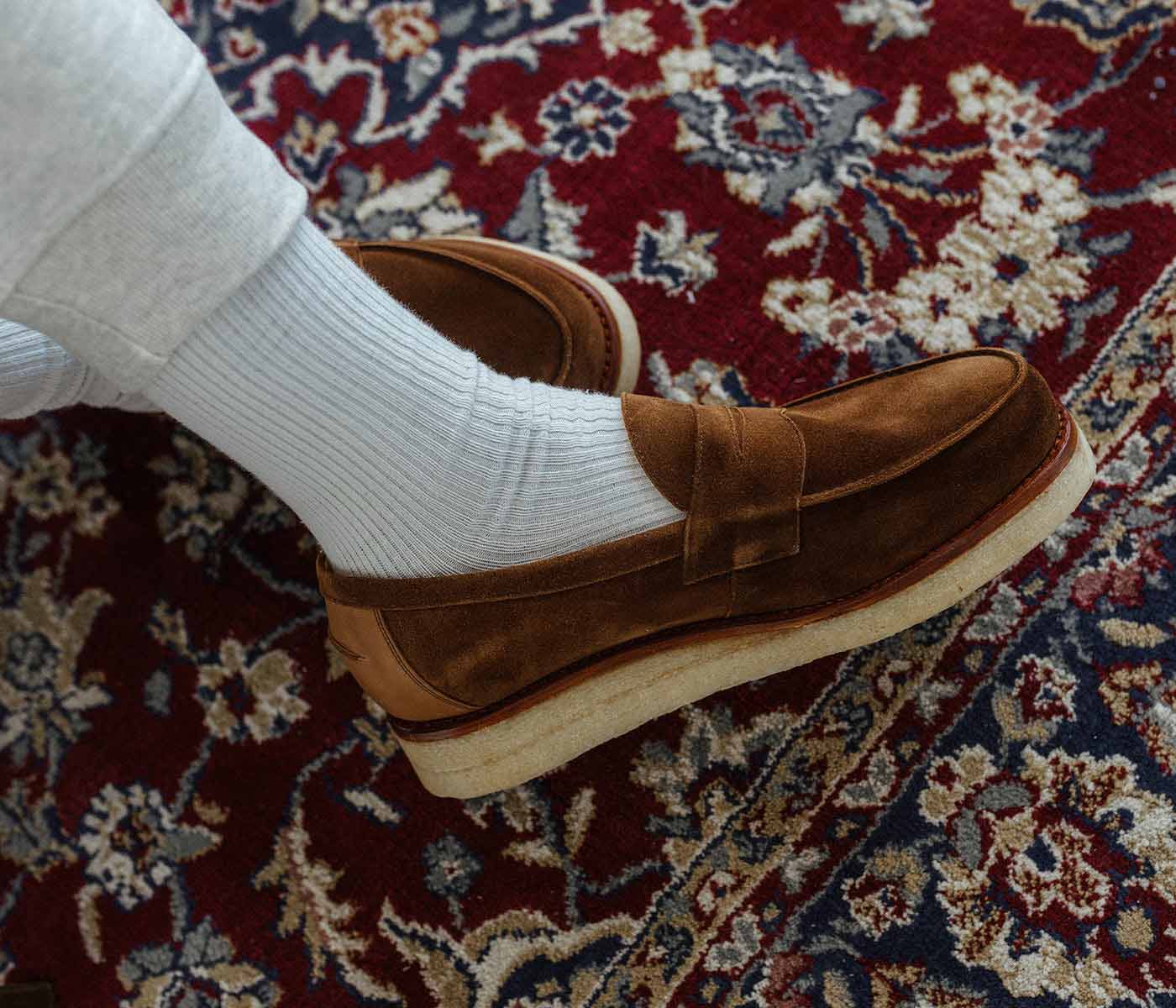 Blackstock & Weber created an exclusive version of their Ellis Penny Loafer exclusively for denim focused menswear brand 3sixteen. Made from supple snuff brown suede, the uppers sit on super-thick 100% rubber crepe wedge soles – a first for the self-proclaimed makers of ‘the best loafers in the world.’ A small smooth-out detail on the heel provides a bit of contrast. The shoes are finished with co-branded gold foil B&W and 3S heel stamps on the yellow leather lining.