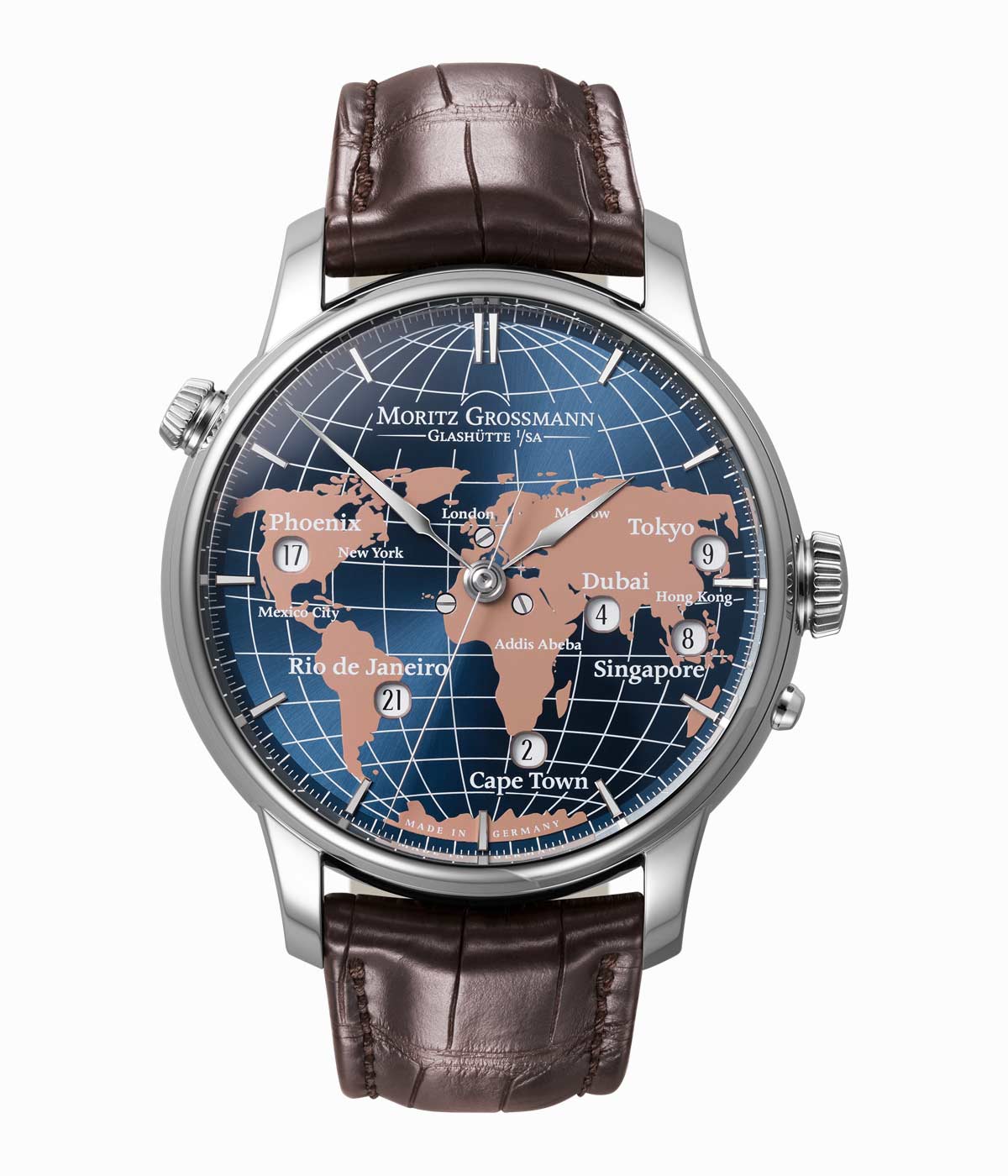 Moritz Grossmann’s new Universalzeit model makes it possible to see the current time in several cities across the world in a single glace. Designed in the shape of a world map with salmon colored continents on top of latitude and longitude lines, the blue dial has time windows precisely aligned with the coordinates of six cities. Daylight-saving time is not observed in these cities, so the watch can indicate time year round without adjustments. The hour in the each city is displayed from 0 to 24 inside the windows. The main time is displayed by lance-shaped hour and minute hands, while the minute and second hands track the corresponding increments for all time zones. Grossmann’s in-house calibre 100.7 manual movement sits inside the 44.5 mm stainless steel case and is fully visible through the sapphire crystal case back.