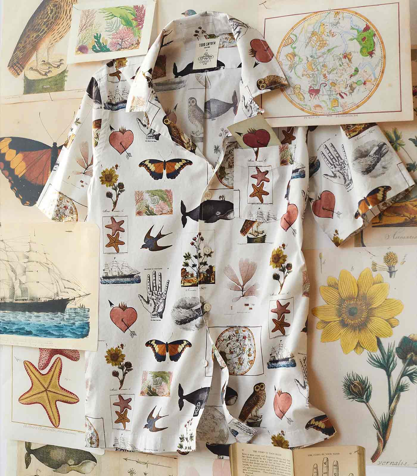 Todd Snyder continues to find inspirational gems in John Derian’s archive. For the latest installment in their ongoing collaboration, Snyder created a series of summer ready camp collar shirts based on rare prints from the artist’s collection. Derian fans will recognize the paint palette print, a popular motif used on paperweights and trays, and the collage print, a mash-up of signature themes including ships, whales and palmistry. The shirts are cut from a lightweight cotton blend with a tailored fit.