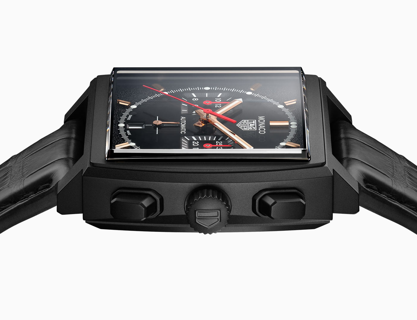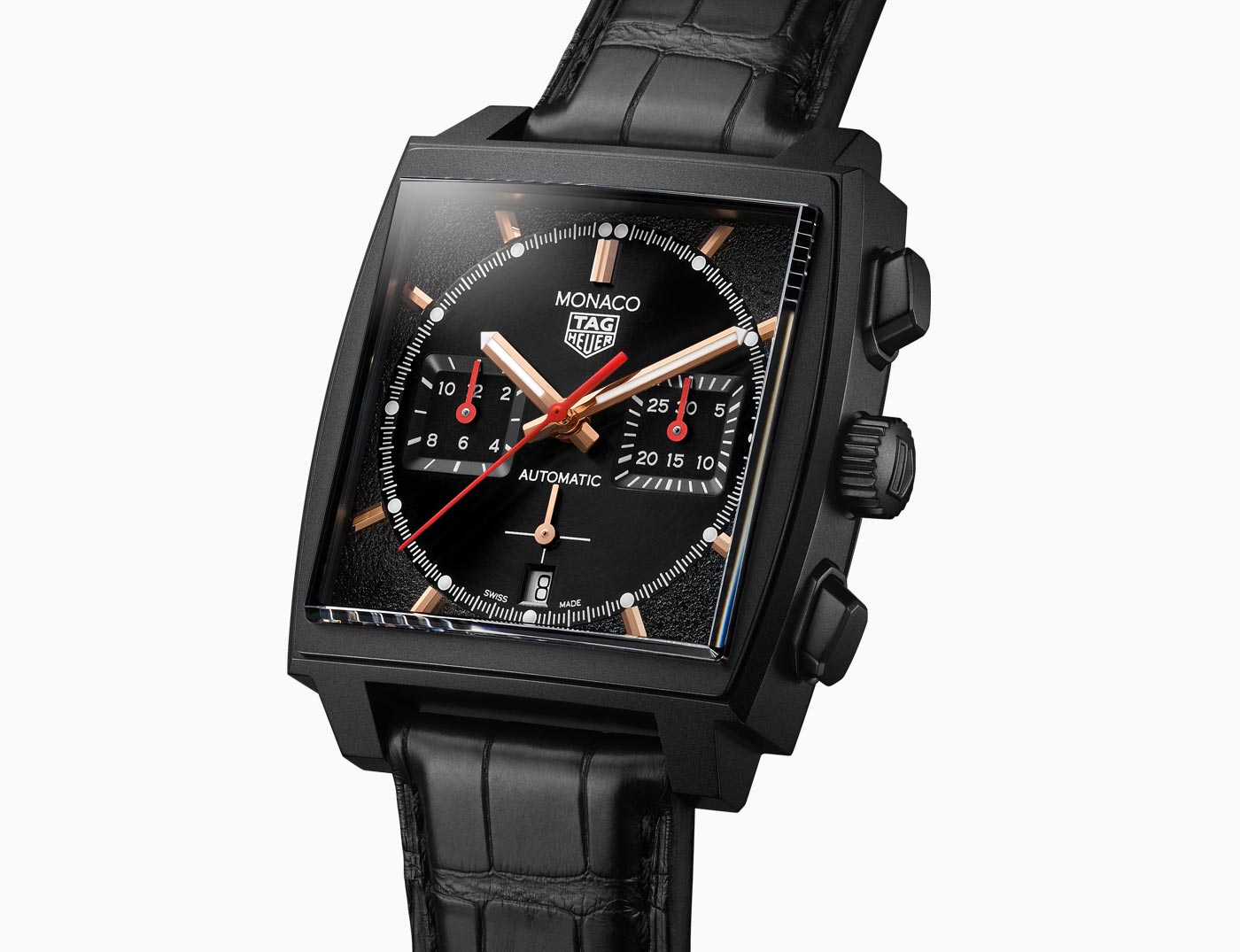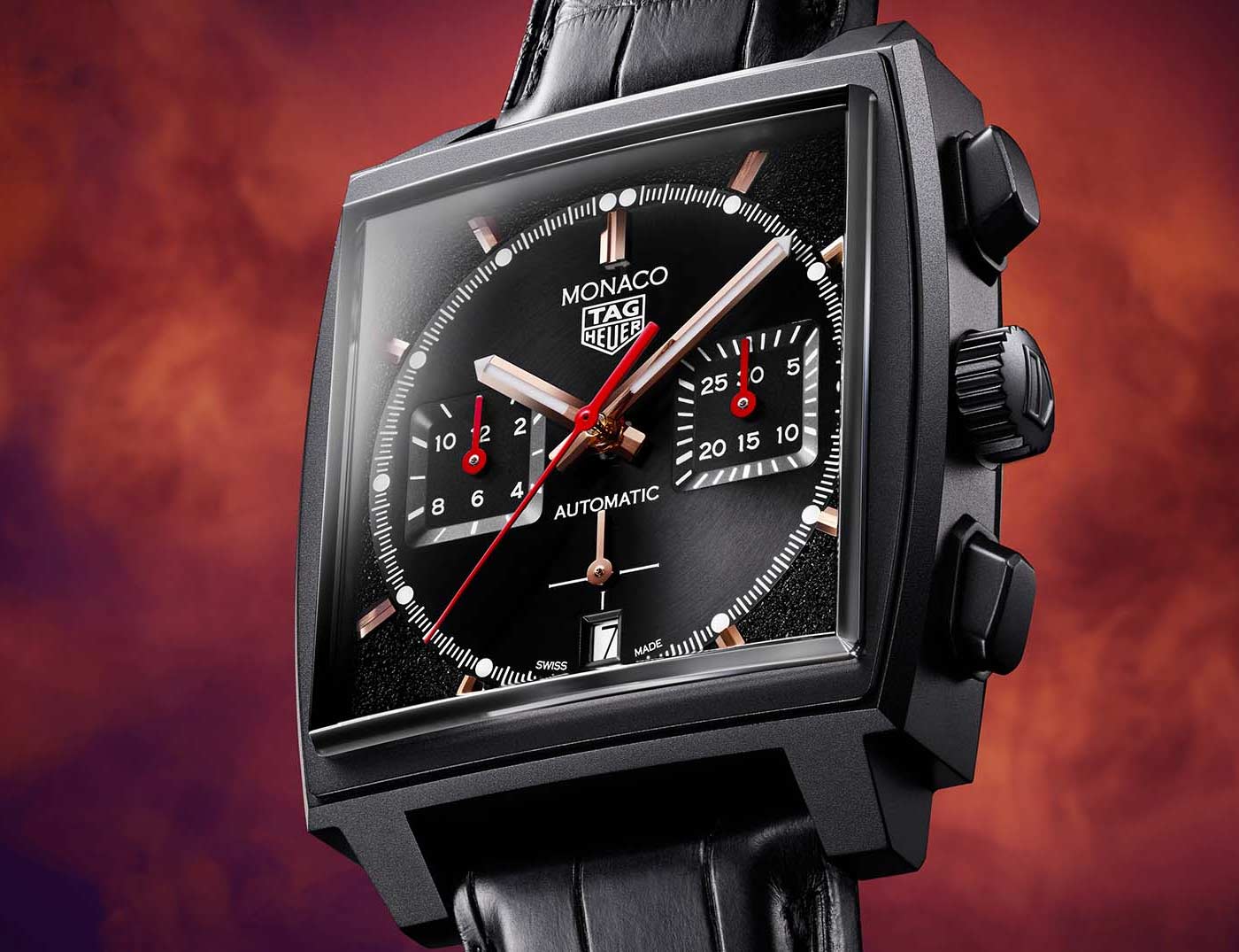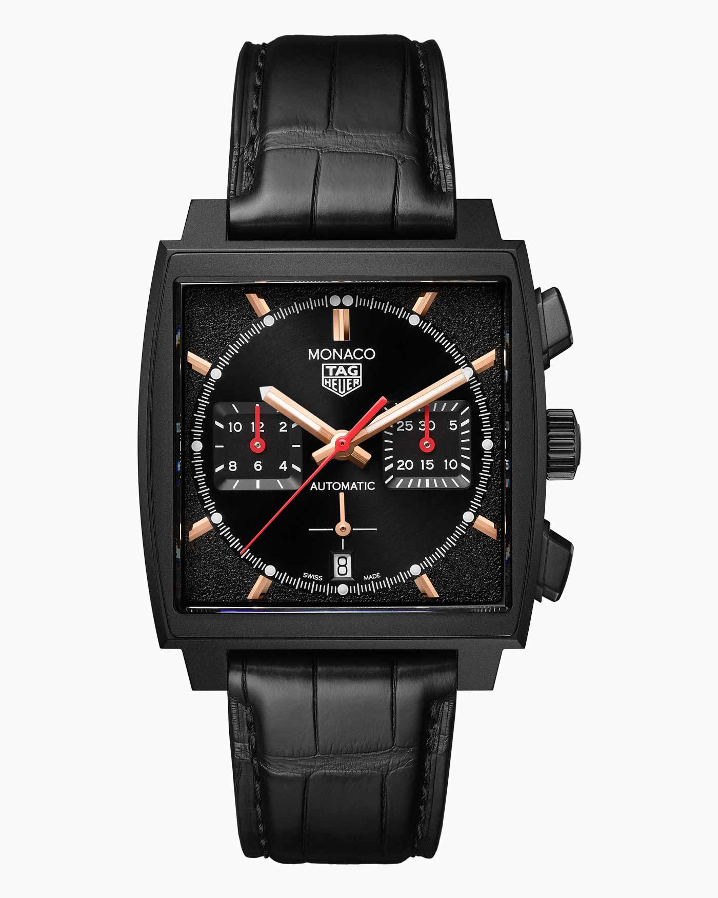 With just a few days to go before the 2022 Monaco Grand Prix, TAG Heuer introduces an all black edition of the principalities namesake chronograph. Made of black-coated titanium, this year’s Monaco Special Edition channels a version of the watch released in the late 1970s – with a matte black dial and case – nicknamed ‘Dark Lord’ by collectors and enthusiasts. The diamond-like carbon coatings on the 39-mm case is sandblasted to produced a grained finish. This is only the second titanium version of the Monaco, and the first made of DLC-coated titanium. Advances in coatings now allow DLC to be used not only on the case, but also on the crown, pushers and case-back. The deep black dial sets off rose gold markers, hour and minute hands, as well as the rich red chronograph and seconds hands. The sandblasted outer dial creates a grained finish reminiscent of the grip on F1 tracks. Inside, the Heuer 02 movement produces an 80-hour power reserve. Finished with a rose gold-plated oscillating mass, the movement is visible through the sapphire case-back.