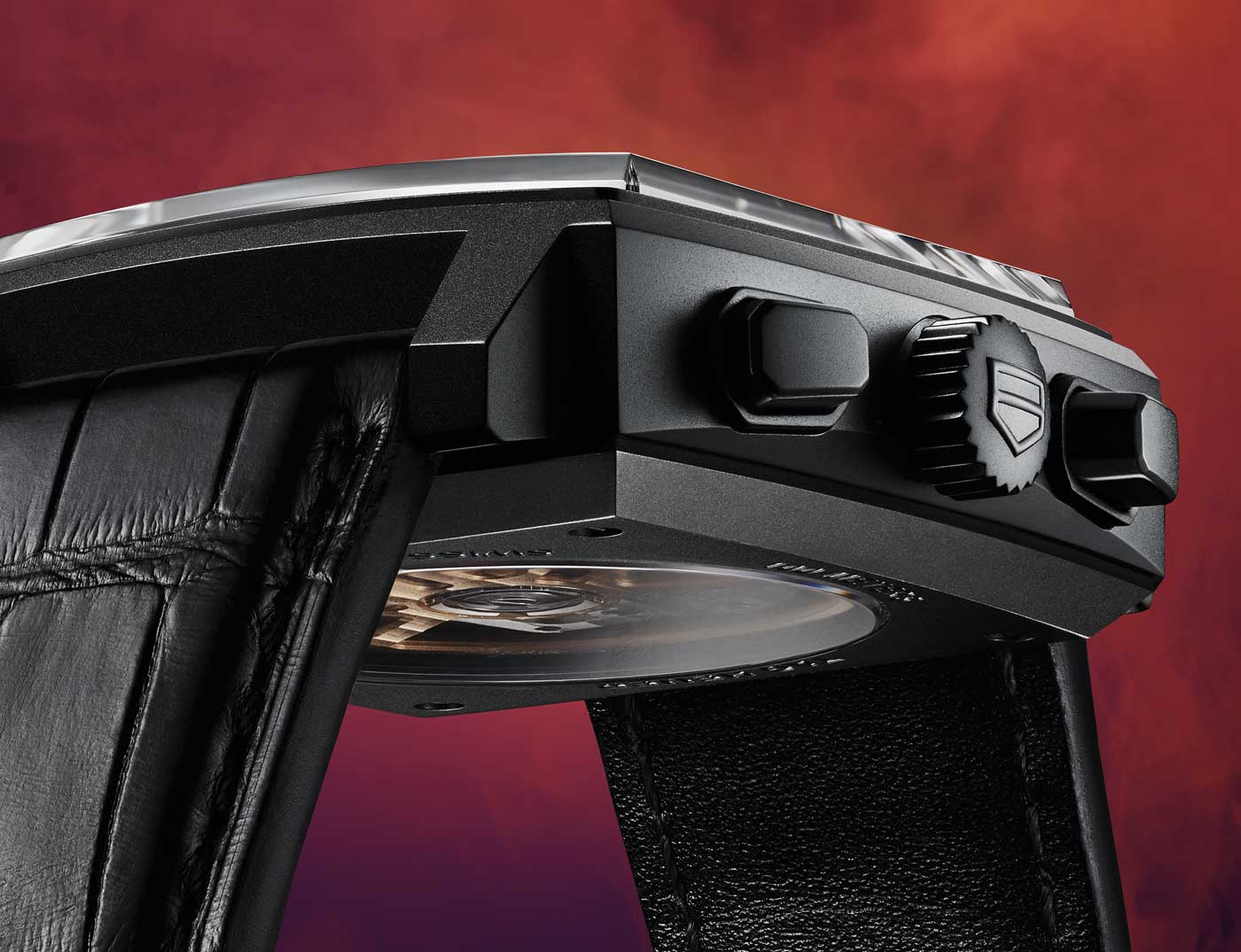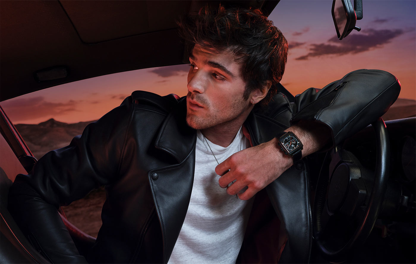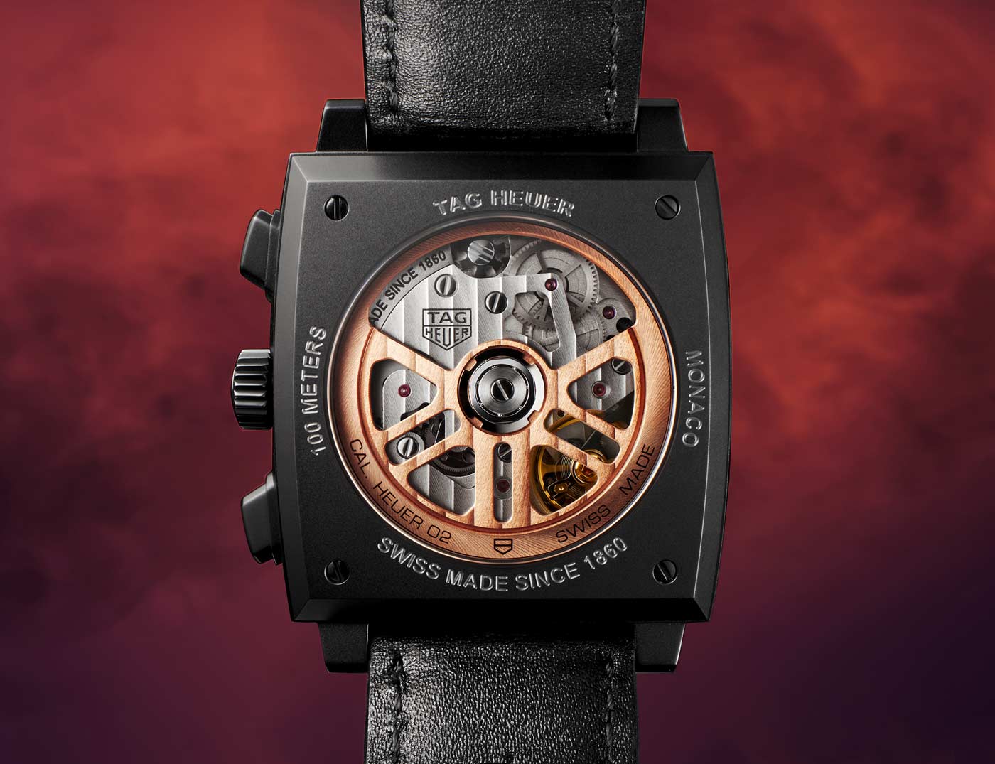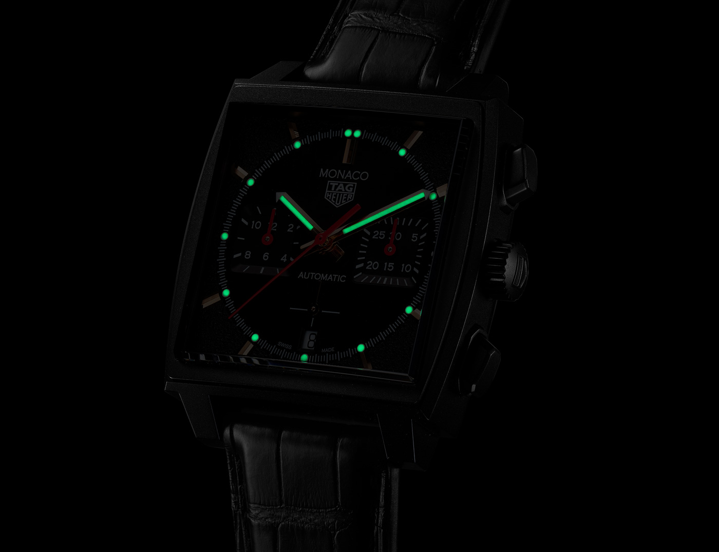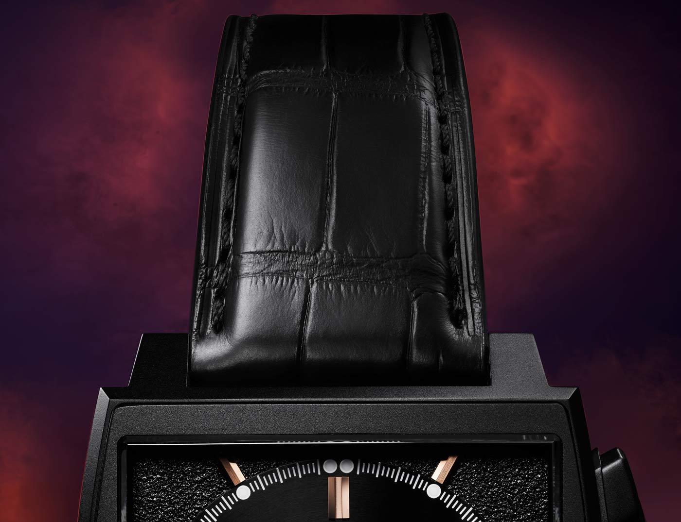 With just a few days to go before the 2022 Monaco Grand Prix, TAG Heuer introduces an all black edition of the principalities namesake chronograph. Made of black-coated titanium, this year’s Monaco Special Edition channels a version of the watch released in the late 1970s – with a matte black dial and case – nicknamed ‘Dark Lord’ by collectors and enthusiasts. The diamond-like carbon coatings on the 39-mm case is sandblasted to produced a grained finish. This is only the second titanium version of the Monaco, and the first made of DLC-coated titanium. Advances in coatings now allow DLC to be used not only on the case, but also on the crown, pushers and case-back. The deep black dial sets off rose gold markers, hour and minute hands, as well as the rich red chronograph and seconds hands. The sandblasted outer dial creates a grained finish reminiscent of the grip on F1 tracks. Inside, the Heuer 02 movement produces an 80-hour power reserve. Finished with a rose gold-plated oscillating mass, the movement is visible through the sapphire case-back.