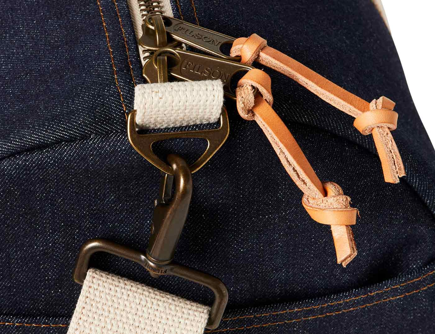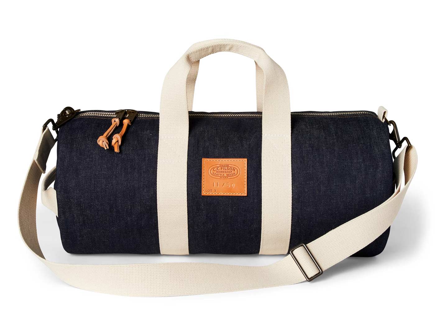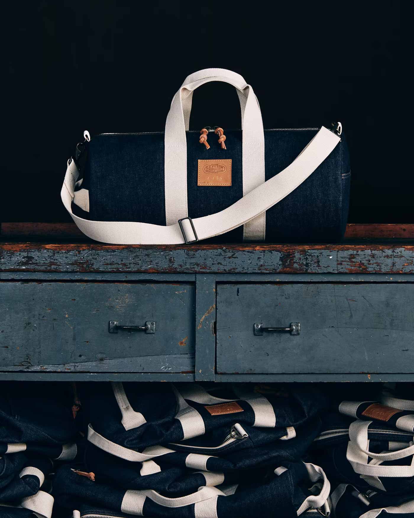 Filson Workshop put together a limited-run of duffle bags made with 14.5-oz. deadstock denim from the Cone Mills White Oak plant in Greensboro, North Carolina. Each bag is lined with organic cotton canvas and includes a detachable denim pocket inside. The 2″ wide cotton webbing straps wrap completely around the bag for extra strength and support. The rust proof solid brass hardware and heavy-gauge zipper are custom made by YKK. Available in a limited edition of 50 bags, individually numbered on a thick harness leather patch.