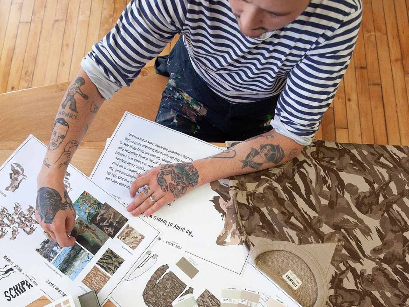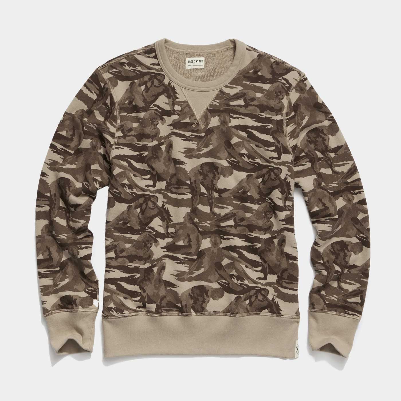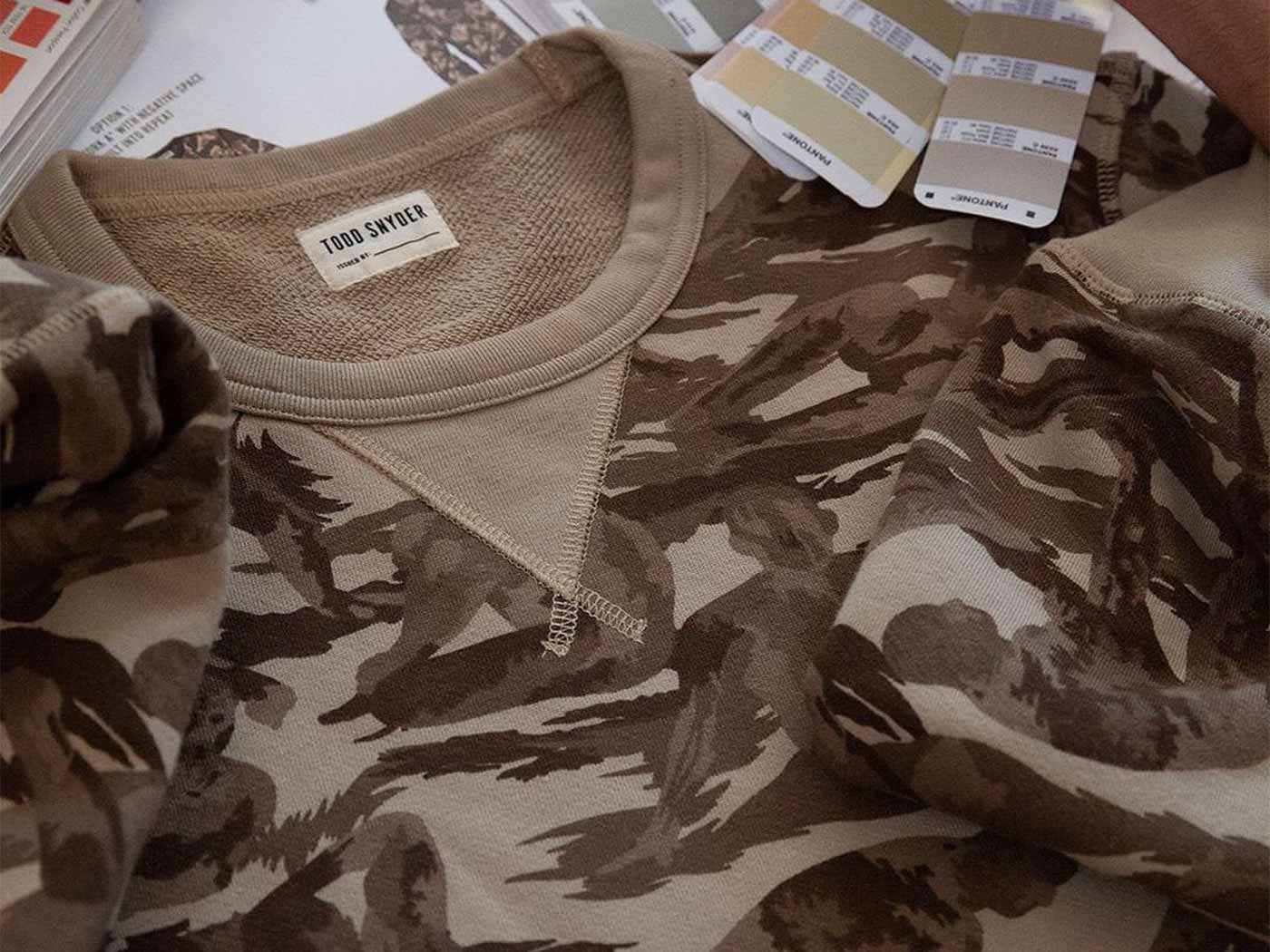 Todd Snyder used his latest Art of Pride collaboration to spotlight the work of Xavier Schipani, an influential painter and illustrator known for his focus on the ‘construct of gender’ and the trans-male nude. Together they created a limited-edition French terry sweatshirt featuring an original camouflage pattern design Xavier exclusively for Todd Snyder. The print is a composite of nude, trans-masculine figures in shades of brown and beige inspired the bark of American sycamore trees in Xavier’s hometown of Austin, TX. 100% of the purchase price of the Xavier Schipani + Todd Snyder Art of Pride Crewneck Sweatshirt will be donated to support VISUAL AIDS, a non-profit utilizing art to fight AIDS and support HIV+ artists.