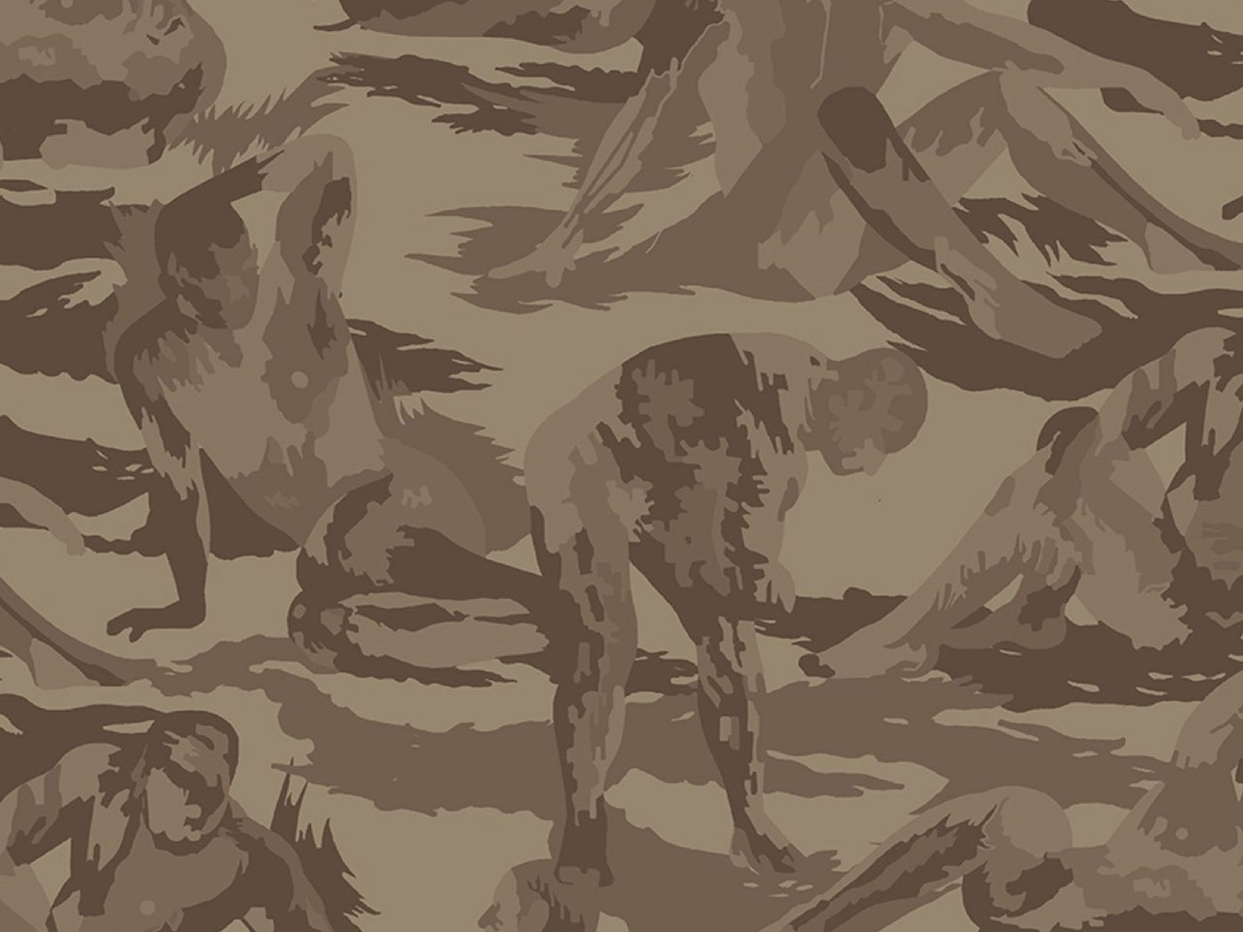 “I was thinking about how camouflage is both a way to conceal a body as well as a pattern associated with masculinity and strength… I wanted to create a camo pattern out of bodies–transmasculine bodies which aren’t seen in popular culture much.”