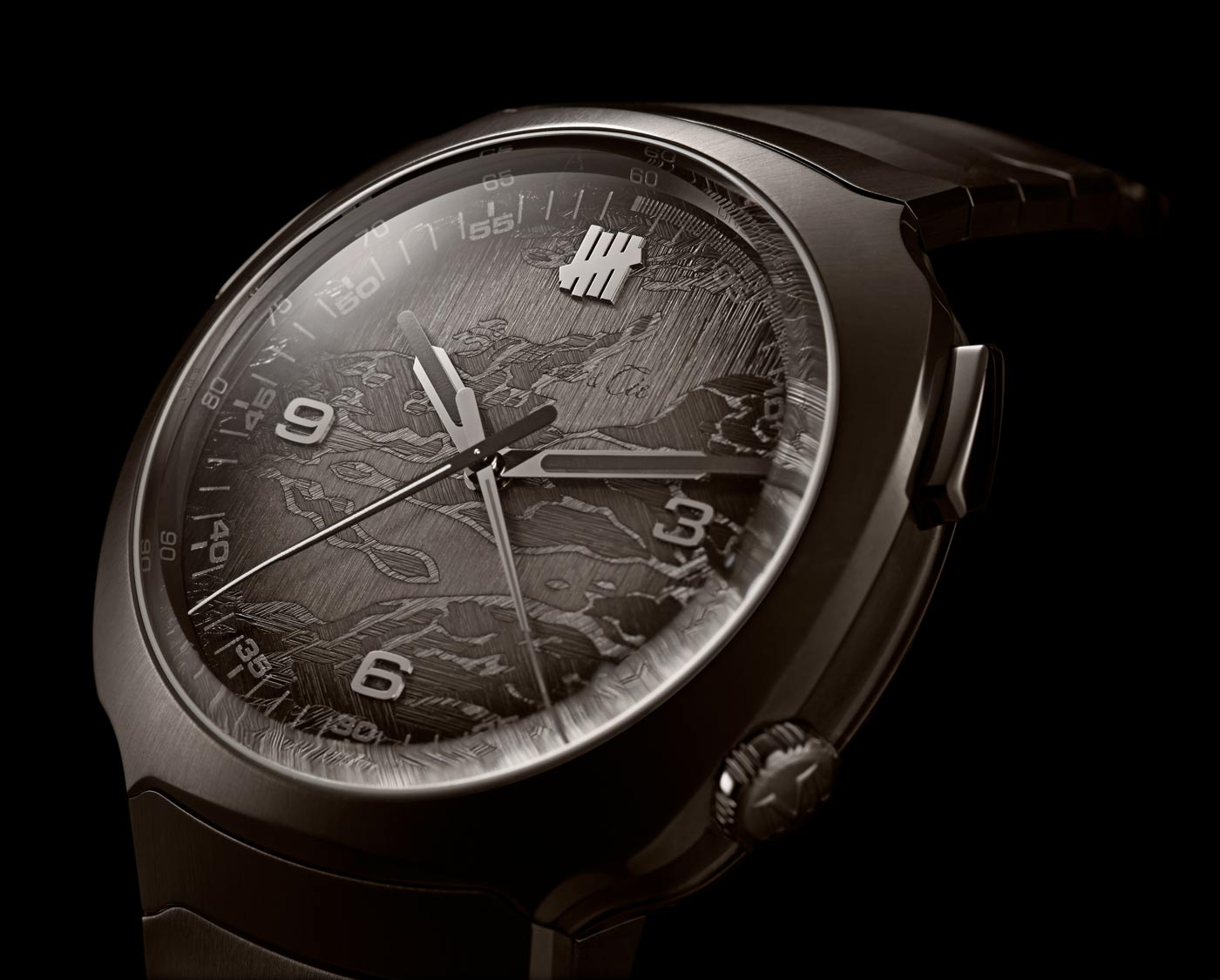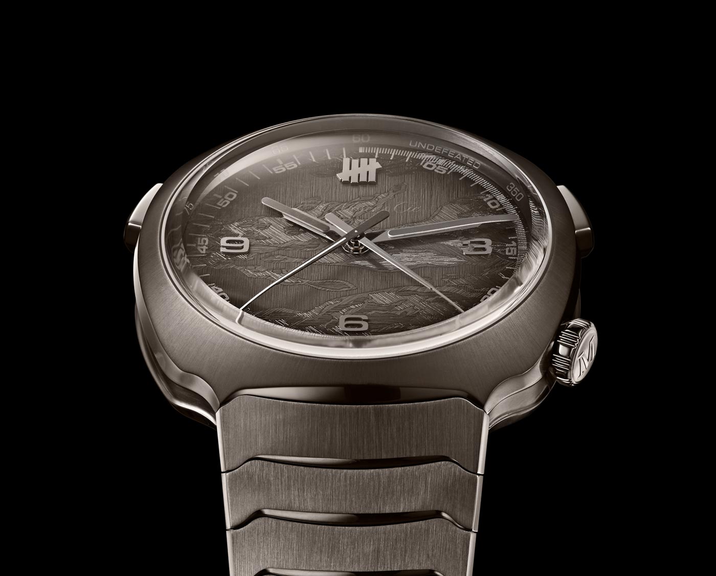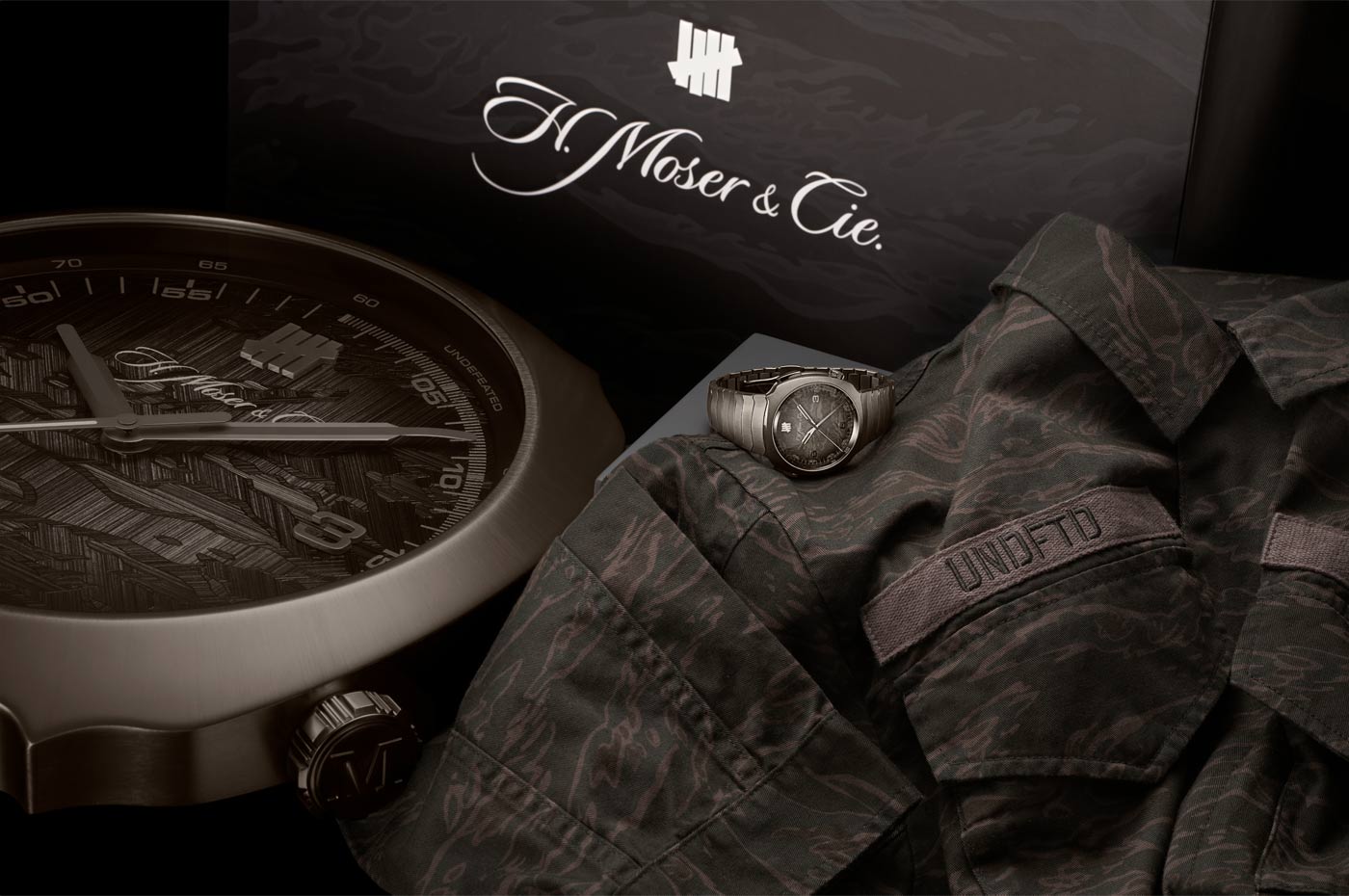 UNDEFEATED teamed up with H. Moser & Cie. to create a special edition of the Streamliner Chronograph. The idea for the collaboration came from Eric Cheng, one of UNDEFEATED’s co-owners and a keen collector of H. Moser watches. Limited to 76 pieces, the Streamliner Chronograph UNDEFEATED features a DLC coated 42.3 mm steel case and integrated bracelet. Cheng request the DLC coating, a first for the this model, to give each watch a distinct patina as it ages. The black tiger camo pattern engraved on the dial – a favorite of UNDEFEATED – is also exclusive to this model. H. Moser used several layers of lacquer to create the tonal grey before applying its signature fumé finish. Around the edge of the dial, the outer track measures the seconds, while the inner track counts the minutes. The UNDEFEATED logo at 12 o’clock provides a counterpoint to the applique numerals at 3, 6 and 9 o’clock. The three-dimensional curved hands used to indicate the hours and minutes are another collaborative design. Formed from two sections, the longer insert is made from grey Globolight – an innovative ceramic-based material which contains Super-LumiNova.