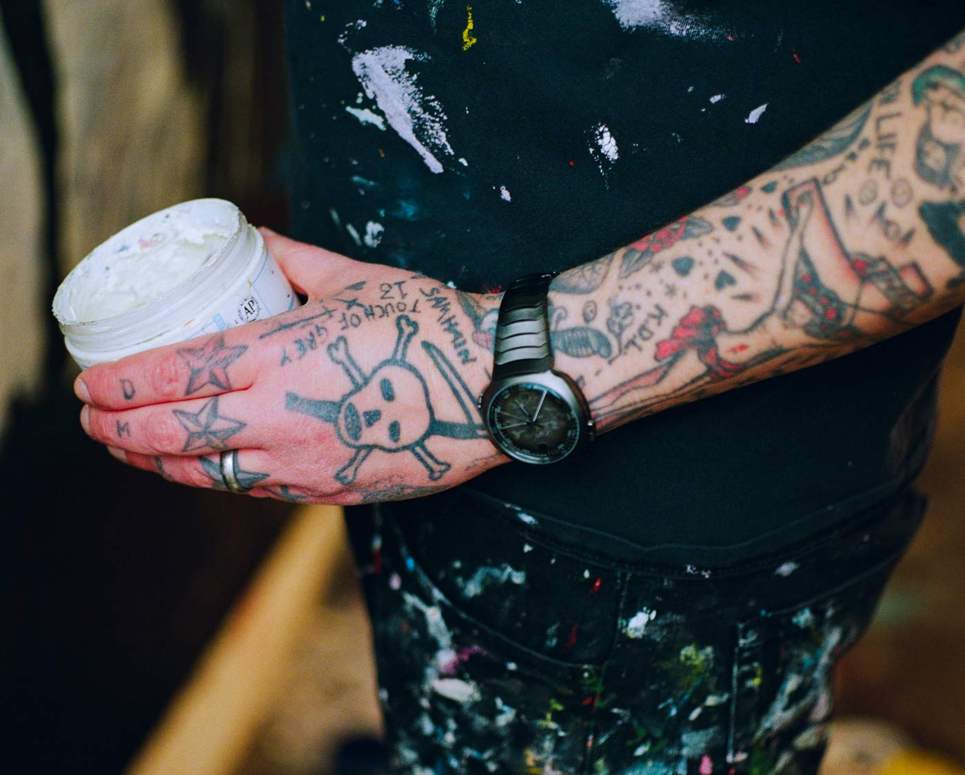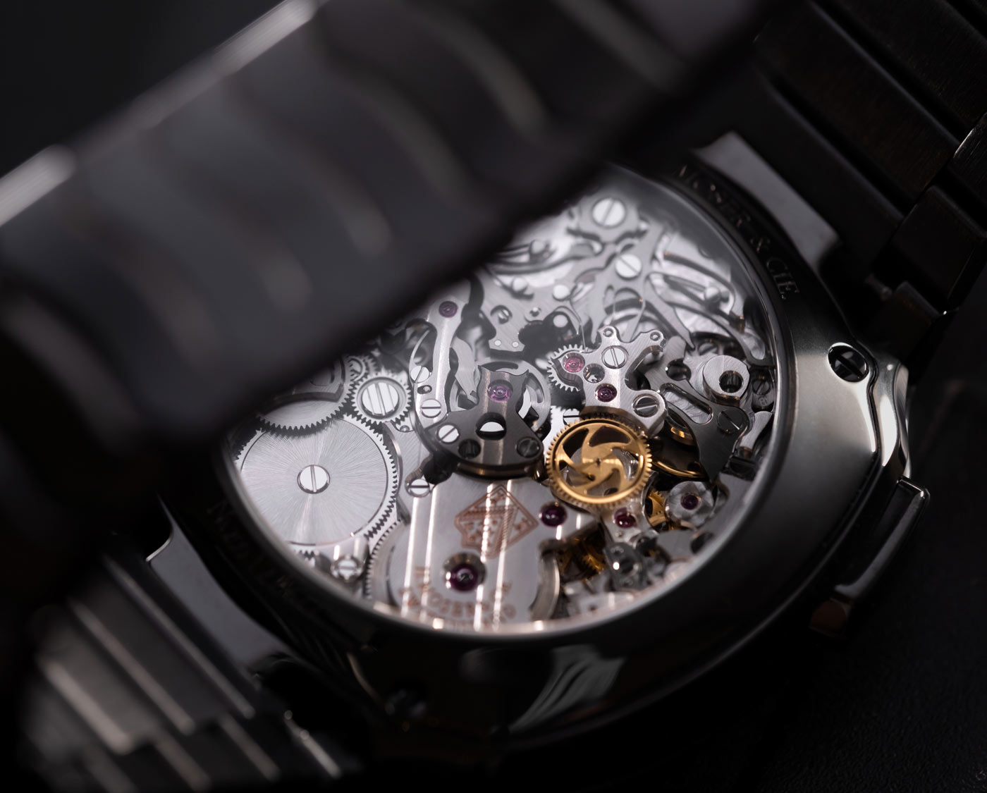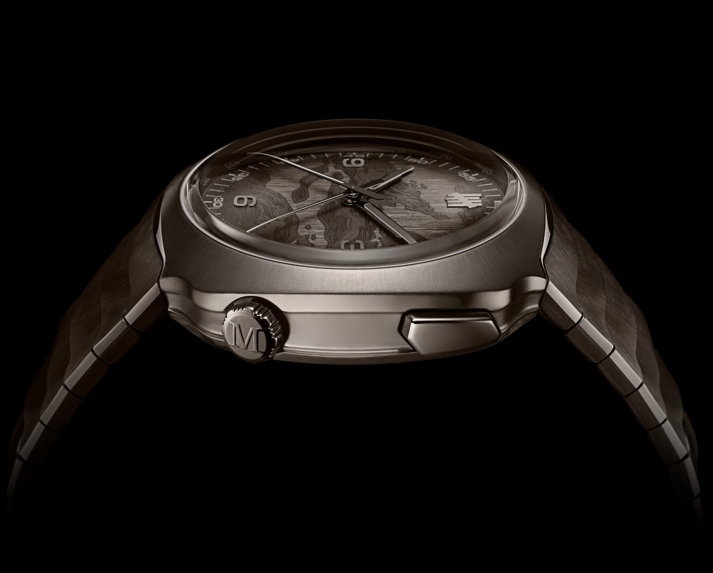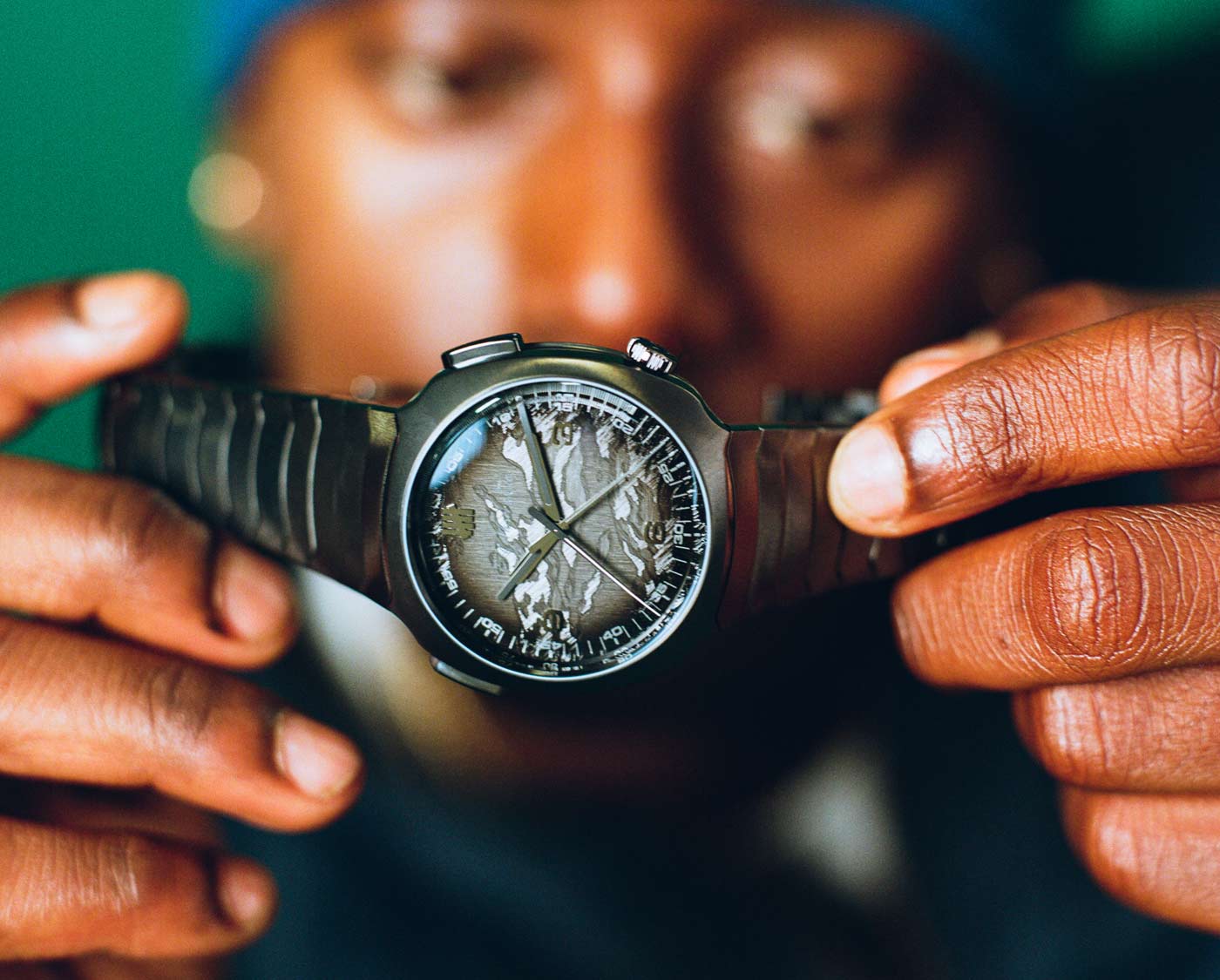 UNDEFEATED teamed up with H. Moser & Cie. to create a special edition of the Streamliner Chronograph. The idea for the collaboration came from Eric Cheng, one of UNDEFEATED’s co-owners and a keen collector of H. Moser watches. Limited to 76 pieces, the Streamliner Chronograph UNDEFEATED features a DLC coated 42.3 mm steel case and integrated bracelet. Cheng request the DLC coating, a first for the this model, to give each watch a distinct patina as it ages. The black tiger camo pattern engraved on the dial – a favorite of UNDEFEATED – is also exclusive to this model. H. Moser used several layers of lacquer to create the tonal grey before applying its signature fumé finish. Around the edge of the dial, the outer track measures the seconds, while the inner track counts the minutes. The UNDEFEATED logo at 12 o’clock provides a counterpoint to the applique numerals at 3, 6 and 9 o’clock. The three-dimensional curved hands used to indicate the hours and minutes are another collaborative design. Formed from two sections, the longer insert is made from grey Globolight – an innovative ceramic-based material which contains Super-LumiNova.