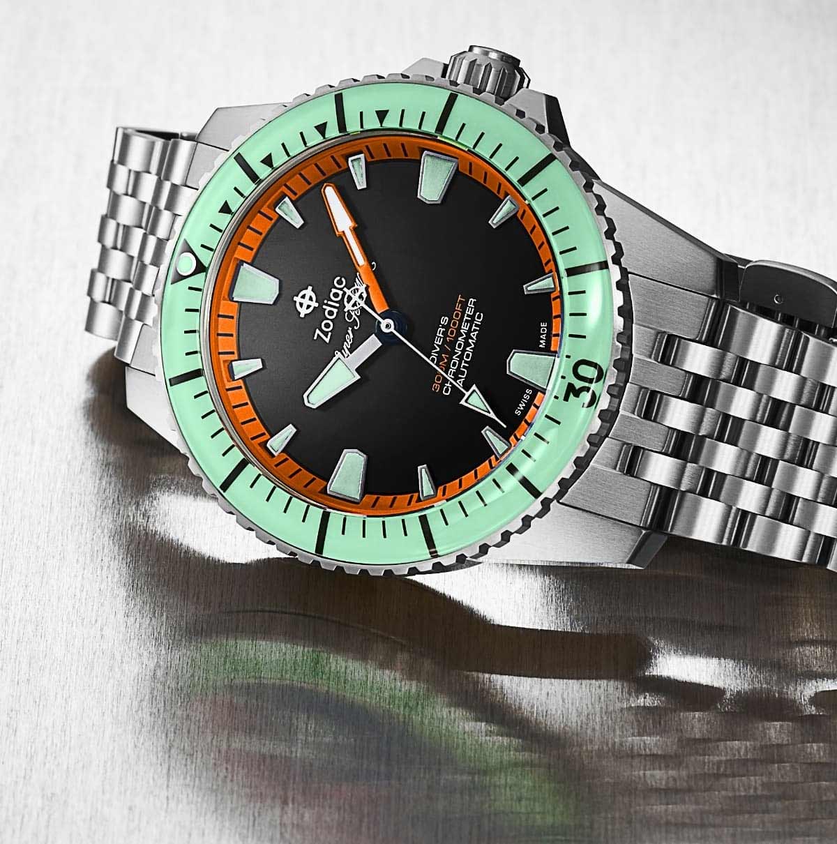 Diving watch enthusiasts will find a lot to like about Zodiac’s latest Super Sea Wolf. Made of lightweight titanium, the ISO-certified diver has a 42mm case crowned with a photo-luminescent green bezel bright enough to ensure visibility in low-light. The same vibrant green lum repeats on the hour hand, second hand and indices, and pops out against the black dial. The orange minute hand matches the minute ring on the outer edge of the dial. Mounted on titanium link bracelet, the limited edition watch comes with an additional canvas strap.