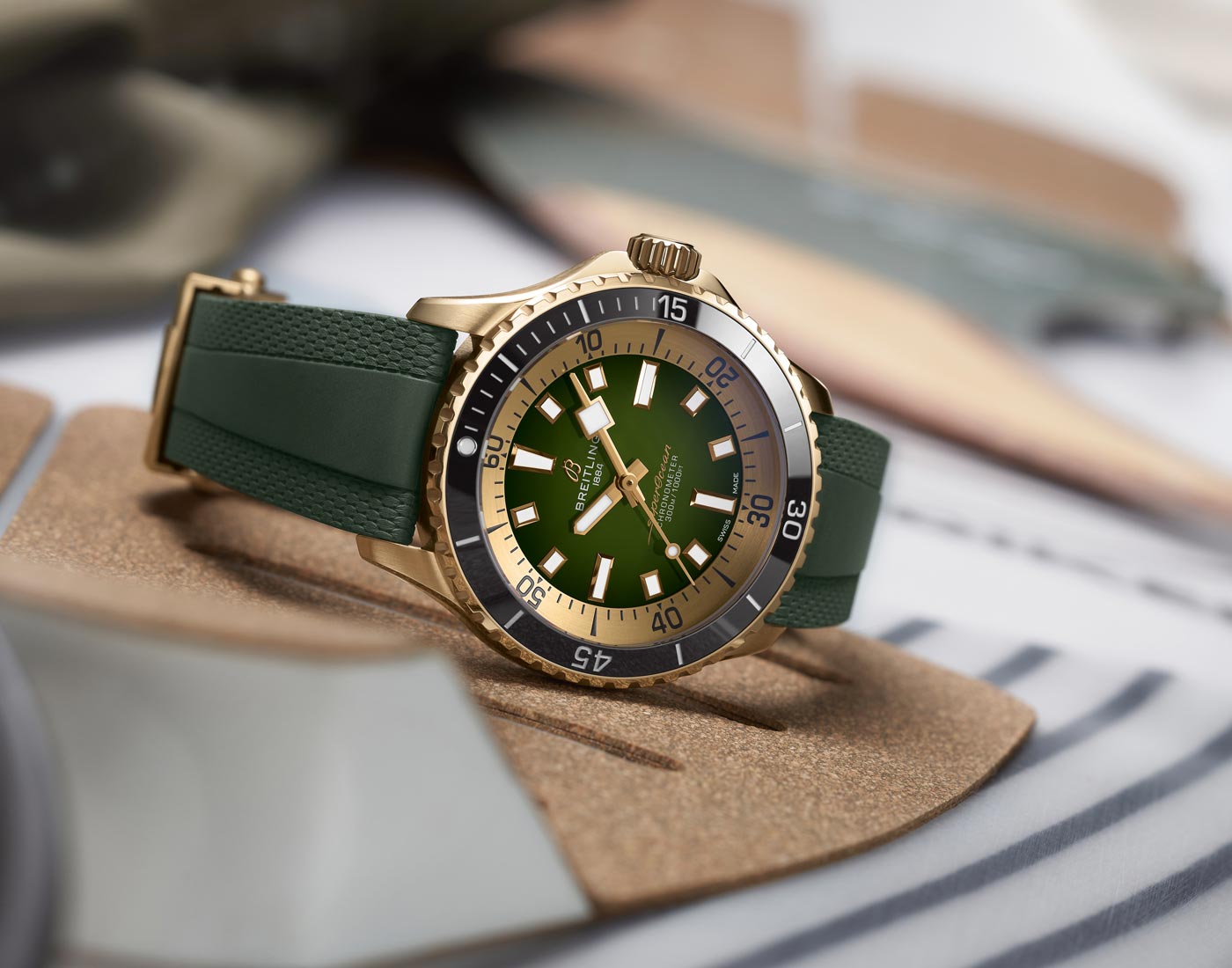The Superocean now comes in four sizes (46, 44, 42, and 36 mm) and three different case metals – steel, steel-gold, and bronze. Breitling brought back the Slow Motion’s distinctive square minute hand and high-contrast minute scale. Super-LumiNova coating on the hands and indexes allow for exceptional readability underwater. The bezel is unidirectional on most sizes and bidirectional with a patented lock on the 46 mm model. Water-resistant to 300m/1000 ft, all models are powered by Breitling’s Caliber 17 automatic movement with a 38-hour power reserve.