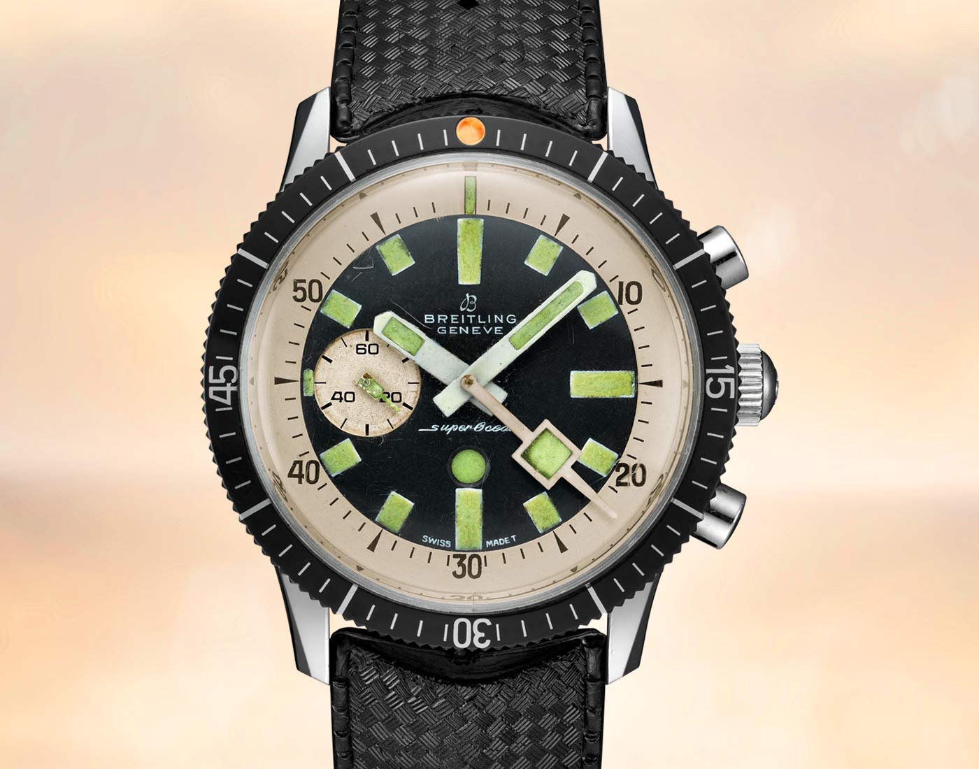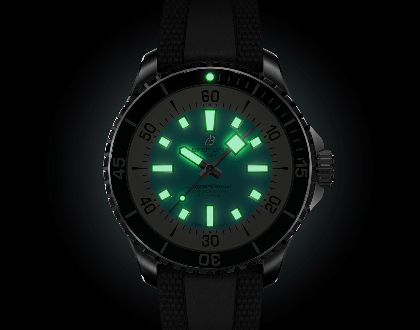 Breitling went back to the start when redesigning the Superocean diver. The new collection evokes the pared-down aesthetic of the SuperOcean Slow Motion from the 1960s and 1970s. Created as a tool-watch for scuba divers, this early Superocean was stripped of all unnecessary features. The seconds hand was eliminated because divers measure time almost exclusively in minutes. In its place was a minutes-based chronograph, dubbed the Slow Motion because it took an hour to make a full rotation of the dial. A high-contrast dial ring was introduced to the minutes scale, and easy to read chunky luminescent batons replaced the subtle indexes.