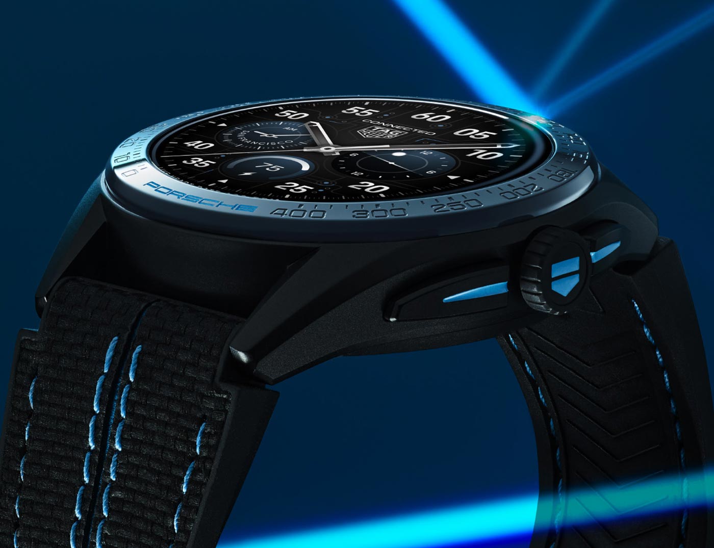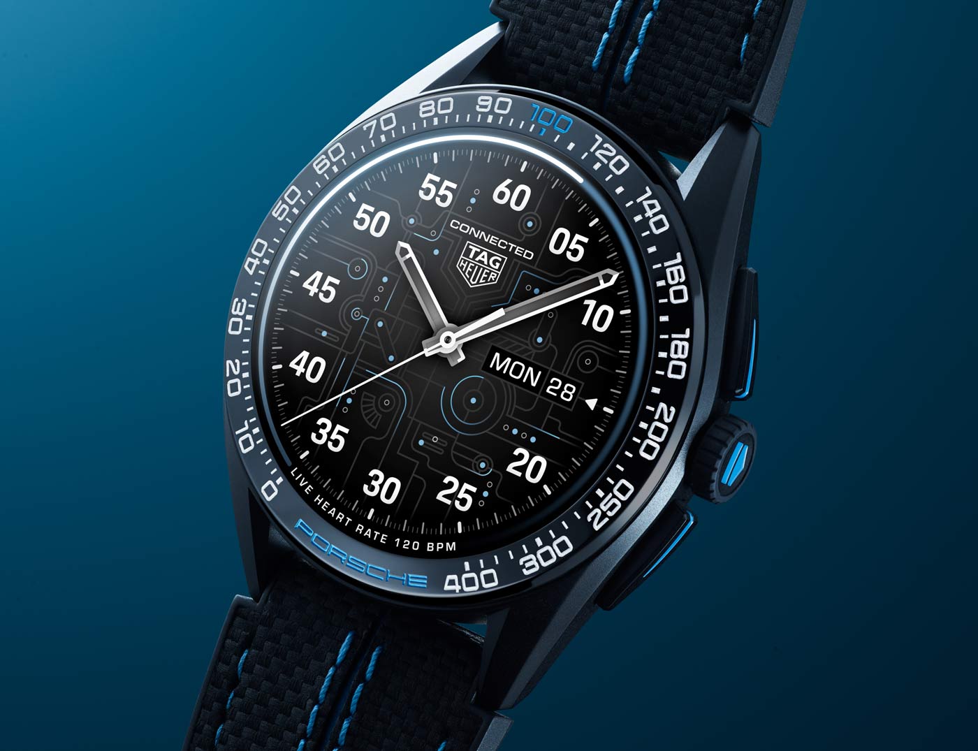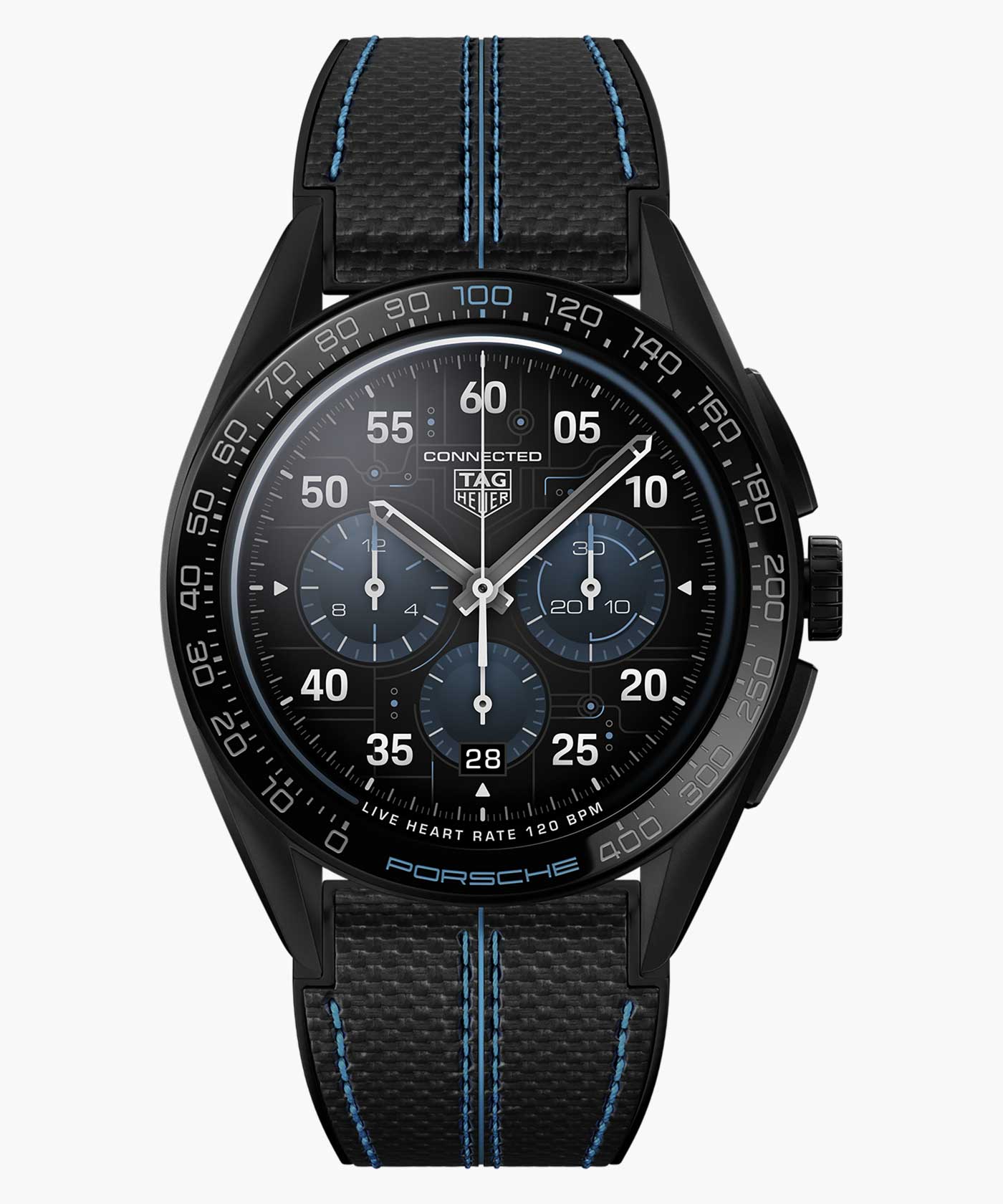 Porsche’s all-electric Taycan collection inspired TAG Heuer’s latest smartwatch. The TAG Heuer Connected Calibre E4 Porsche Edition comes with the new Circuit watch face, an exclusive design only available to owners of the watch. Running a customized version of Google’s Wear OS system, the dial’s ‘frozen blue’ highlights echo the lines of printed circuit boards. This animated display offers information – such as car battery percentage and total mileage – for compatible Porsche models directly on the watch face. The customized Wear OS can also control the cars air conditioning and heating through the My Porsche app. Built from grade 2 titanium with a black DLC coating, the 45mm case sports a black ceramic bezel with blue and grey accents, and a special Porsche engraving on the case-back.
