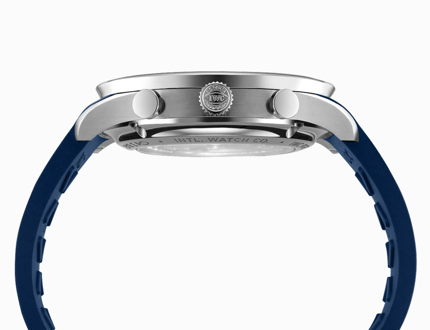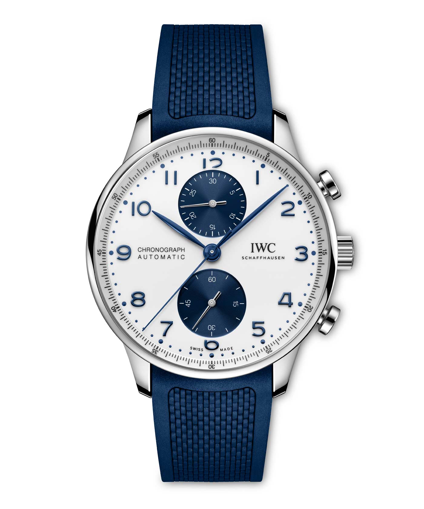 IWC Schaffhausen just introduced new versions of the Portugieser Automatic and the Portugieser Chronograph with blue and white ‘panda’ dials. Both watches feature lacquered white dials with azurage blue subdials, a railway-track style chapter ring, blue Arabic numerals, and blued feuille hands, fitted in stainless steel cases. Frequently featured in IWC’s Portugieser collection, the high-contrast panda dial improves legibility and makes for a distinctive appearance. The 42.3-mm Automatic ($13,100.00) is powered by the in-house 52010 calibre with a 7 day power reserve and fitted with a blue alligator strap. While the 41.0-mm Chronograph ($8,400.00) features the IWC-manufactured 69355 calibre chronograph movement and a blue rubber strap. Both movements are visible through sapphire glass case backs.