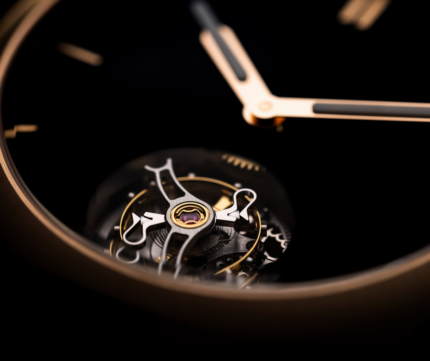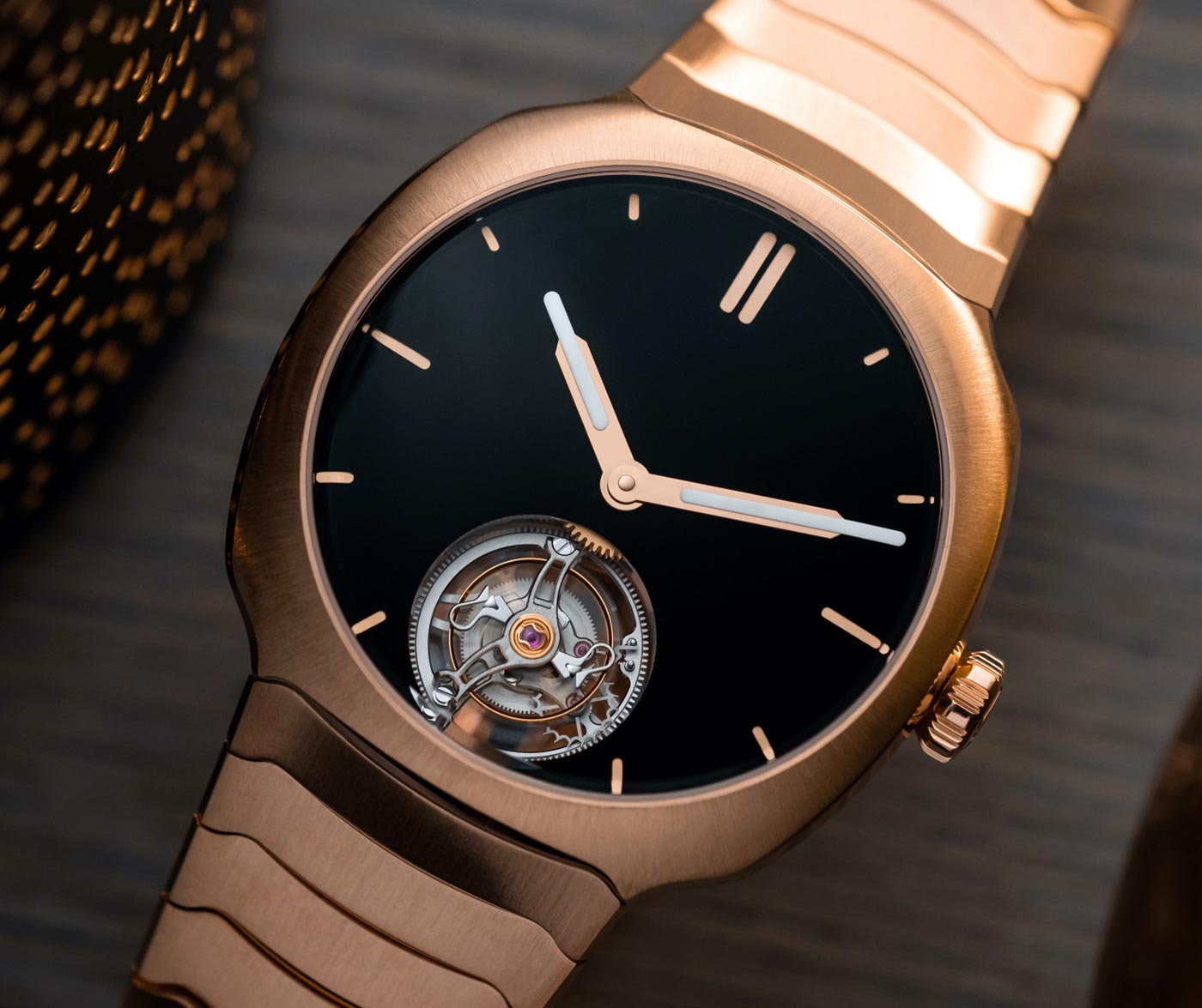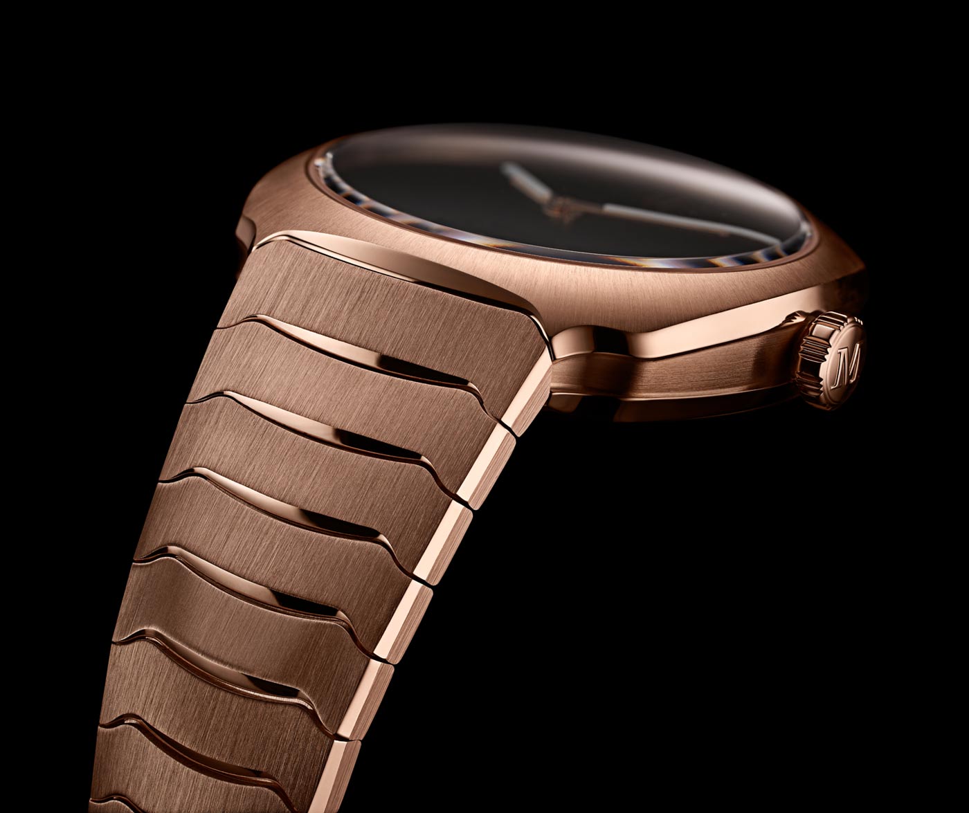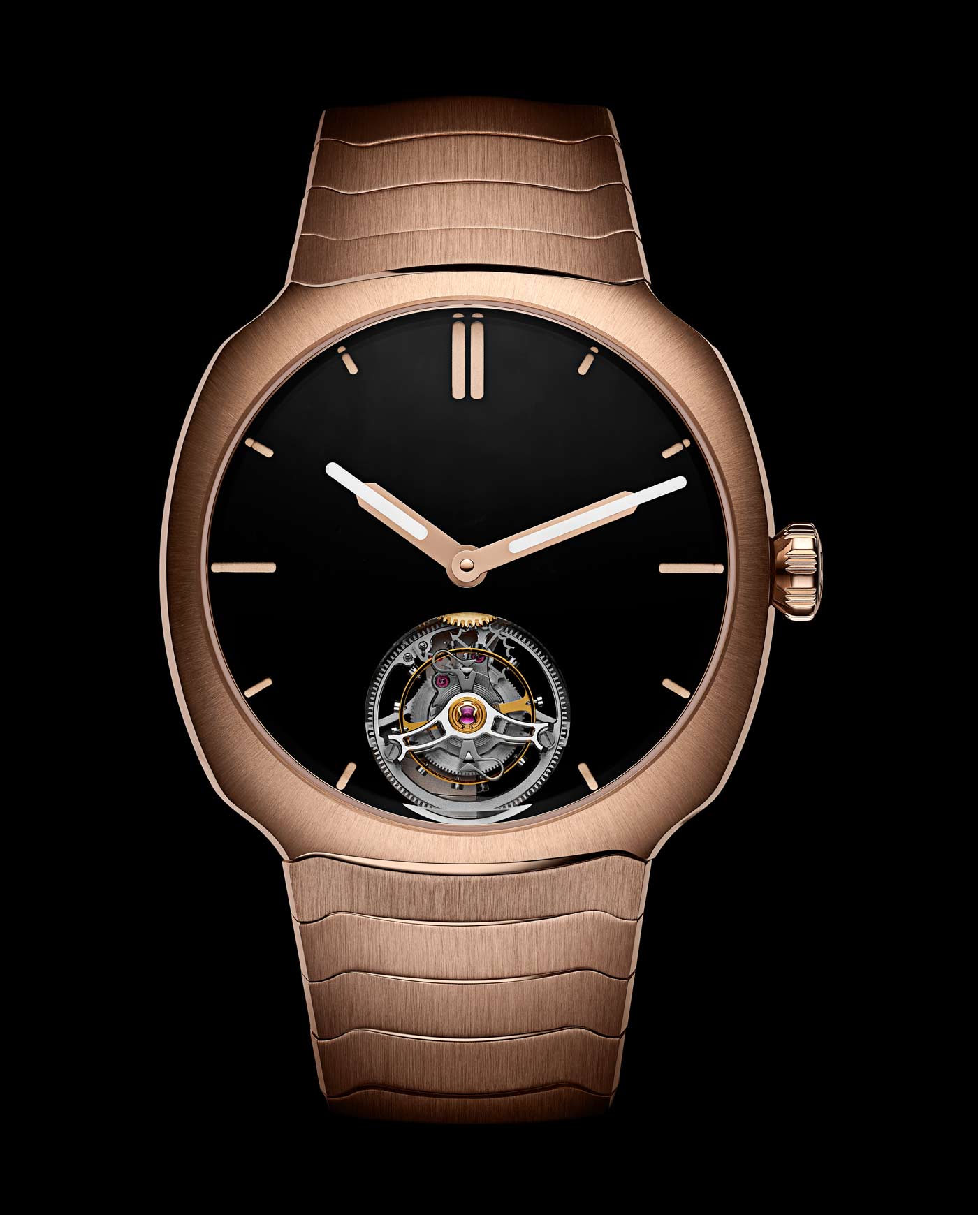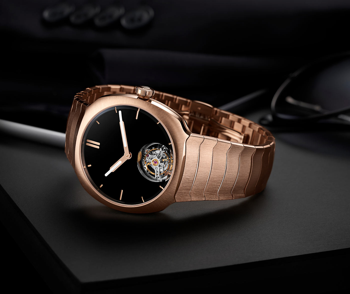 H. Moser & Cie. breaks new ground with the latest version of the Streamliner sports watch. This is the first Streamliner Tourbillon in 18-karat red gold, the first with an integrated gold bracelet and the first with a Vantablack dial – and the first dial with this super black coating to incorporate full-sized indexes. H. Moser attached the gold indices from the back of the dial to maintain the integrity of the Vantablack. So, depending on the angle, they appear to disappear into the striking, blacker than black surface. The dial also boasts an open aperture at 6 o’clock for the one-minute flying tourbillon. The HMC 804 calibre is an automatic tourbillon movement which counteracts the effects of gravity and produces a 72 hour power reserve.