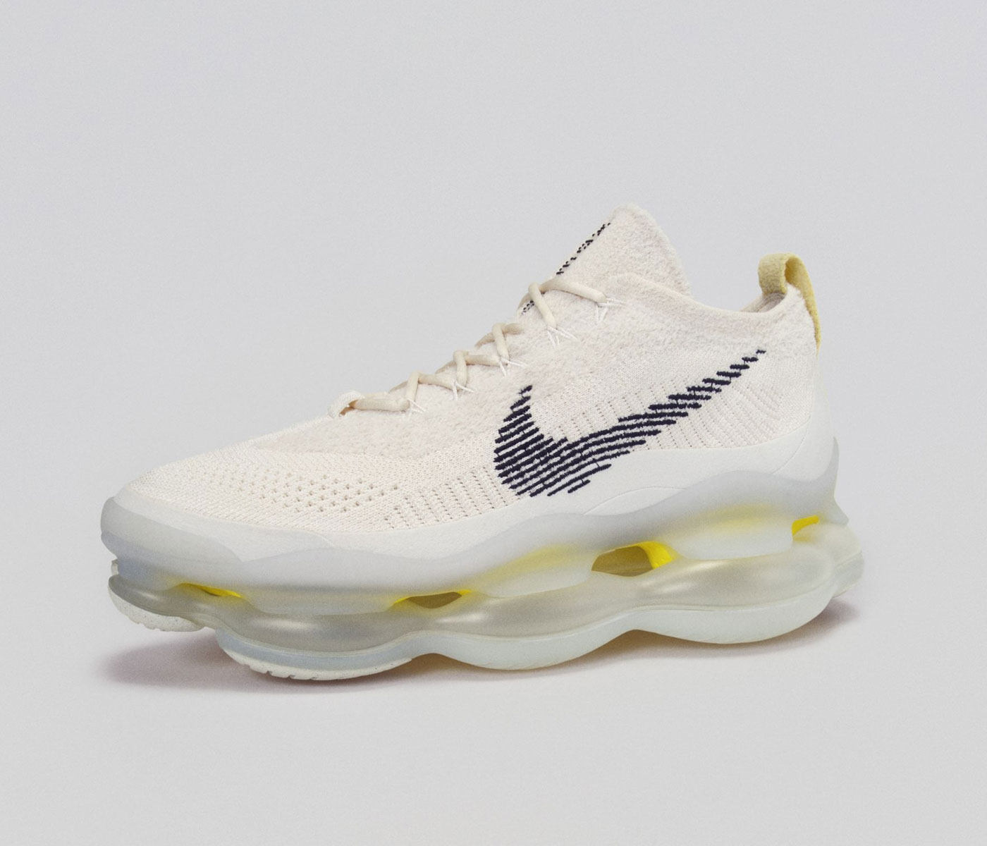 The Air Max Scorpion is one of the first Nike sneaker designs created entirely during the pandemic. New VR software and simulation tools, combined with decades of vertical manufacturing expertise, facilitated a condensed development timeline and reduced the need for, and environmental impact of, physical samples. Working virtually with these tools, Nike designers came up with a radical system of Air units using complex geometries that incorporate morphology data and pressure maps from Nike’s Sports Research Lab. The result is the most Air yet – in terms of pounds per square inch. The Scorpion’s airbag system produces a piston-like effect through strategically determined contact points between the foot and the airbag. A first-of-its-kind Flyknit chenille upper has short fibers held perpendicularly in place by two twisted vertical yarns to form a soft pile texture that balances the new Air system. The Air Max Scorpion is made with twenty-percent recycled content by weight.