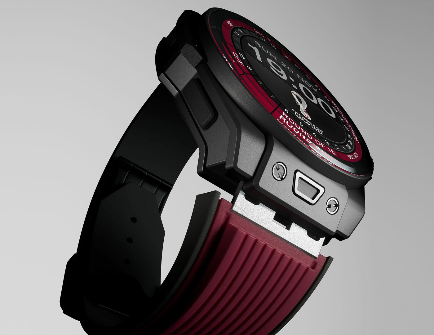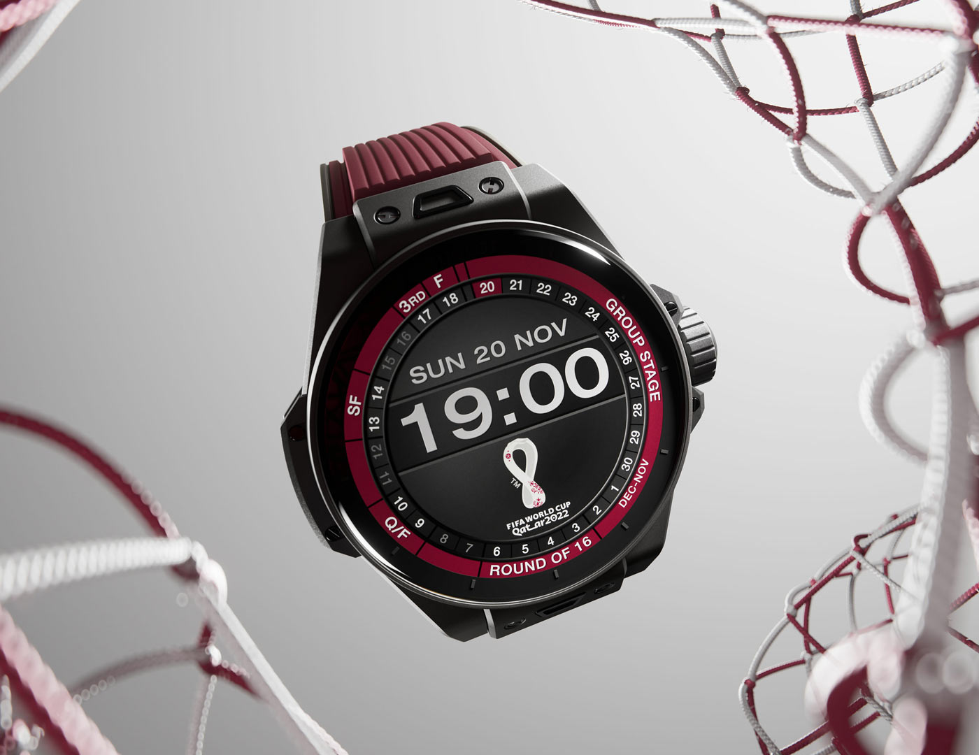 Made in Switzerland from polished black ceramic and black titanium, the 44-mm case blends mechanical watchmaking techniques and high-end electronics. The watch’s hardware specification includes an accelerometer, a gyroscope, a microphone, a speaker, a GPS monitor and a heart-rate monitor. The official version has a burgundy and black colorway inspired by the flag of Qatar. Fans will also be able to choose dial and strap designs in the colors of each of the 32 participating countries.