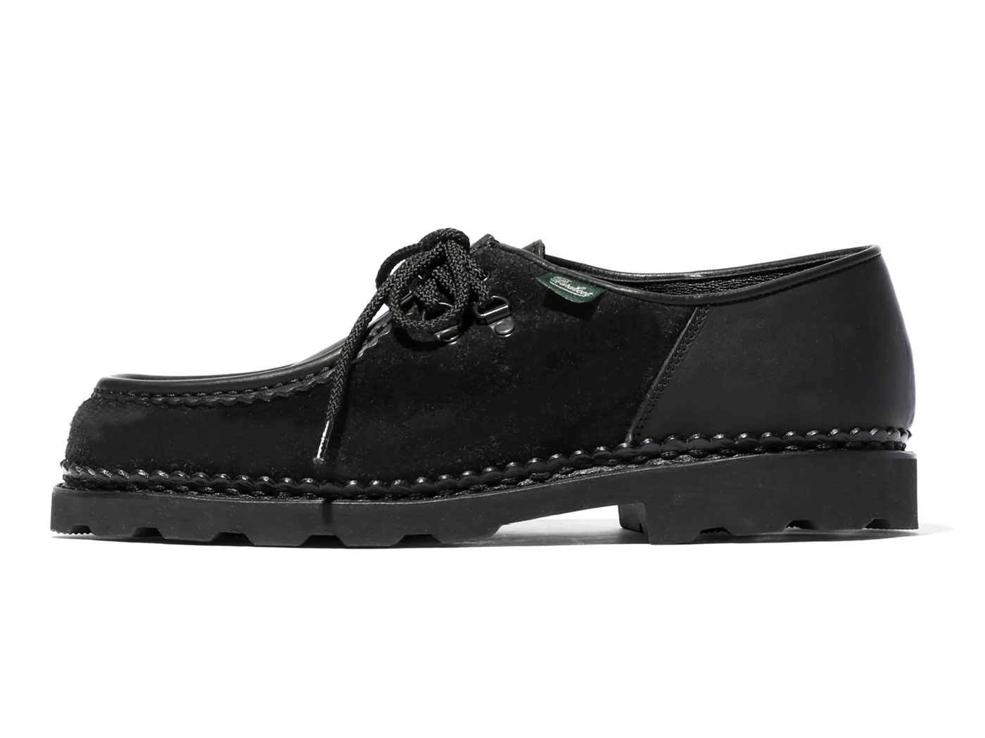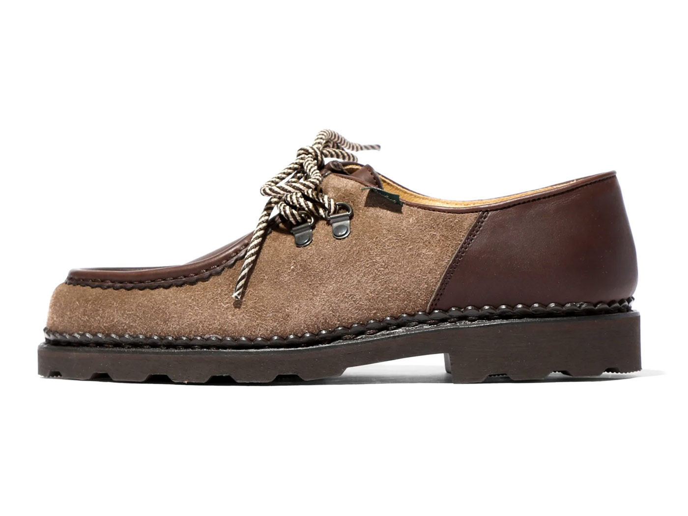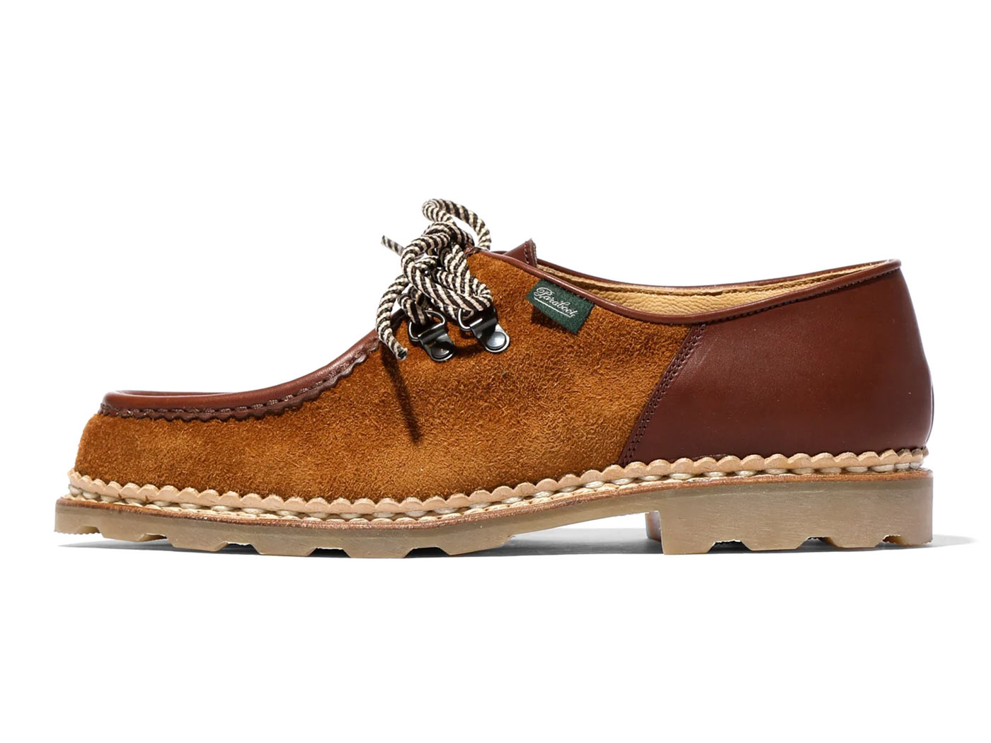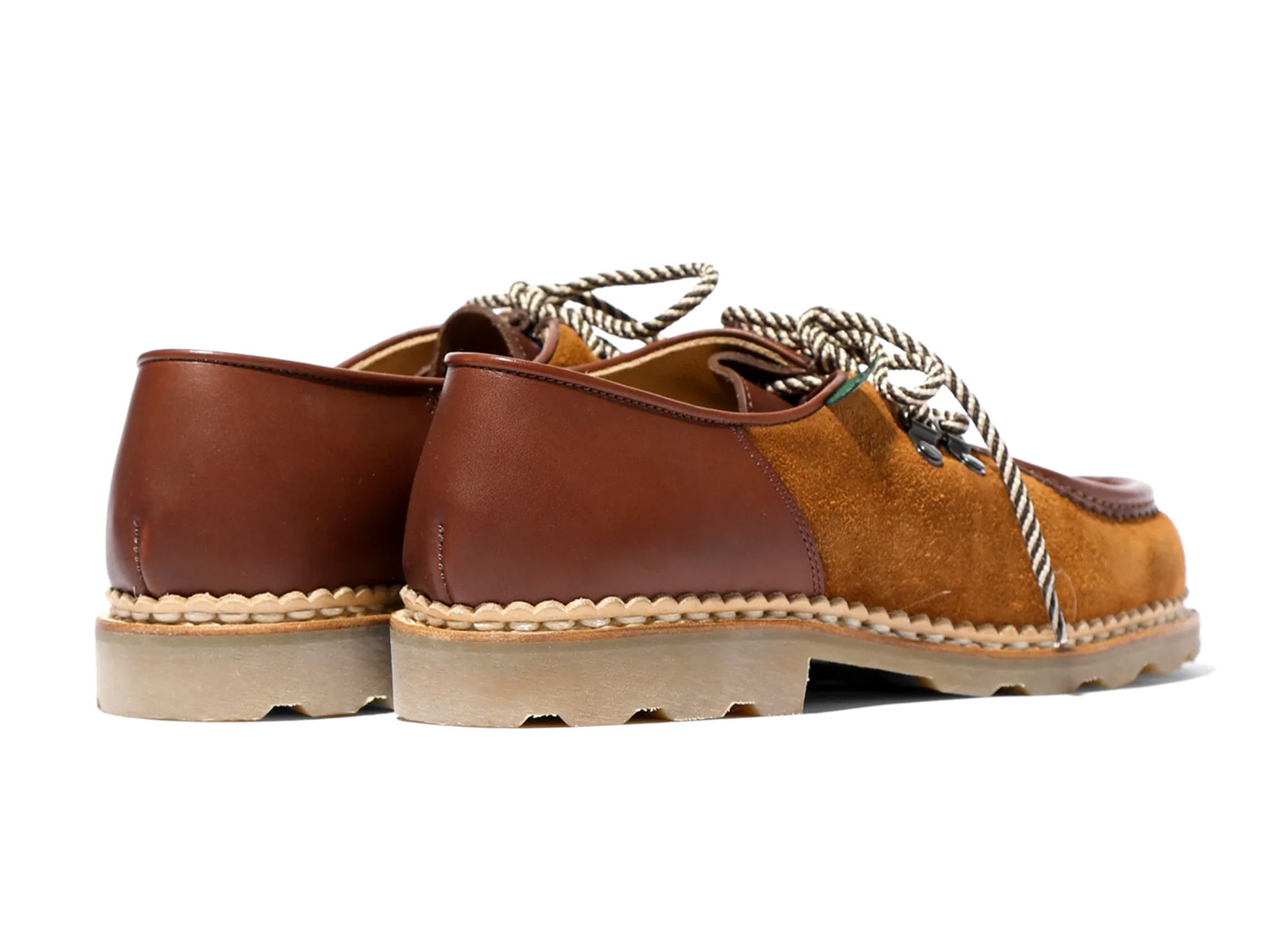 Engineered Garments designer Daiki Suzuki teamed up with Paraboot to create an exclusive version of the Michael. The family-owned shoemaker began making this derby style in 1945 and it has proven to be a timeless classic. For the collaboration Daiki leans into Paraboot’s Alpine and workwear roots. The Engineered Garments x Paraboot Michael features smooth leather vamps and heel caps with hairy suede quarters. Inspired by vintage Galibier mountain boots, Daiki replaced two of the three eyelets with D-rings and added thick retro laces. Set on chunky rubber soles, the shoe’s piped seams and Norwegian welt are handsewn with zig-zag stitching. Each pair is handcrafted at Paraboot’s factory in Saint-Jean-de-Moirans, at the foot of the French Alps. Available in Whiskey, Smokey and Black.