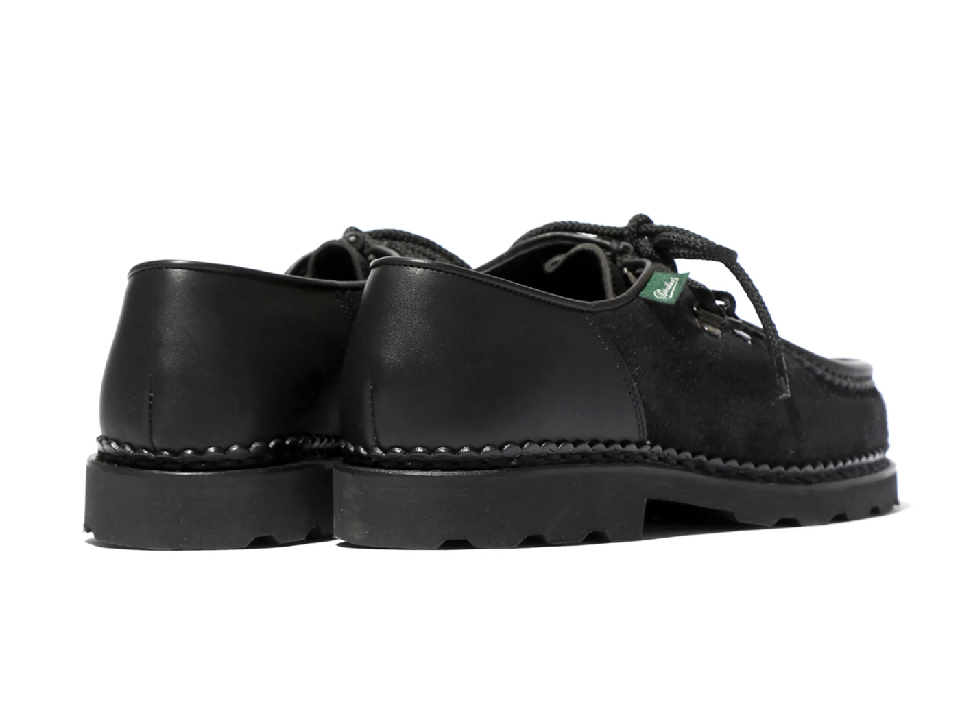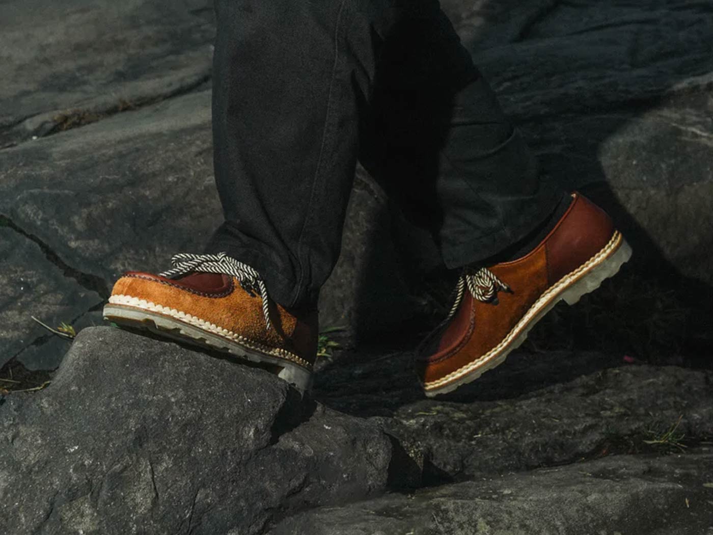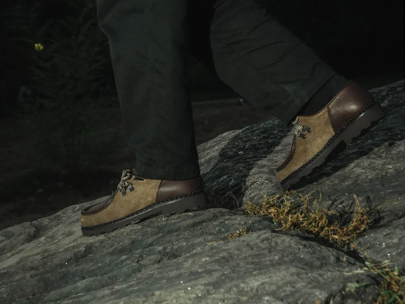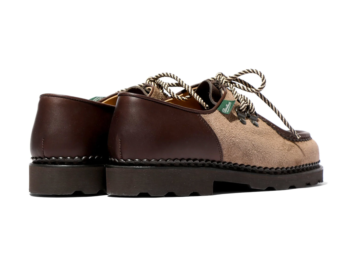 Engineered Garments designer Daiki Suzuki teamed up with Paraboot to create an exclusive version of the Michael. The family-owned shoemaker began making this derby style in 1945 and it has proven to be a timeless classic. For the collaboration Daiki leans into Paraboot’s Alpine and workwear roots. The Engineered Garments x Paraboot Michael features smooth leather vamps and heel caps with hairy suede quarters. Inspired by vintage Galibier mountain boots, Daiki replaced two of the three eyelets with D-rings and added thick retro laces. Set on chunky rubber soles, the shoe’s piped seams and Norwegian welt are handsewn with zig-zag stitching. Each pair is handcrafted at Paraboot’s factory in Saint-Jean-de-Moirans, at the foot of the French Alps. Available in Whiskey, Smokey and Black.