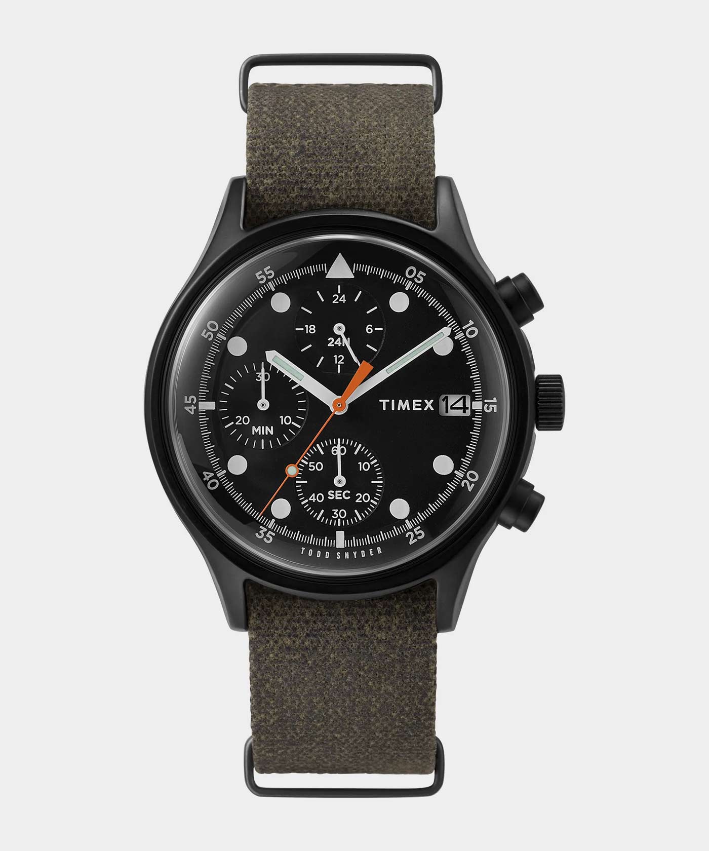 The latest installment in Todd Snyder’s long-running collaboration with Timex draws inspiration from the utilitarian, standard-issue field watches worn by American servicemen. Based on an archival style from the late 1960s, the Timex + Todd Snyder MK-1 Sky King is the menswear designer’s first take on a chronograph. The watch operates on a quartz movement with three sub-dials and is available in two colorways: black and blaze orange. One sub-dial tracks hours, another minutes, the third seconds. All three can be started, stopped and returned to zero by manipulating the stem. Encased in 42-mm steel case with a domed acrylic crystal, the watch also features luminescent hands and a date window at 3 o’clock. The olive canvas strap is made of recycled clothes, finished with a genuine leather lining.