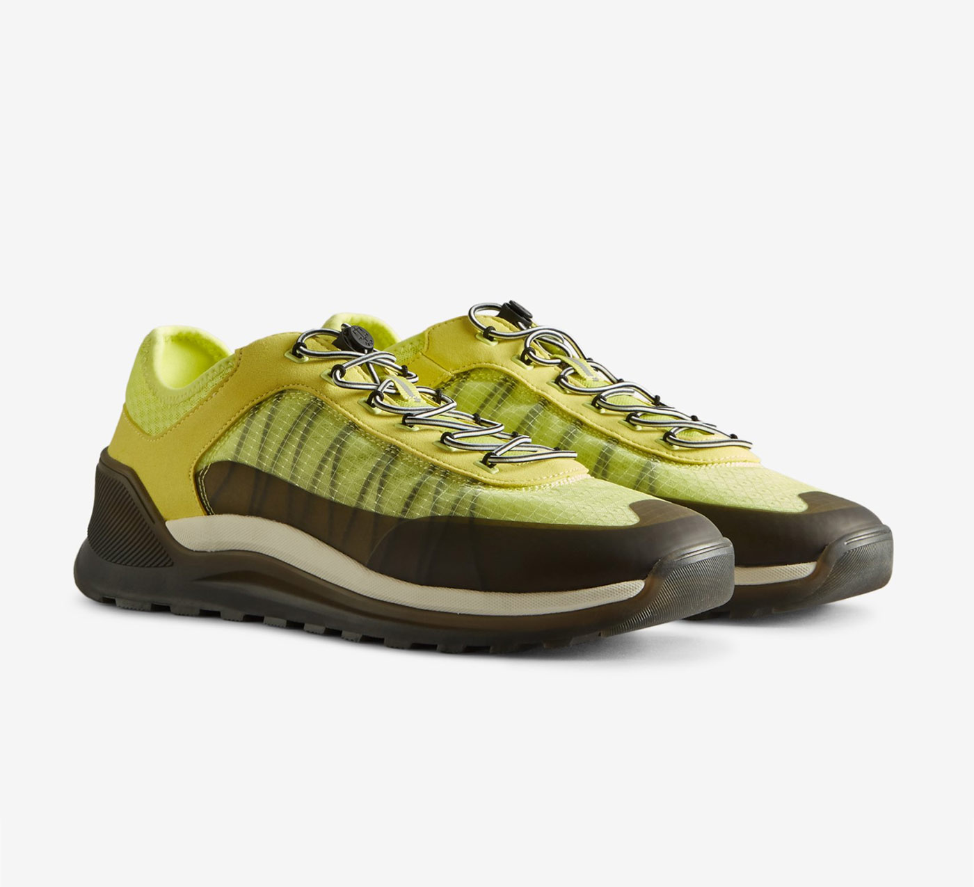 Hunter’s new Travel Sneaker is equally at home plodding around city streets or navigating off-road trails. The uppers are crafted from a breathable double layer of recycled nylon and mesh. Shock absorbent recycled EVA midsoles paired with recycled Ortholite insoles ensure comfort. Part trail runner, part wellie, the durable rubber outsole provides extra grip for all terrains while TPU rubber foxing adds an extra level of protection from the rain. Available in Zesty Yellow, Lichen Green and Black, the sneaker’s are delivered with branded elastic straps for compact packing.