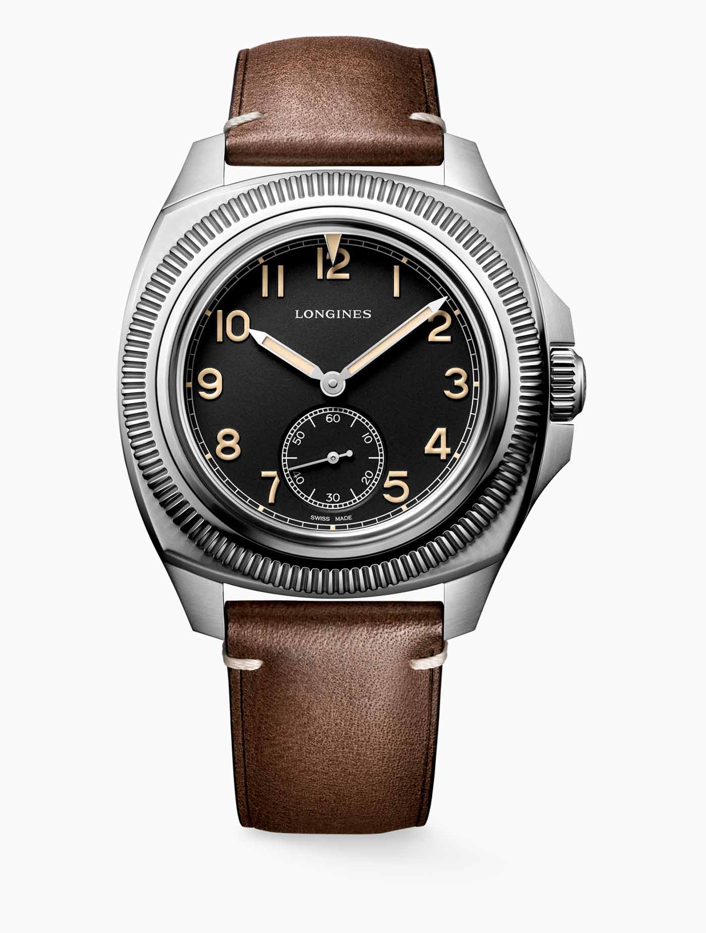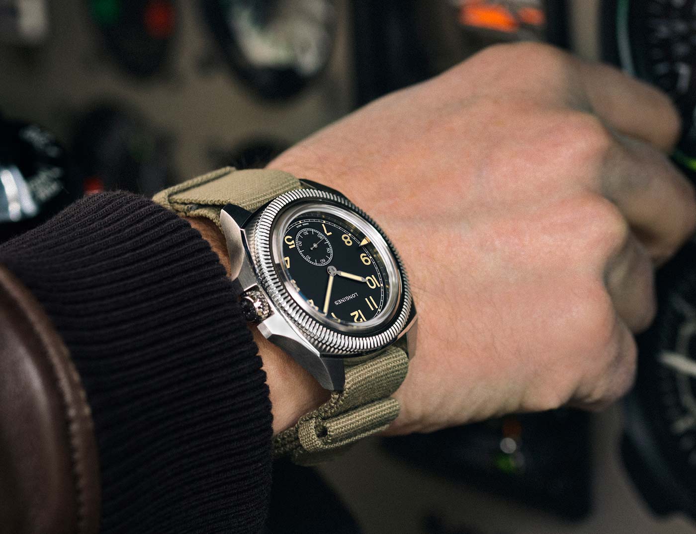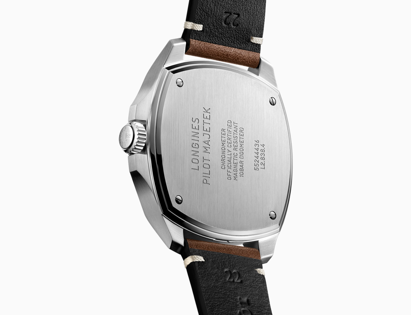 On 1 April 1935 Longines registered a new watch design with the International Industrial Property Office in Bern, Switzerland. Commissioned by the Czechoslovak Air Force, the cushion case design included a rotating bezel and crystal with a luminous ‘starting time’ triangle indicator that pilots used to track flight duration. This model also had the words Majetek Vojenské Správy – Property of the Military Administration – engraved on the back. Although intended for aviators, the ‘Majetek’ attracted a wider audience thanks to its easy-to-ready dial and sturdy construction.