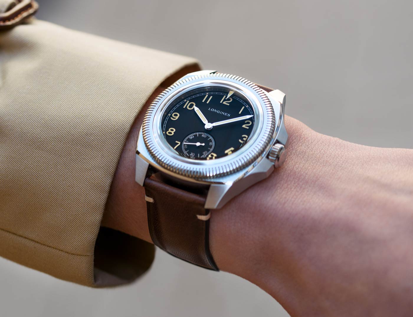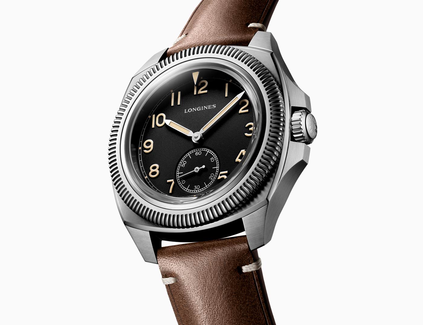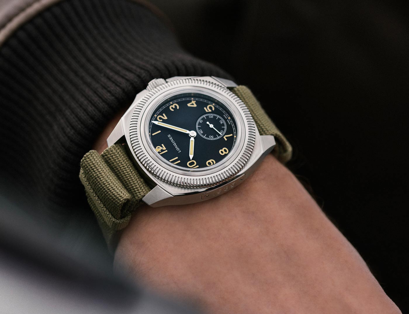 On 1 April 1935 Longines registered a new watch design with the International Industrial Property Office in Bern, Switzerland. Commissioned by the Czechoslovak Air Force, the cushion case design included a rotating bezel and crystal with a luminous ‘starting time’ triangle indicator that pilots used to track flight duration. This model also had the words Majetek Vojenské Správy – Property of the Military Administration – engraved on the back. Although intended for aviators, the ‘Majetek’ attracted a wider audience thanks to its easy-to-ready dial and sturdy construction.