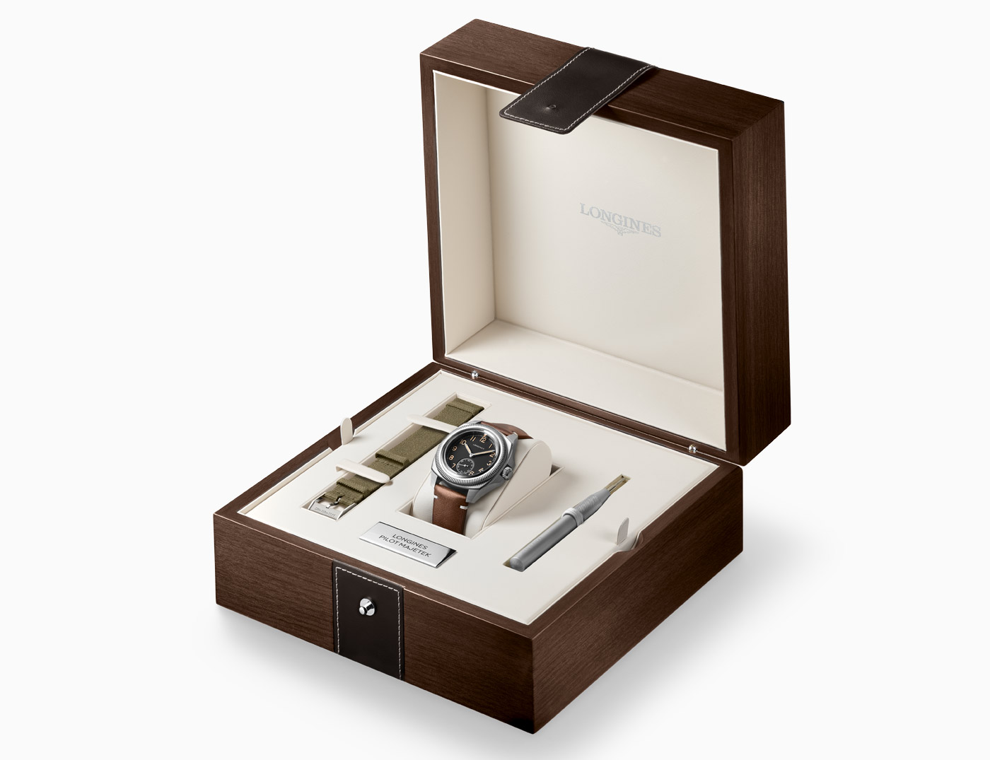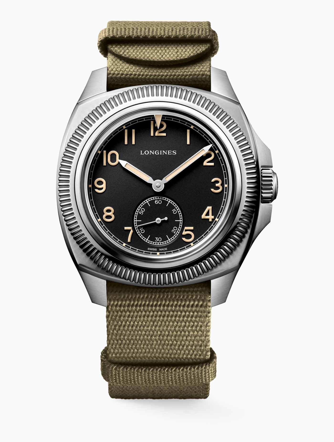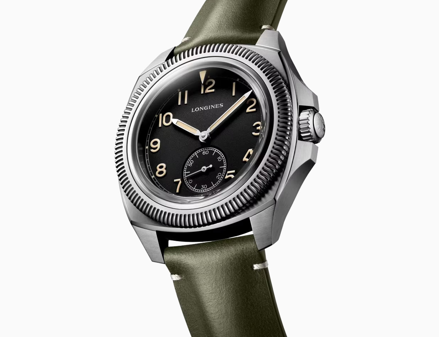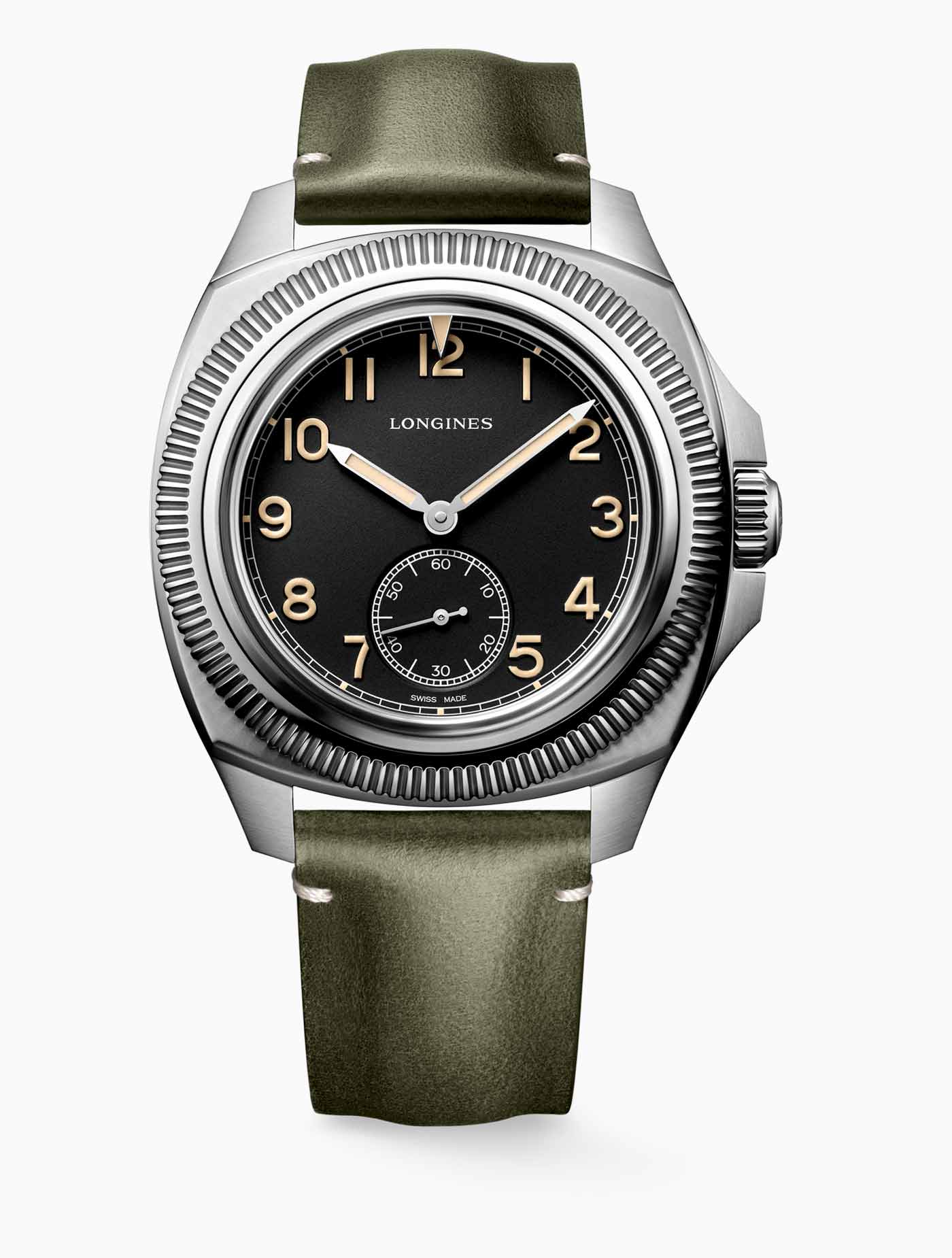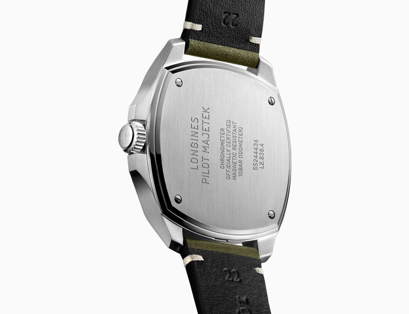 Today, Longines is launching a (second) modern iteration of the Majetek that borrows key details from its namesake. The Pilot Majetek features a 43-mm cushion case topped with a fluted bezel. Larger than the 40-mm original, the case frames a matte black porcelain dial with a classic railroad minute track and raised Arabic numerals coated in Old Radium Super-LumiNova. On the 1935 model, the crystal – with the triangle printed on – and the bezel rotated as a unit. On the Pilot Majetek the sapphire glass is fixed, ensuring 100 m water-resistance, and the triangle is attached to the rotating bezel. Longines also added crown guards and a commemorative 1935 plaque to each side of the steel case. The caliber L893.6, a movement exclusive to Longines, powers the watch and delivers a 72 hour power reserve. Buyers can chose between three versions of the Pilot Majetek; a brown leather strap with beige stitching ($3,850.00), a green leather strap with beige stitching ($3,750.00), or a khaki-green NATO strap made of recycled material ($3,750.00).