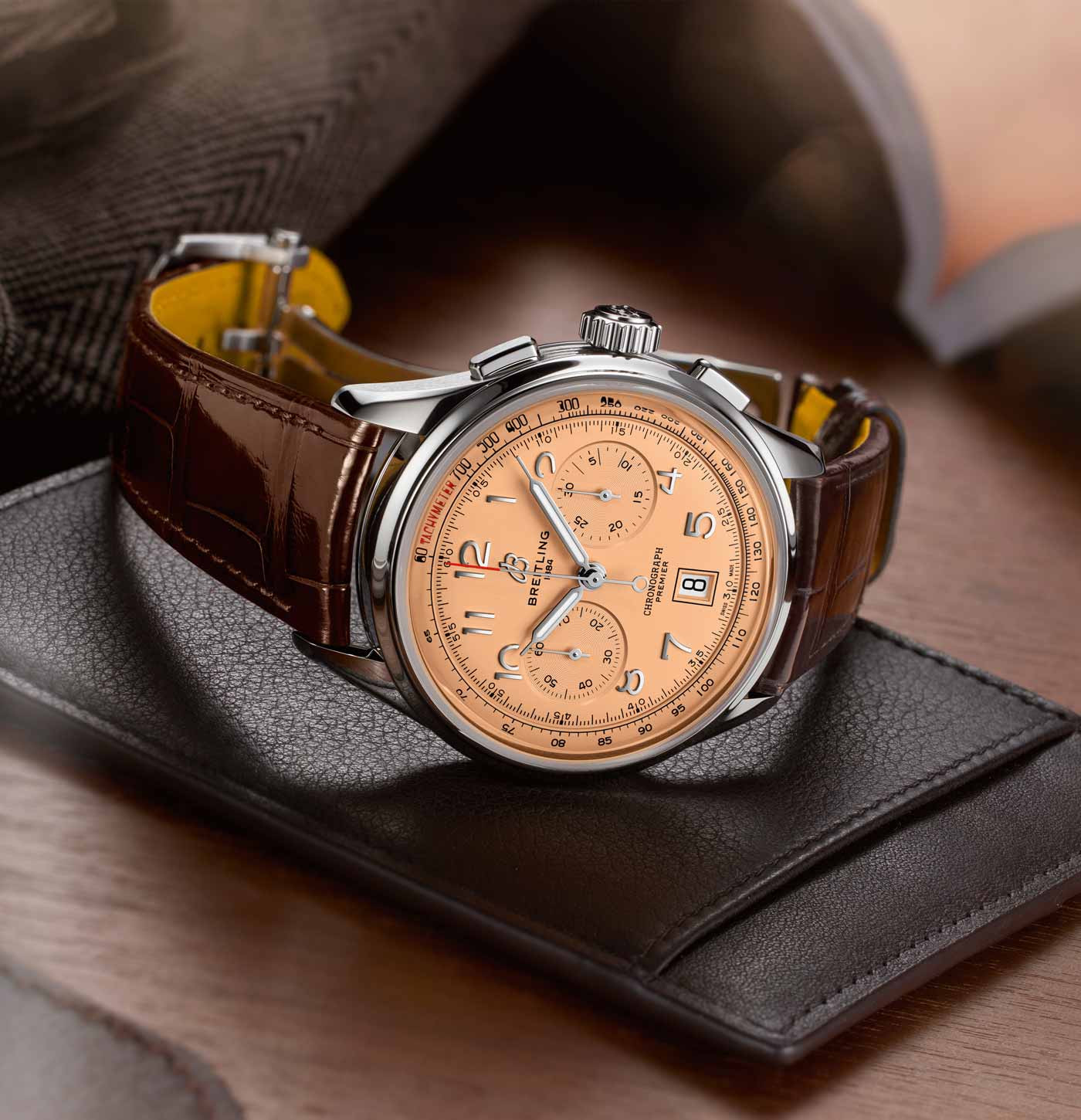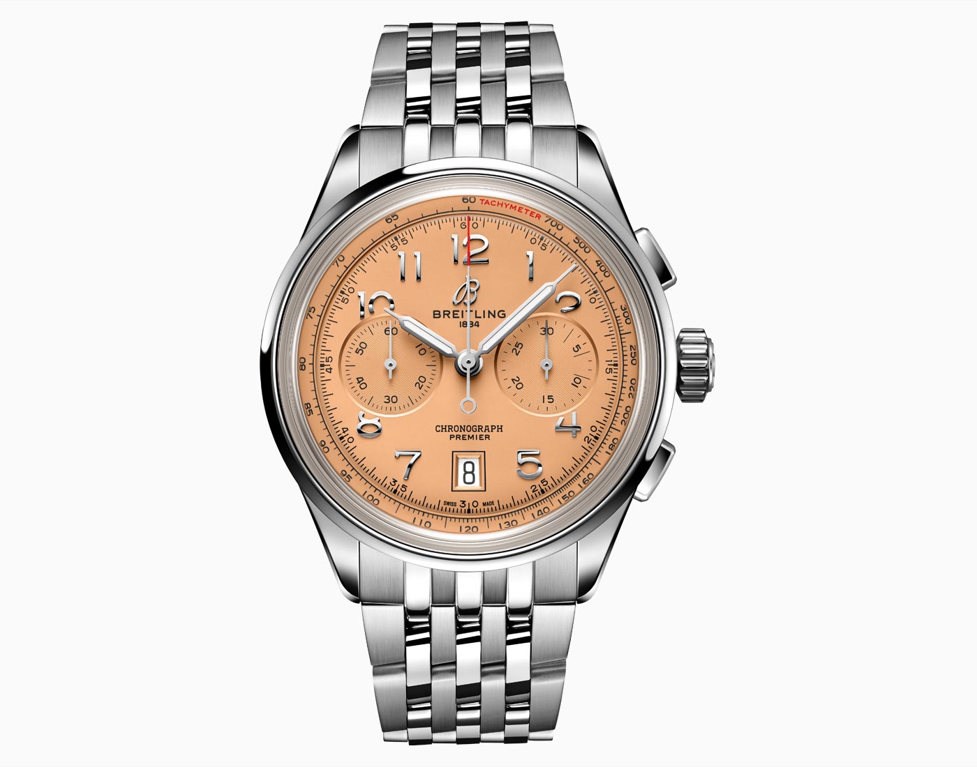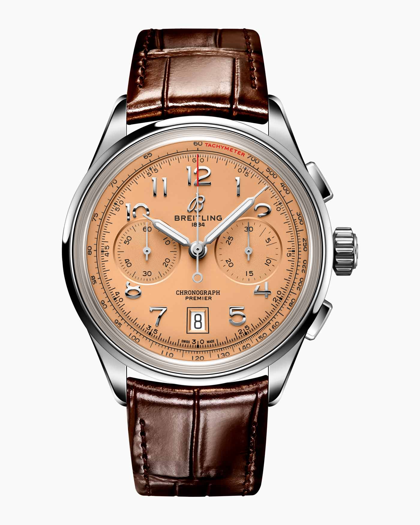 Breitling just released six new Premier Chronographs equipped with the latest iteration of the Manufacture Caliber 01, updated in 2022 with a trimmer profile and more compact oscillating weight. A follow-up to the Premier Heritage Collection introduced in 2021, the Premier B01 Chronograph 42 features a 42-mm case with streamlined rectangular pushers, a smooth fixed bezel and a sapphire crystal case back. The vintage-inspired dial has lume filled hour and minute hands, a date window at six o’clock, and tone-on-tone sub-dials with chronograph minutes at 3 o’clock and running seconds at 9 o’clock. This release includes five stainless-steel models with a salmon, blue, green, black, or cream dial, and an 18K red gold variation with a classic cream dial. Buyers can choose between an alligator leather strap or a sleek 7-row metal bracelet available in stainless-steel or red gold, to match the case.