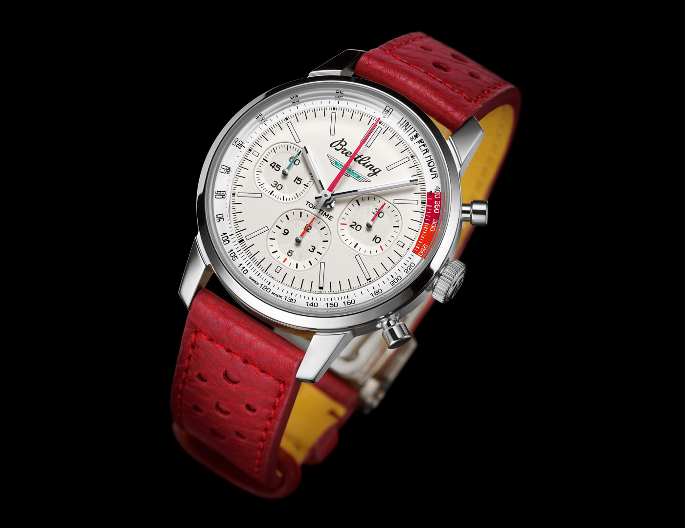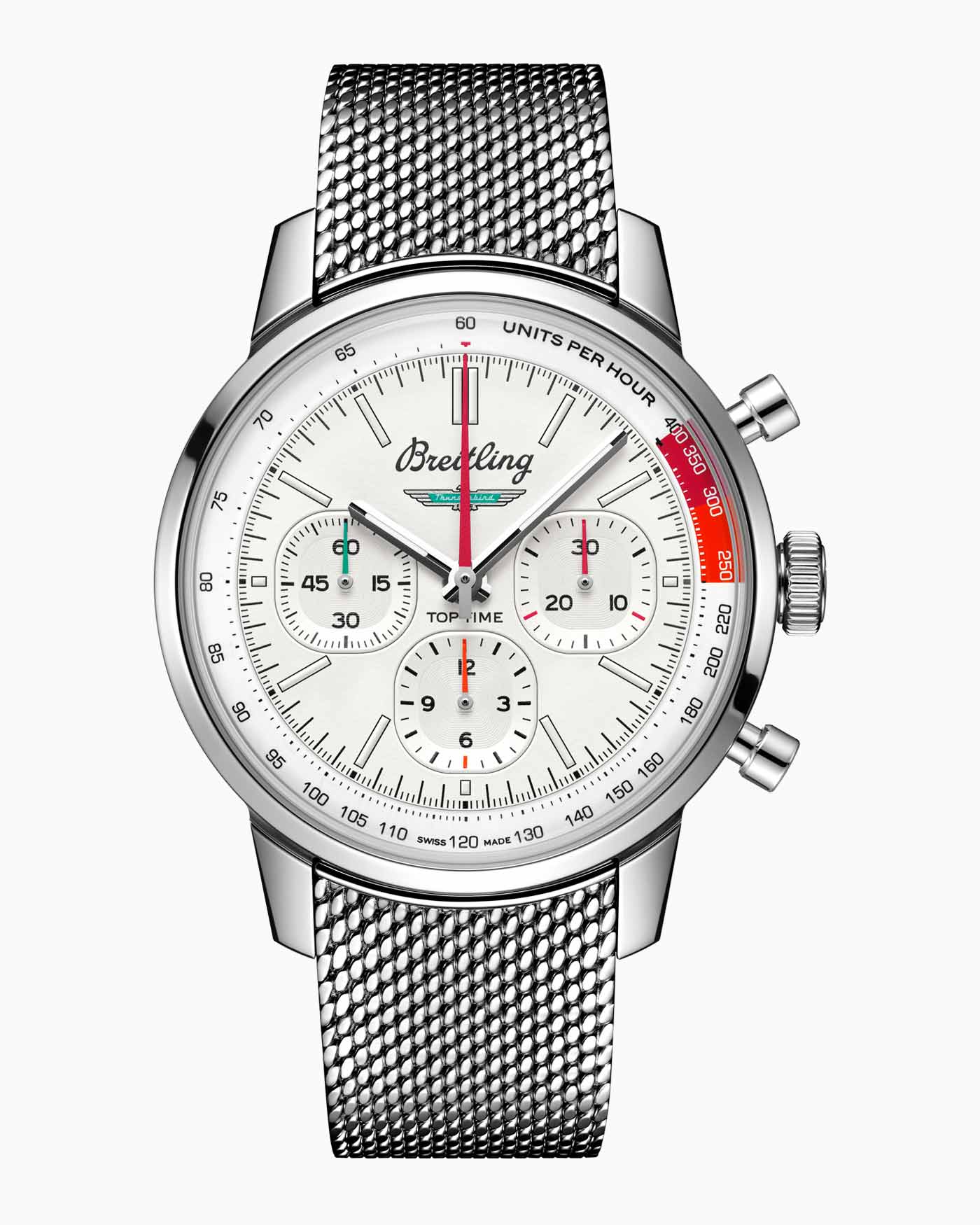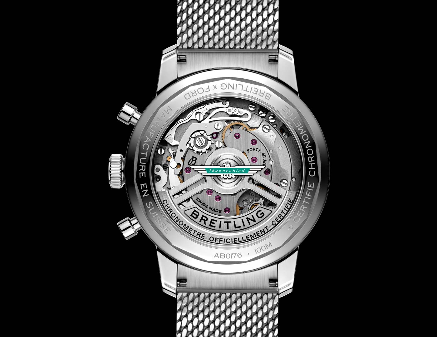 Breitling just updated the Top Time Classic Cars collection with a more powerful movement and a brand new model. Along with watches dedicated to the Chevy Corvette, Ford Mustang and Shelby Cobra, the Classic Cars lineup now includes a chronograph inspired by Ford’s original T-bird. The Top Time B01 Ford Thunderbird features the turquoise T-bird logo at the center of a white dial with a speed-measuring tachymeter scale and three ‘squircle’ (not quite square, not quite round) sub-dials shaped like vintage dashboard gauges. As well as a perforated leather racing strap, the 42mm stainless steel case can be paired with a stainless steel mesh bracelet. All four Classic Car watches feature the colors and emblems of their 1950s and 1960s sports car counterparts, and now come with the Breitling Manufacture Caliber 01. Visible through the sapphire-crystal case back, this certified movement provides a 70-hour power reserve. To house the caliber, the Top Time case has been enhanced and now provides an increased water resistance of 100 m / 328 ft.