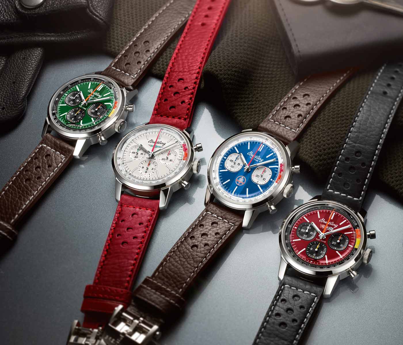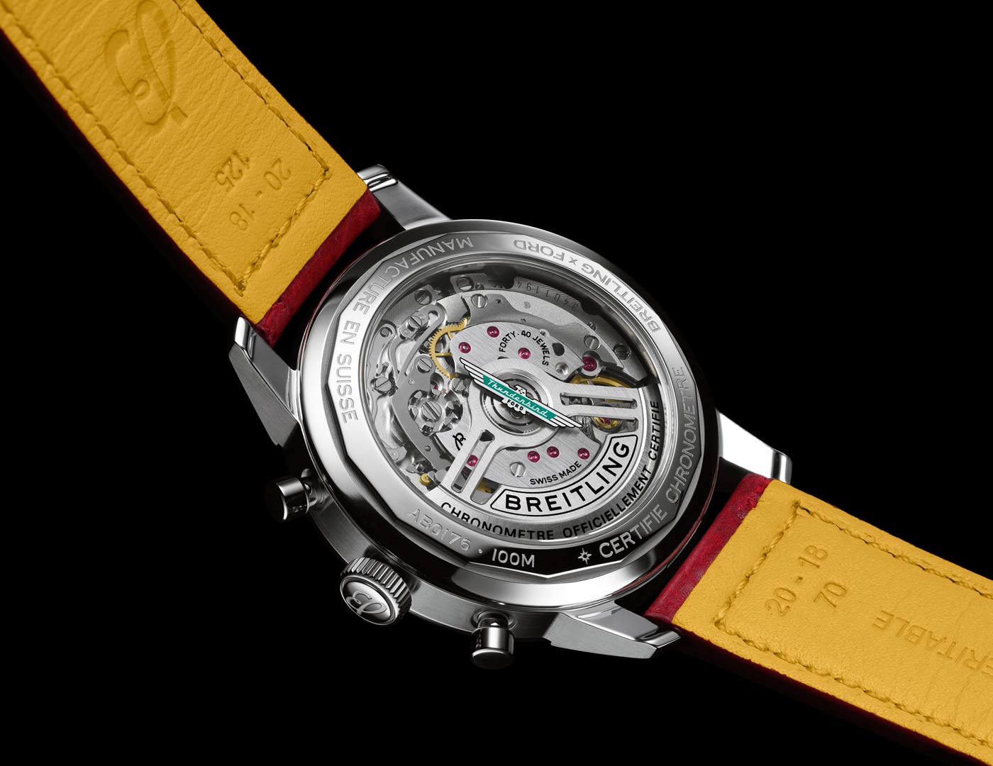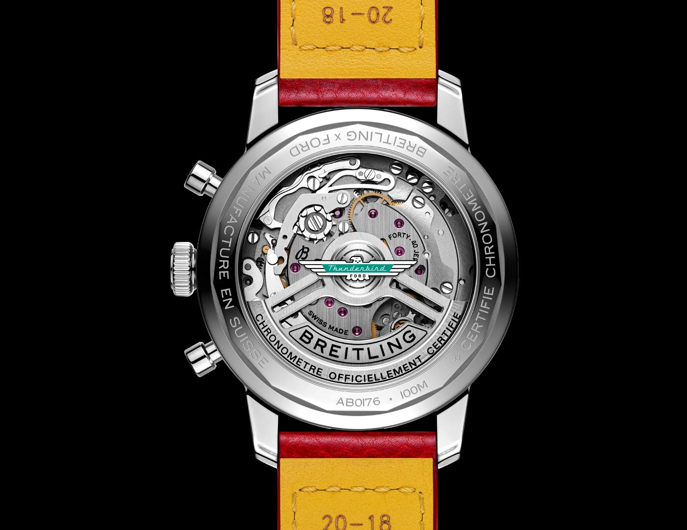 Breitling just updated the Top Time Classic Cars collection with a more powerful movement and a brand new model. Along with watches dedicated to the Chevy Corvette, Ford Mustang and Shelby Cobra, the Classic Cars lineup now includes a chronograph inspired by Ford’s original T-bird. The Top Time B01 Ford Thunderbird features the turquoise T-bird logo at the center of a white dial with a speed-measuring tachymeter scale and three ‘squircle’ (not quite square, not quite round) sub-dials shaped like vintage dashboard gauges. As well as a perforated leather racing strap, the 42mm stainless steel case can be paired with a stainless steel mesh bracelet. All four Classic Car watches feature the colors and emblems of their 1950s and 1960s sports car counterparts, and now come with the Breitling Manufacture Caliber 01. Visible through the sapphire-crystal case back, this certified movement provides a 70-hour power reserve. To house the caliber, the Top Time case has been enhanced and now provides an increased water resistance of 100 m / 328 ft.