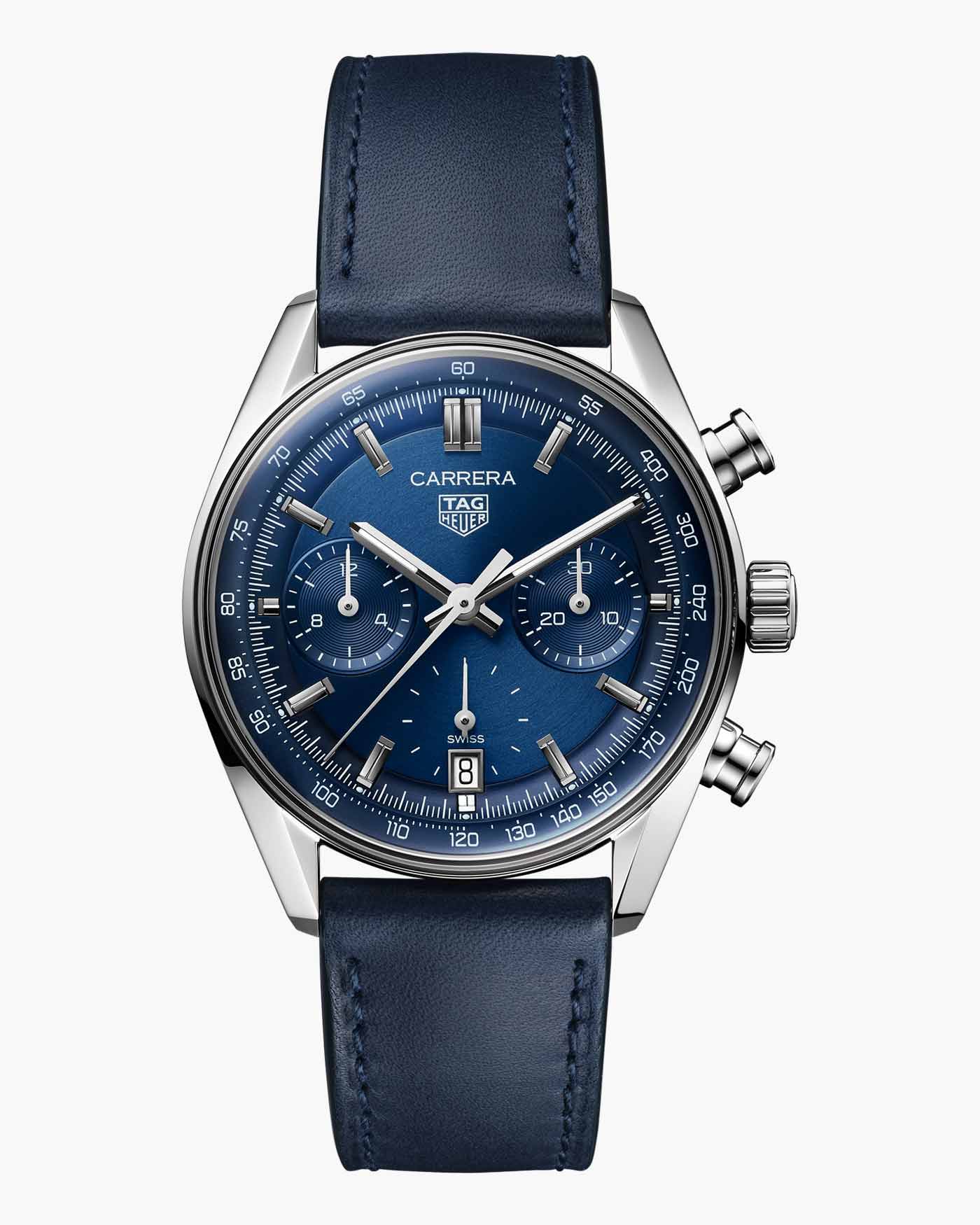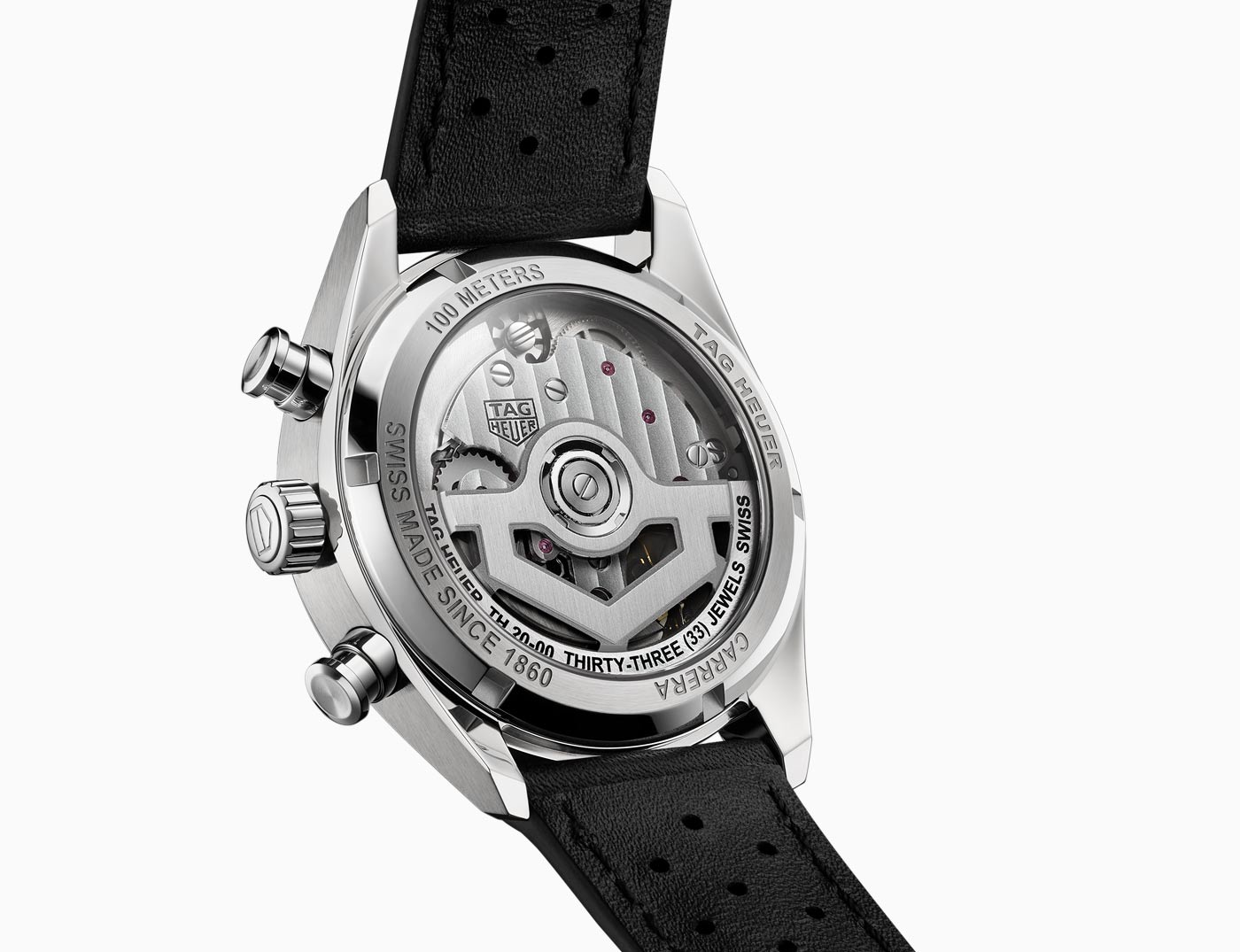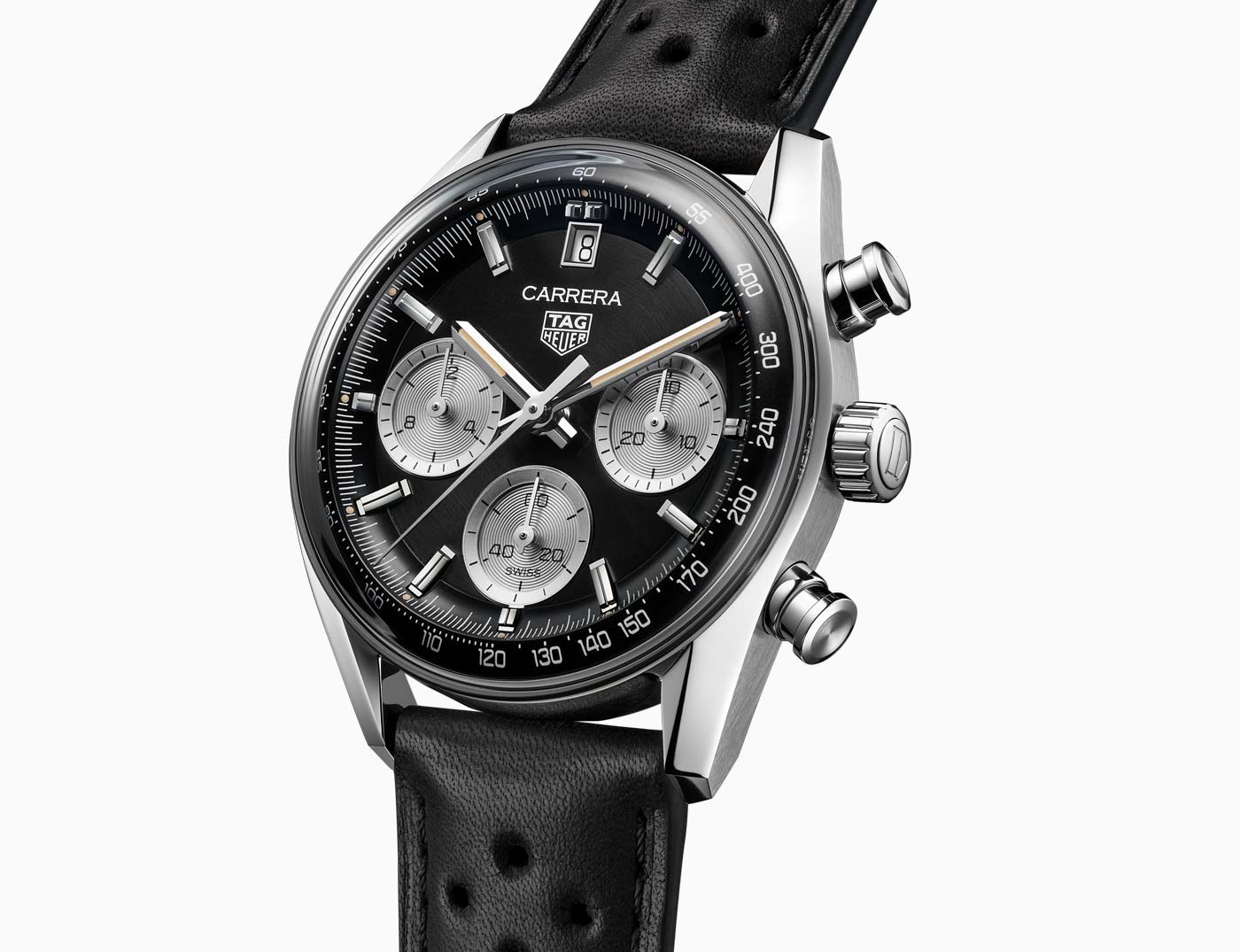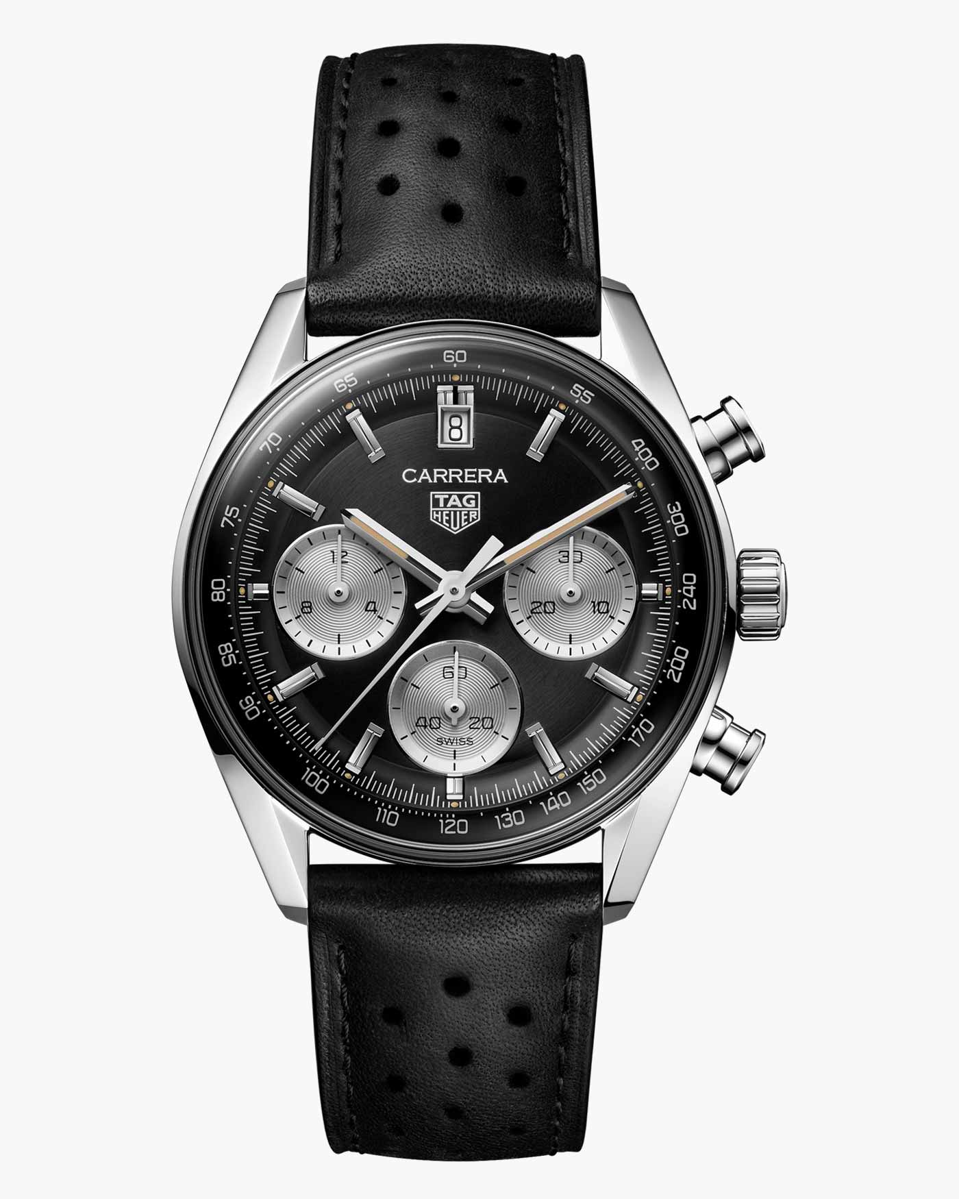 Both iterations of the TAG Heuer Carrera Chronograph are topped with a sapphire crystal shaped liked the domed Hesalite crystals found on Heuer Carrera models from the 1970s, only now the crystal flows seamlessly over the tachymeter scale that runs around the dial edge and into the case. In the same way, the flange and indexes have been curved – making the tachymeter visible from more angles. Equally pronounced are the new pushers, reshaped and positioned to make them easier to use. Inside, a next-gen version of TAG’s in-house automatic chronograph caliber powers the watches. Named TH20-00 and visible through the sapphire crystal case back, the movement’s new oscillating weight offers bidirectional winding – previous versions only charged the movement’s mainspring if the rotor moved in a counter-clockwise direction – and an 80-hour power reserve. Both styles come on leather straps, with the black strap perforated like driving gloves.