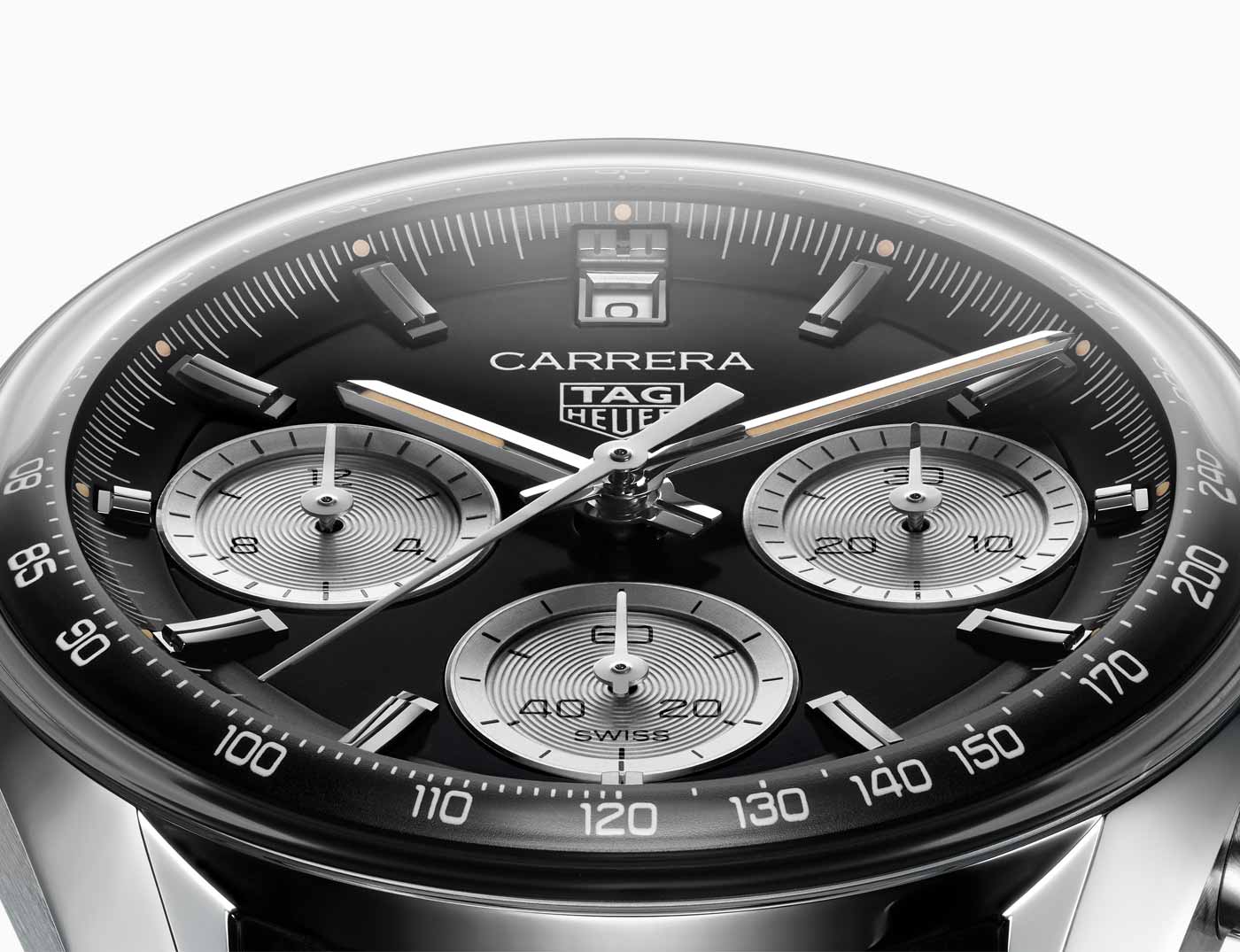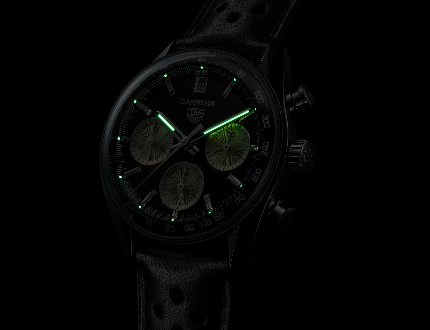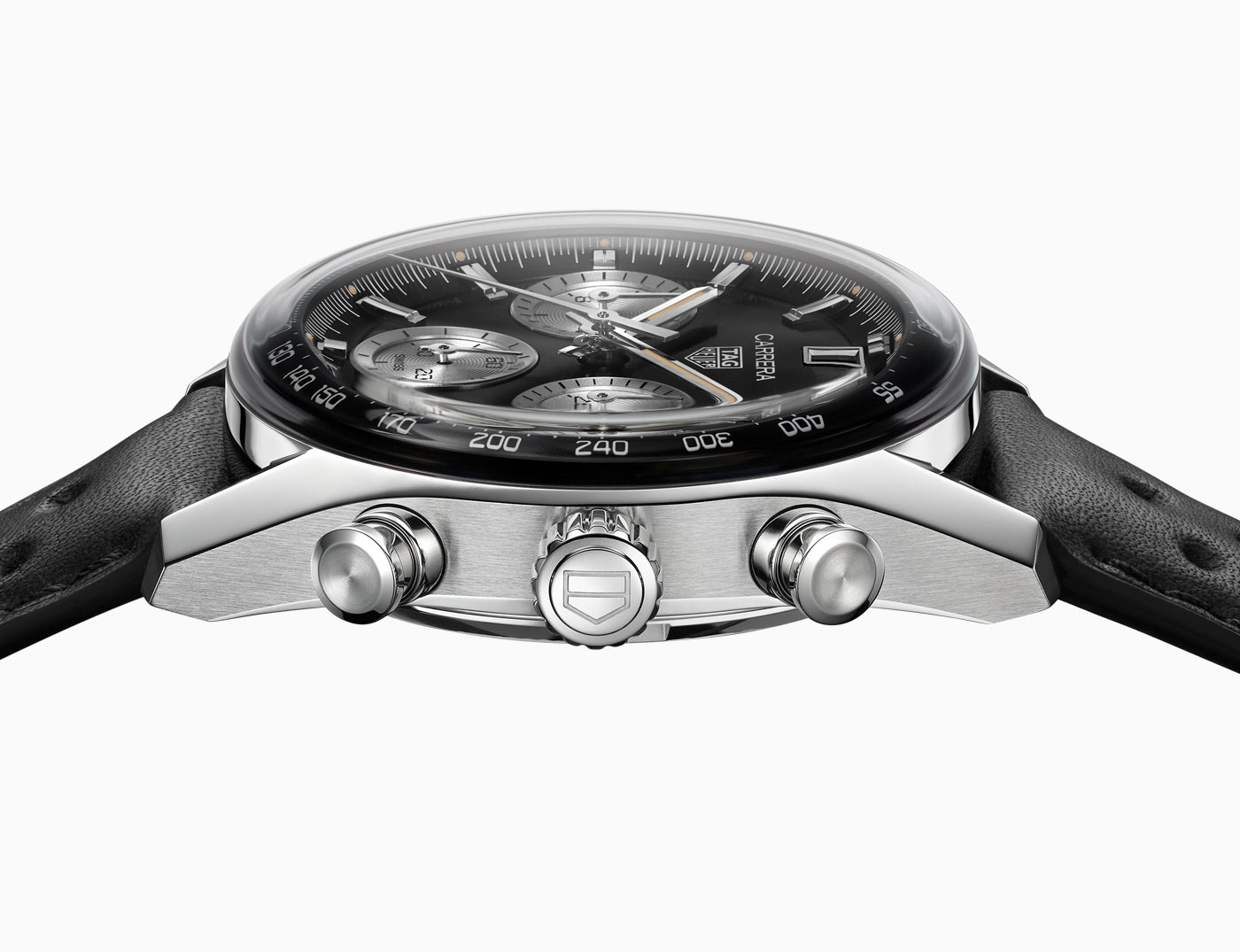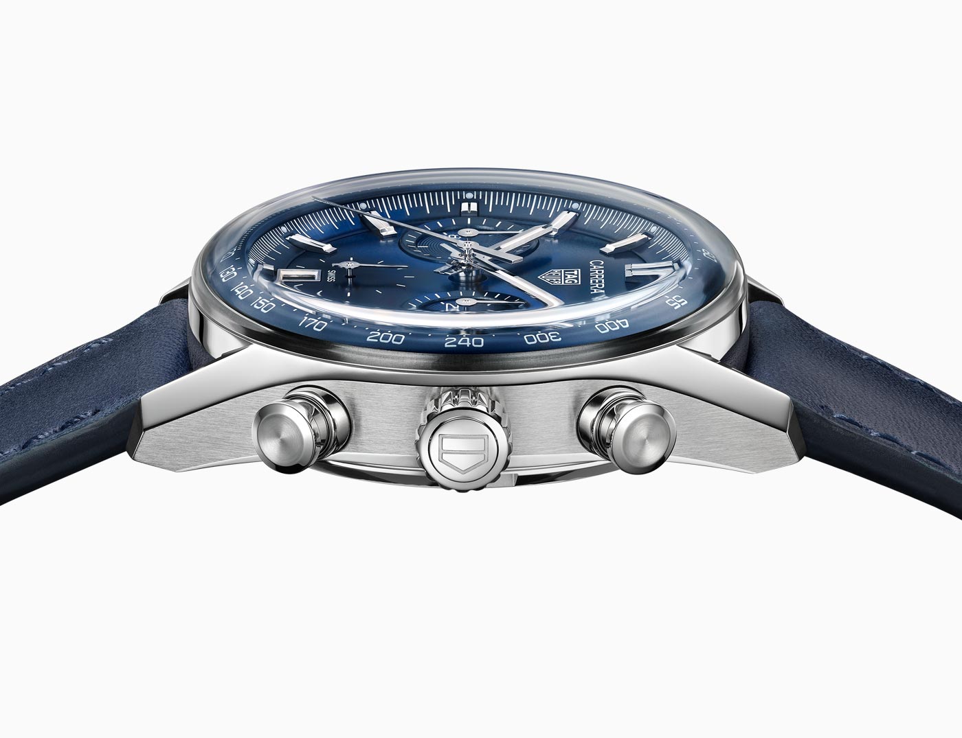 Both iterations of the TAG Heuer Carrera Chronograph are topped with a sapphire crystal shaped liked the domed Hesalite crystals found on Heuer Carrera models from the 1970s, only now the crystal flows seamlessly over the tachymeter scale that runs around the dial edge and into the case. In the same way, the flange and indexes have been curved – making the tachymeter visible from more angles. Equally pronounced are the new pushers, reshaped and positioned to make them easier to use. Inside, a next-gen version of TAG’s in-house automatic chronograph caliber powers the watches. Named TH20-00 and visible through the sapphire crystal case back, the movement’s new oscillating weight offers bidirectional winding – previous versions only charged the movement’s mainspring if the rotor moved in a counter-clockwise direction – and an 80-hour power reserve. Both styles come on leather straps, with the black strap perforated like driving gloves.