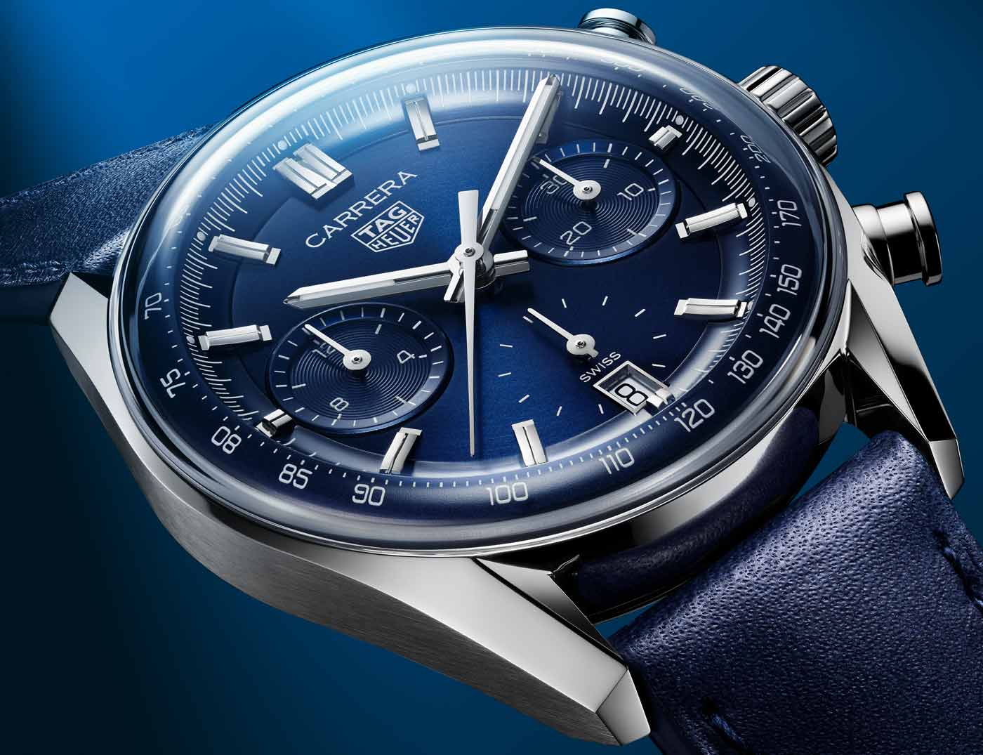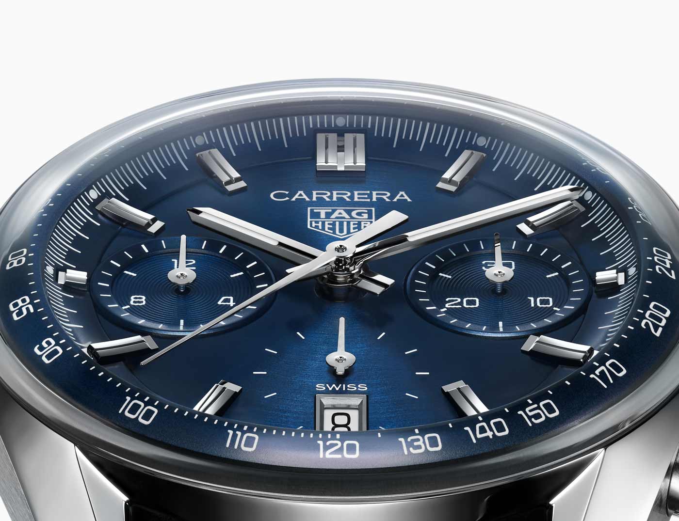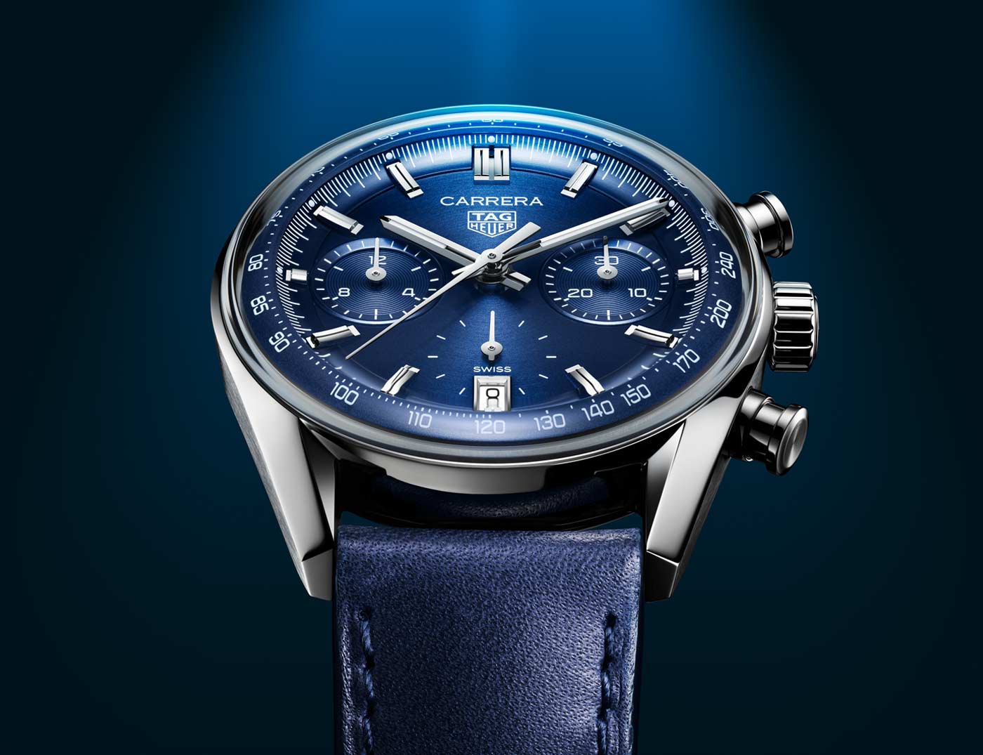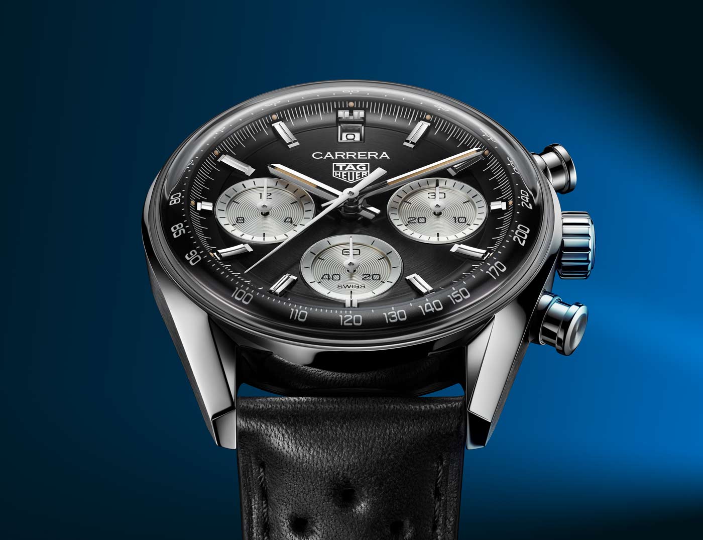 TAG Heuer is celebrating the 60th anniversary of the Carrera Chronograph with three new models, unveiled at Watches and Wonders Geneva 2023. The Heuer Carrera made its debut in 1963 as a tool watch. Its design was clean and legible, without distracting or extraneous elements. The updated TAG Heuer Carrera Chronograph and Carrera Chronograph Tourbillon echo the spirit of the original, with a few more bells and whistles. TAG kicks off the celebration with two 39-mm Carrera Chronograph styles, one with a blue dial and a second with a black & silver reverse panda dial – the nickname given to black watch dials with high-contrast white or silver subdials. With three chronograph counters, the reverse panda model is a greatest hits compilation of collectible 1960s Heuer Carreras: such as the reference 3147 Dato 12, the first Heuer Carrera with chronograph and calendar functions, and the reference 2447 NS, perhaps the rarest Heuer Carrera of them all.