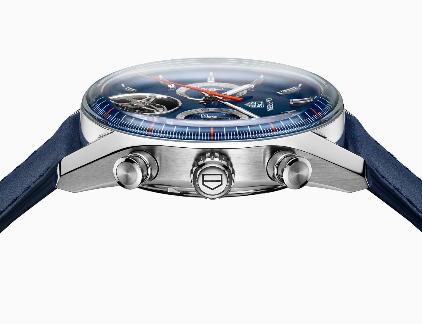The new TAG Heuer Carrera Chronograph Tourbillon is a follow up to a series of previously released tourbillons with larger cases. Elevated by an aperture at 6 o’clock with a tourbillon cage, this elegant 42-mm model shares the ‘glassbox’ form of early Carreras. Every element of the watch has been refined to showcase the tourbillon, including the curved sapphire crystal and the dial’s subtly curved flange and indexes – curved to mirror the crystal’s edge. The deep azure subdials are surrounded by contrasting silver rings, increasing the legibility of the chronograph read-outs. In the same way, the minutes scale running around the outside edge of the dial is punctuated by orange detailing over each hour marker. A final, retro touch is the central seconds hand, a crisp triangular shape inspired by 1960s race car instrument panels. TAG Heuer’s TH20-09 tourbillon movement, visible through the exhibition case back, powers the watch. As with the TH20-00, the TH20-09 now delivers bidirectional winding and a higher level of finishing.