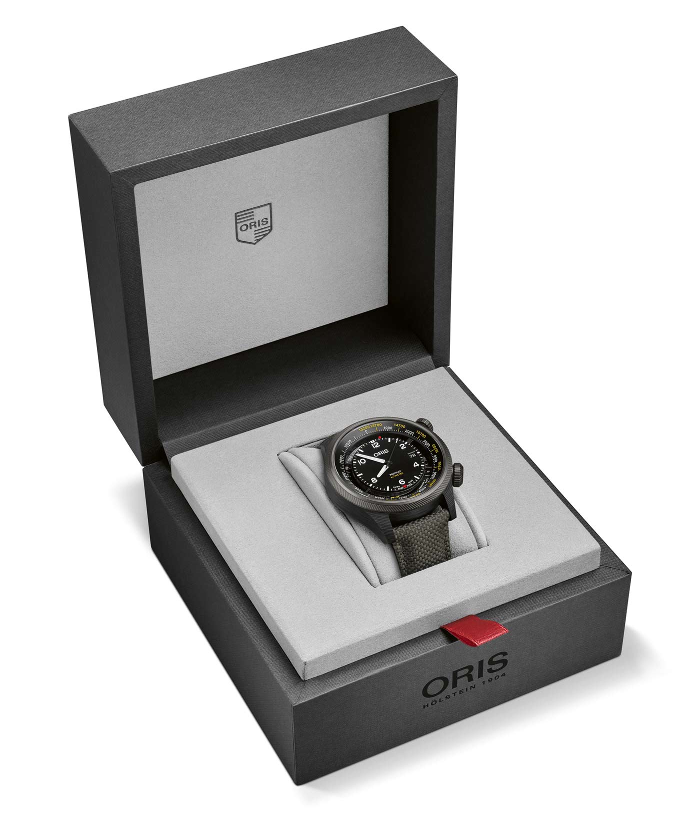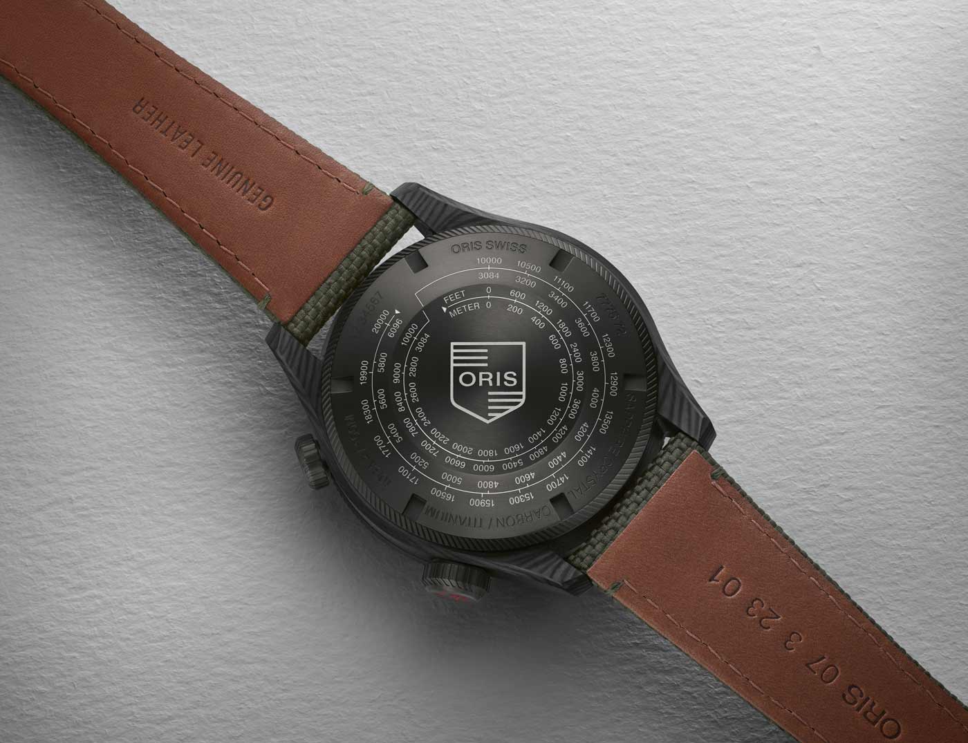 Oris is bring back the ProPilot Altimeter. First introduced in 2014, the Altimeter is the only watch that combines an automatic mechanical movement with a mechanical altitude meter. The second generation model is slimmer, lighter and more powerful. Oris upgraded the movement to a slimline automatic with an improved 56-hour power reserve, making the case 1 millimeter thinner. Because the 3-D printed, single-piece case is made of a pioneering carbon fiber composite, used for the first time in watchmaking, the new Altimeter is 70 grams lighter. And, after three years of development, Oris upgraded the pressure box to increase the range of measurement. Where previously the scales topped out at 15,000 feet or 4,500 meters, the new module can gauge altitude up to 19,700 feet or 6,000 meters. Just like the original, buyers can chose between models configured in feet or meters. The altitude scale stands out against the black dial, circling the date window at 3 o’clock and Super-LumiNova coated hands, numerals and markers. Both models include a feet-to-meter conversion chart engraved on the grey PVD coated titanium case back.