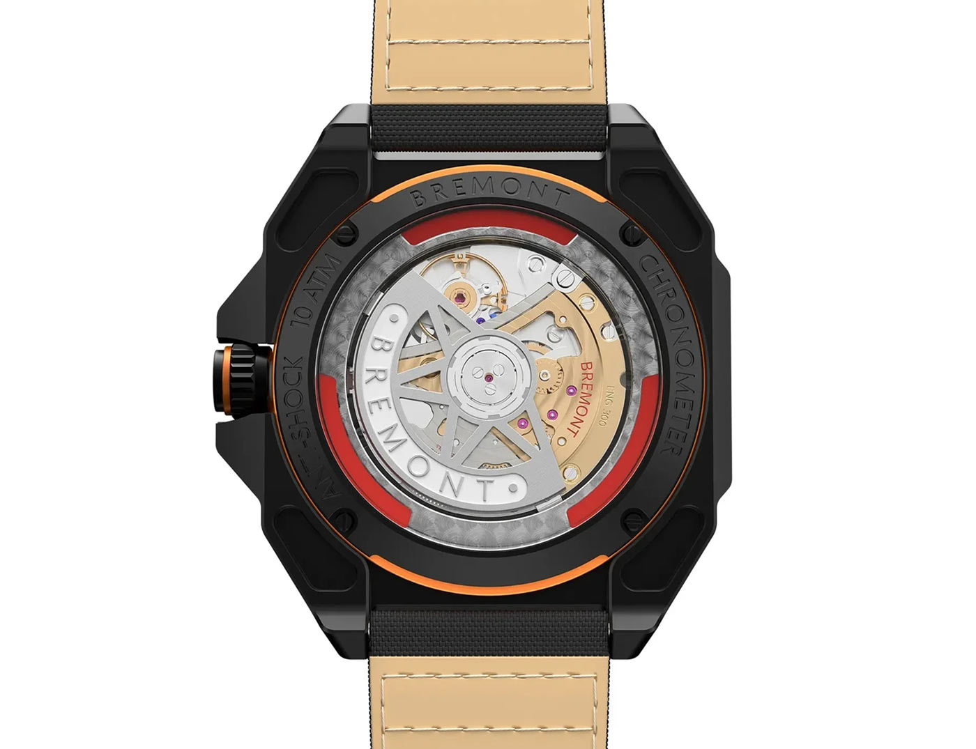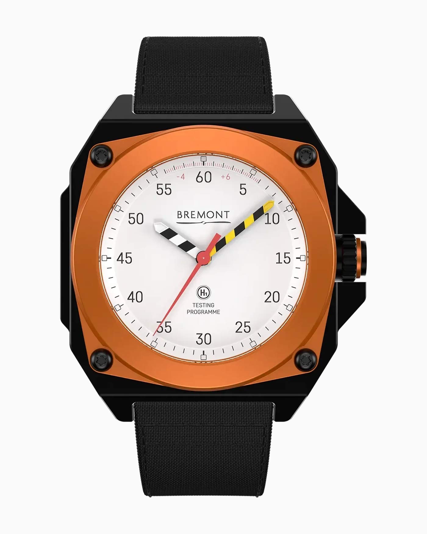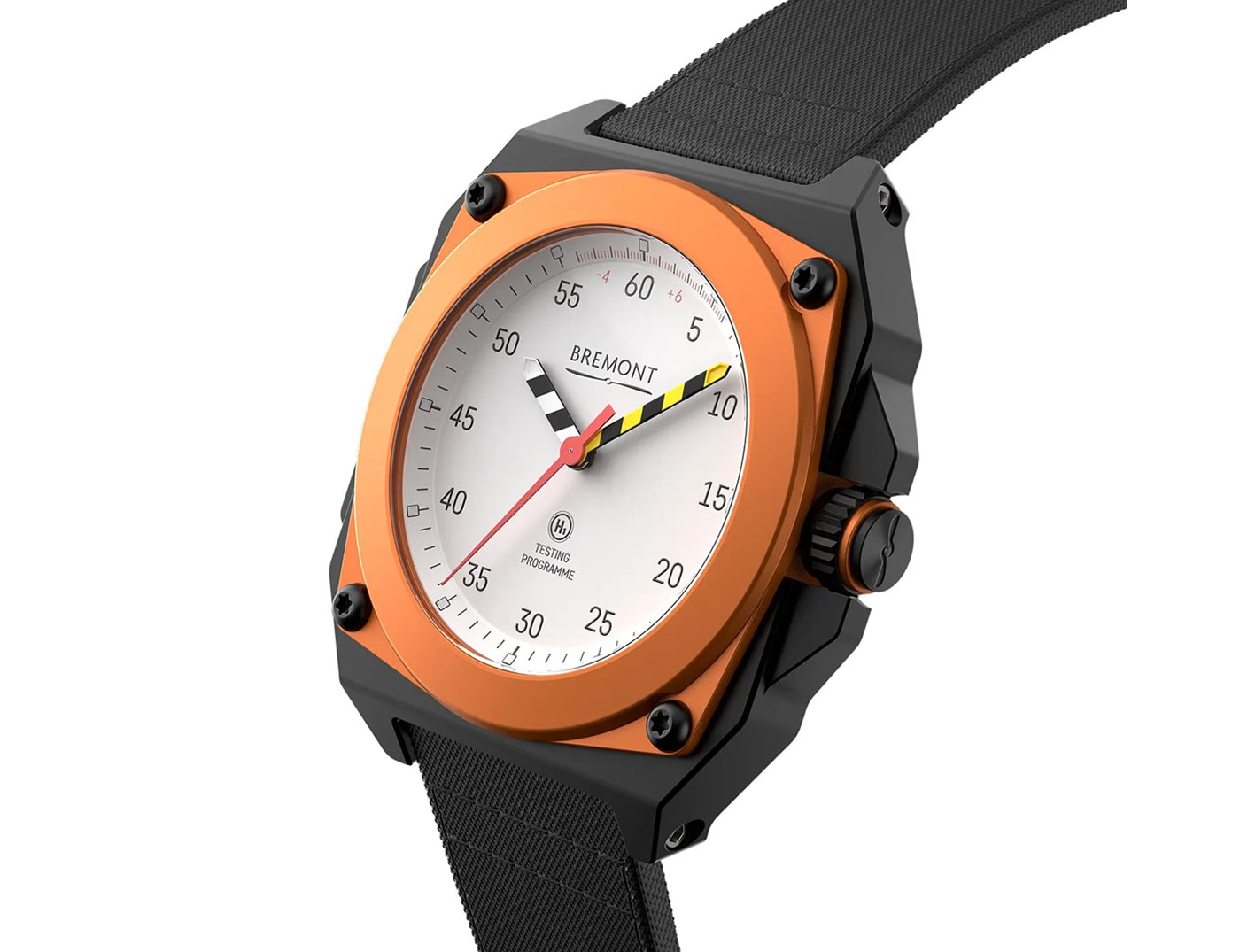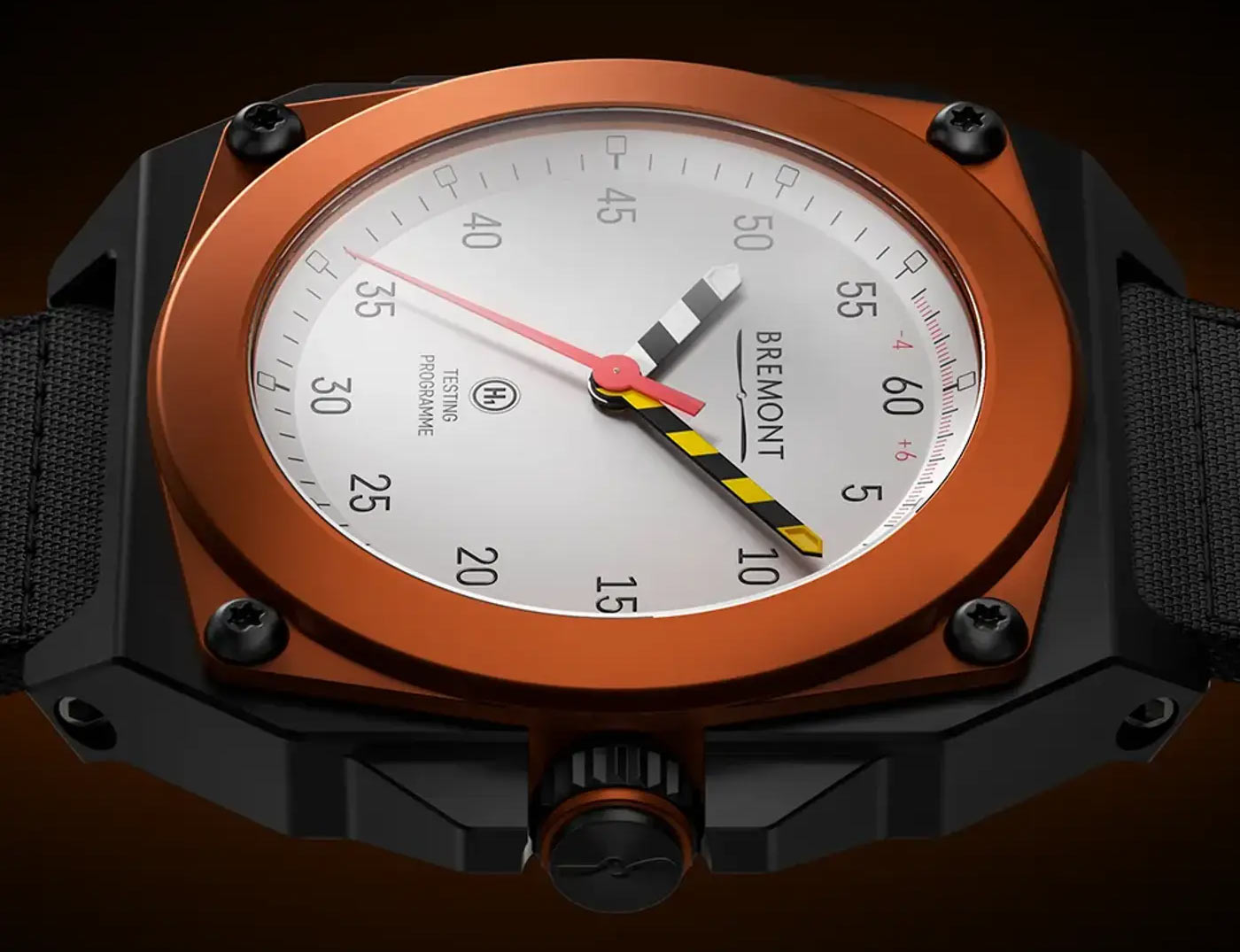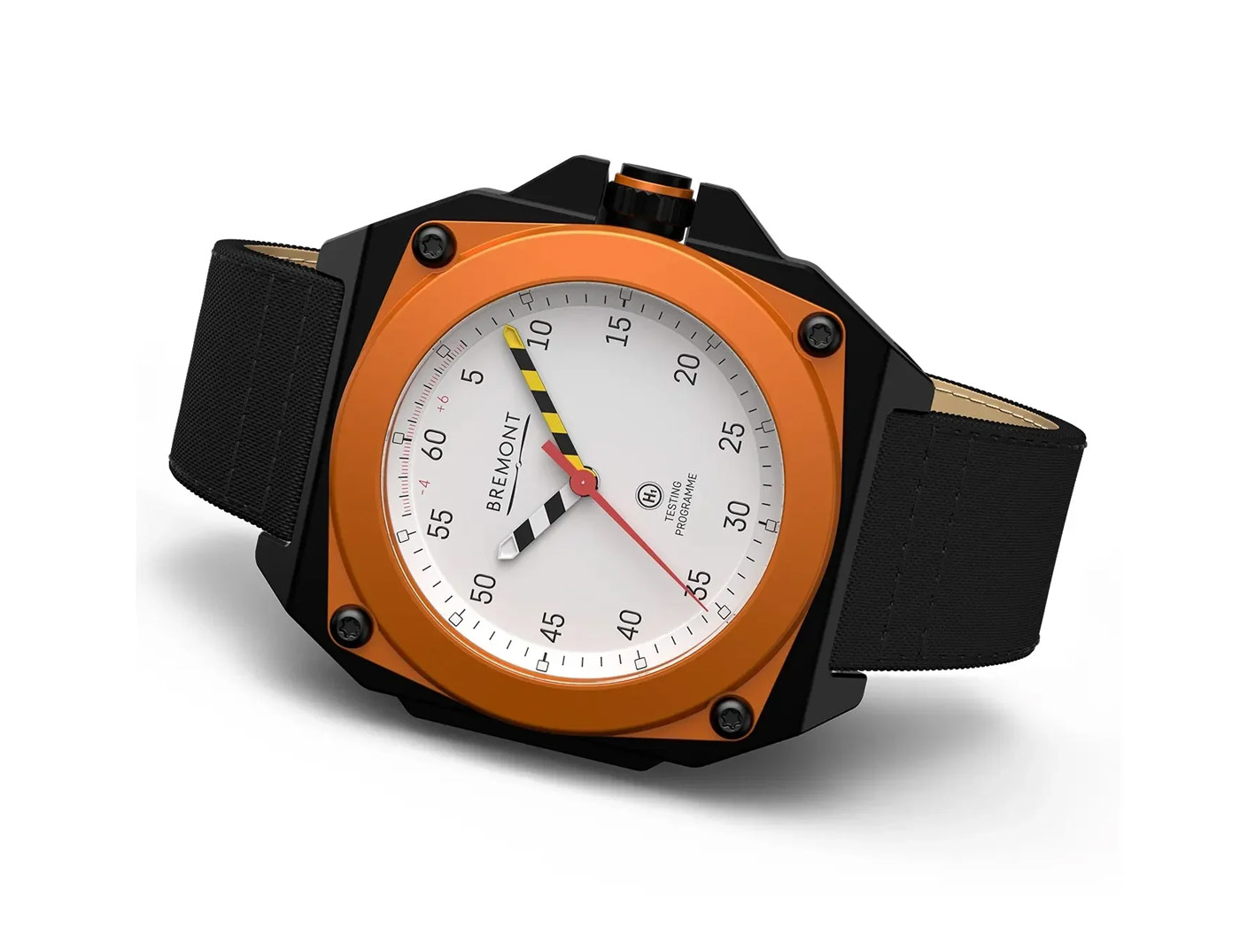Bremont’s new Limited Edition MB Viper is a concept watch brought to life. The prototype was developed to test Bremont’s ENG300 movement using simulations of the most extreme conditions endured by fighter pilots, from ‘zoom temperature’ fluctuations to live ejection testing. Designed in collaboration with Martin-Baker, a British engineering firm responsible for supplying 70% of the world’s Air Forces with ejection seat tech, the test watch performed so well during the HALT (Highly Accelerated Life Testing) phase the brands put it into production. The unique shape of the watch originates from a special anti-shock mount engineered by Bremont to secure the movement while Martin-Baker conducted the tests. Crafted from grade 5 titanium, the lightweight 43.5-mm case features a protective carbon coating, scratch resistant sapphire crystal and an orange anodized aluminum bezel secured with 4 Torx screws. Green emission Super-LumiNova fills the tips of the striped hour and minute hands, and the square hour markers circling the white metal dial. With the sweeping seconds in red, the colors and chevron pattern on the central hands are a direct reference to the pull handles used on Martin-Baker’s fighter ejection seats.