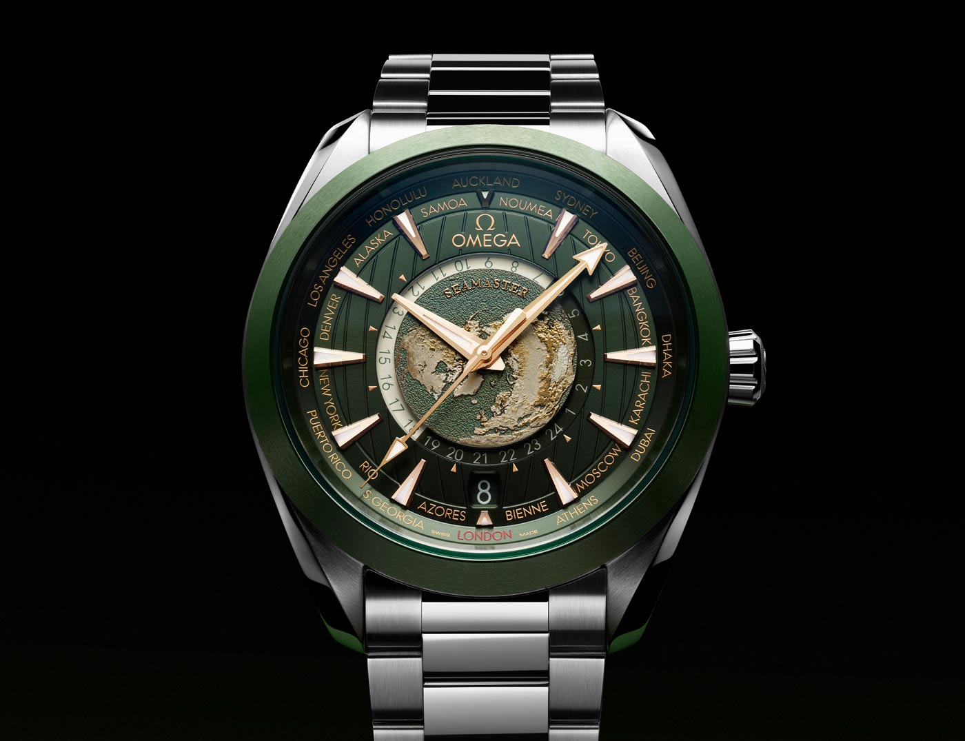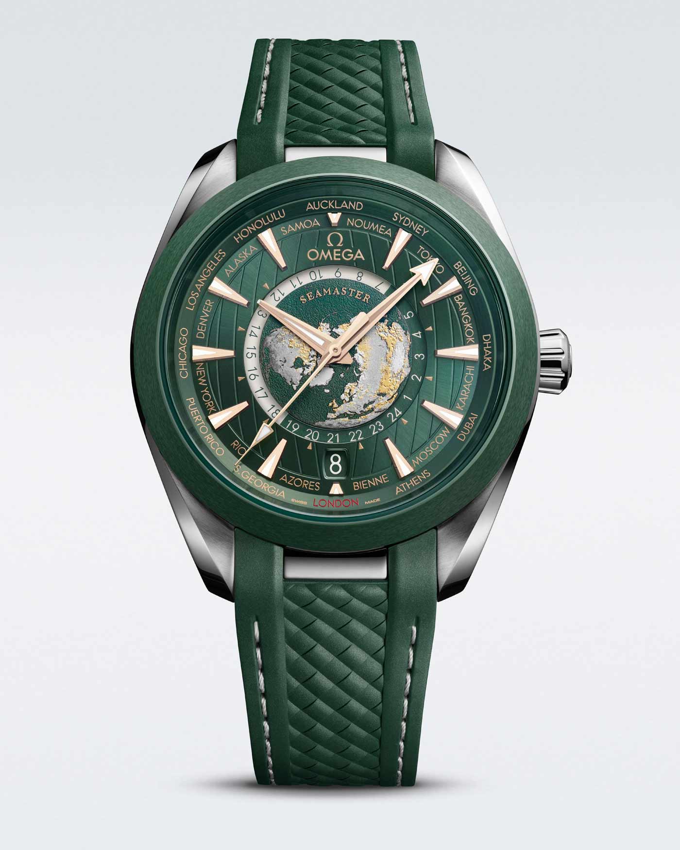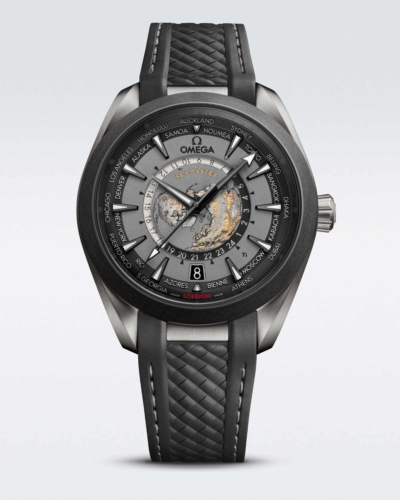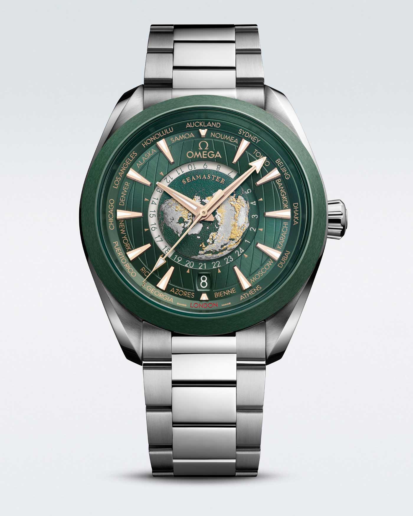 Omega is expanding the Seamaster Aqua Terra Worldtimer collection with three new watches: two stainless steel options, and a striking titanium edition with a dial made entirely by laser ablation. All three models feature a 43-mm case and the collection’s signature world map display – viewed from above the North Pole – at the center of the dial. Circling the topographic map is a 24-hour indication divided into night and day sections. A two tiered list of global destinations circles the outer edge the dial. Singularly, London appears in red to highlight Greenwich Mean Time, or Universal Time Coordinated (UTC). Although impossible to see with the naked eye, the dial and the scratch-resistant sapphire crystal are domed to mimic the curvature of the Earth. Omega’s CoAxial Master Chronometer Calibre 8938 powers the Worldtimer and assures performance at depth, with a water-resistance of 15 bar (150 m/500 ft). Each stainless steel model has a sun-brushed PVD dial in green, encircled by a green ceramic bezel. Gold hands with white SuperLumiNova inserts add shine to the dial. One model has a matching stainless-steel bracelet ($10,400.00), another has an integrated green rubber strap ($10,200.00). The lightweight, corrosion resistant titanium model ($11,800.00) has a grey and black dial produced by laser ablation, the word London is the only transferred element. To complement the matte dial, Omega opted for a black ceramic bezel, and blackened hands and indexes filled with white SuperLumiNova which emits a blue glow in the dark. Completing the look is an integrated black rubber strap with grey stitching.