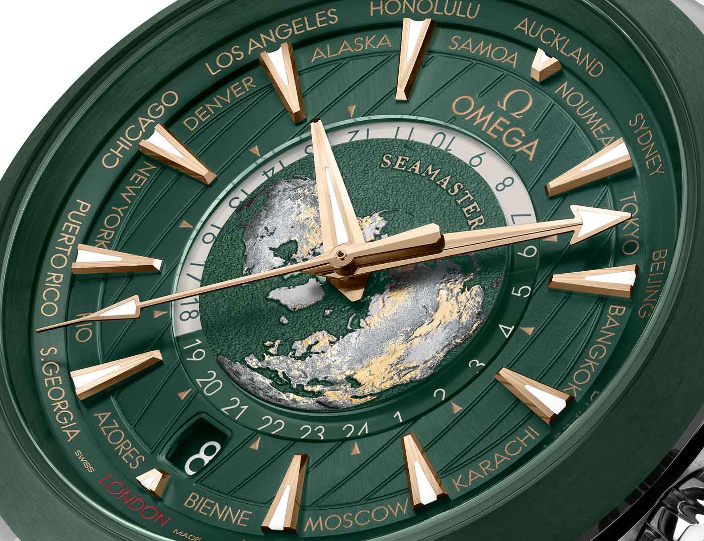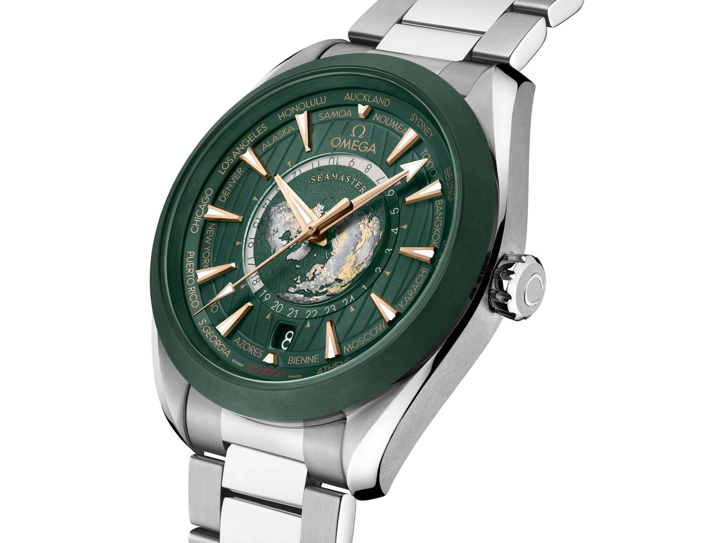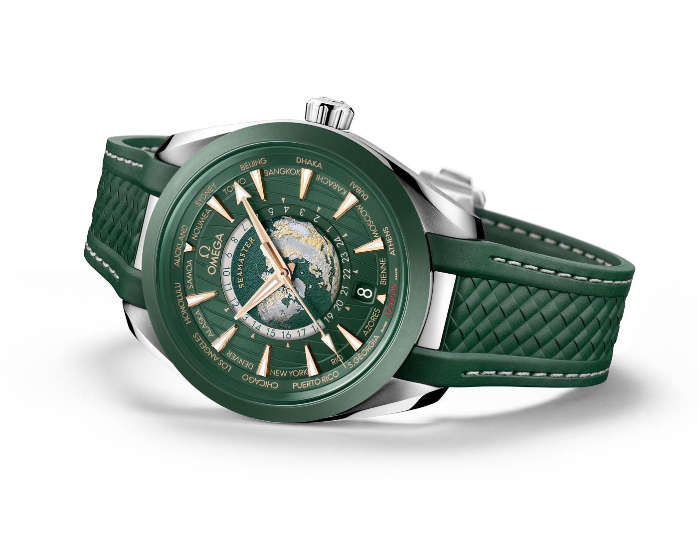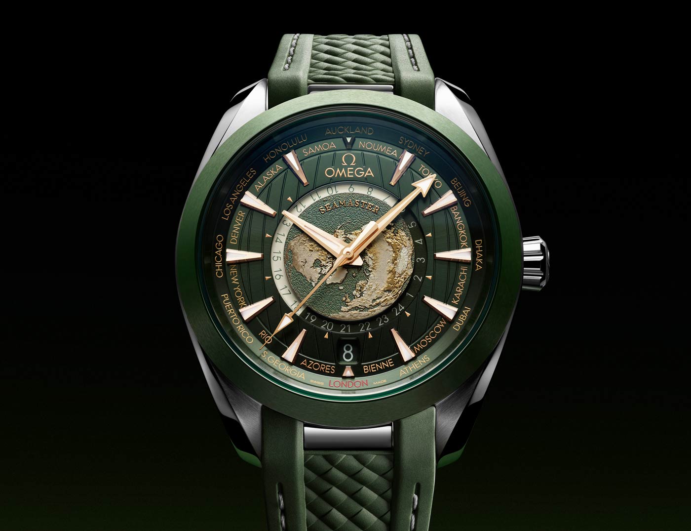 Omega is expanding the Seamaster Aqua Terra Worldtimer collection with three new watches: two stainless steel options, and a striking titanium edition with a dial made entirely by laser ablation. All three models feature a 43-mm case and the collection’s signature world map display – viewed from above the North Pole – at the center of the dial. Circling the topographic map is a 24-hour indication divided into night and day sections. A two tiered list of global destinations circles the outer edge the dial. Singularly, London appears in red to highlight Greenwich Mean Time, or Universal Time Coordinated (UTC). Although impossible to see with the naked eye, the dial and the scratch-resistant sapphire crystal are domed to mimic the curvature of the Earth. Omega’s CoAxial Master Chronometer Calibre 8938 powers the Worldtimer and assures performance at depth, with a water-resistance of 15 bar (150 m/500 ft). Each stainless steel model has a sun-brushed PVD dial in green, encircled by a green ceramic bezel. Gold hands with white SuperLumiNova inserts add shine to the dial. One model has a matching stainless-steel bracelet ($10,400.00), another has an integrated green rubber strap ($10,200.00). The lightweight, corrosion resistant titanium model ($11,800.00) has a grey and black dial produced by laser ablation, the word London is the only transferred element. To complement the matte dial, Omega opted for a black ceramic bezel, and blackened hands and indexes filled with white SuperLumiNova which emits a blue glow in the dark. Completing the look is an integrated black rubber strap with grey stitching.