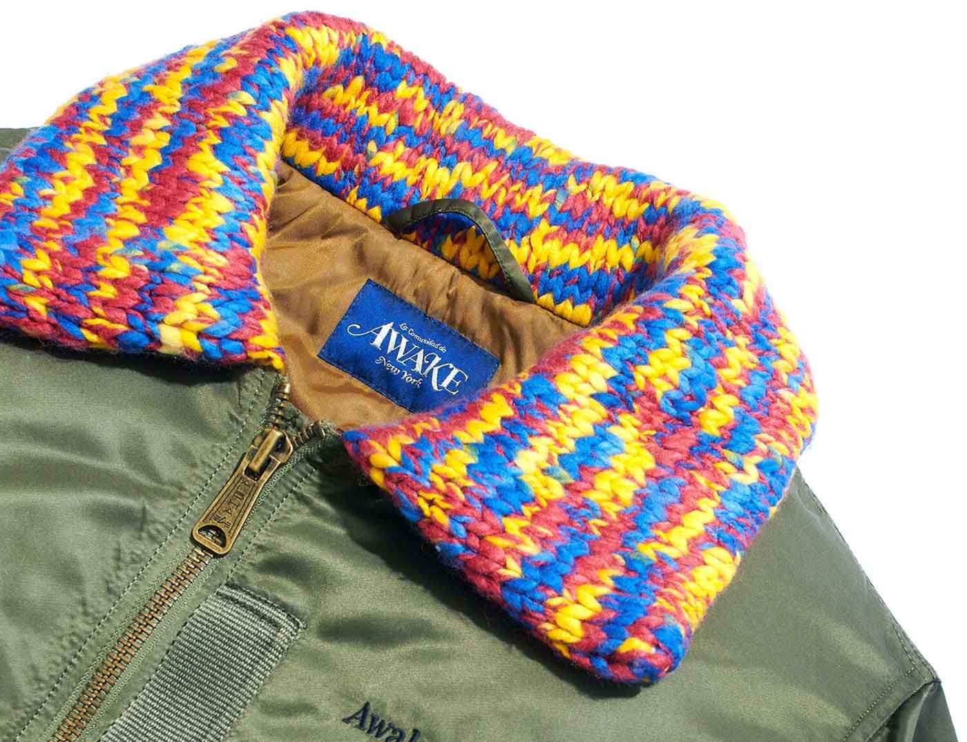 Awake NY reimagined the classic Alpha Industries MA-1 Bomber jacket with a playful twist. The new jacket is cut from washed olive nylon and trimmed with a colorful ‘sweater knit’ collar, bottom hem and sleeve cuffs. Inspired by vintage bomber styles, it retains original details like a nylon oxygen webbing tab on the chest, and an MA-1 utility pocket on the left sleeve with a red ribbon zipper extension – printed with the Awake NY logo. Designed with plenty of pockets for storage and room for layering.