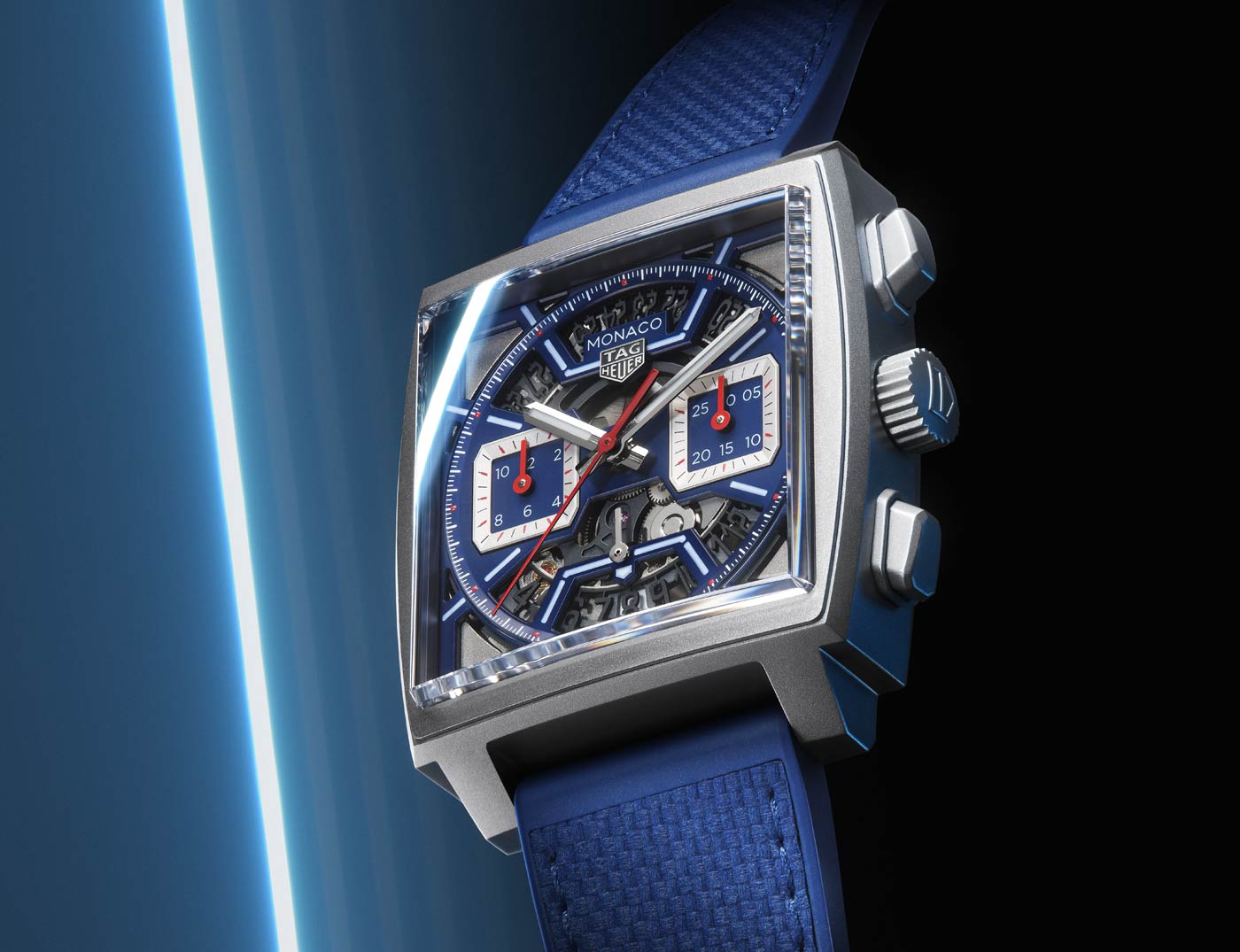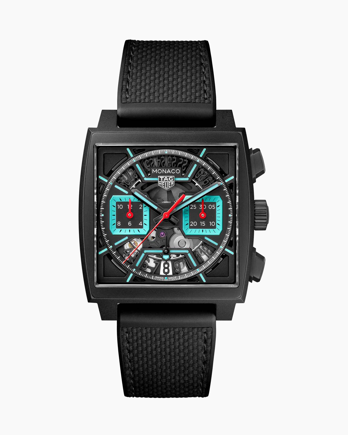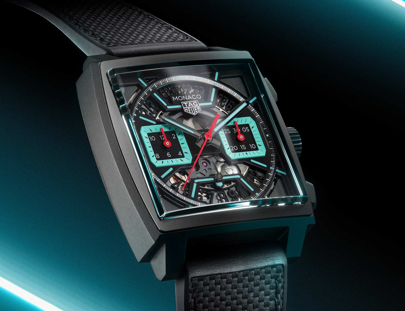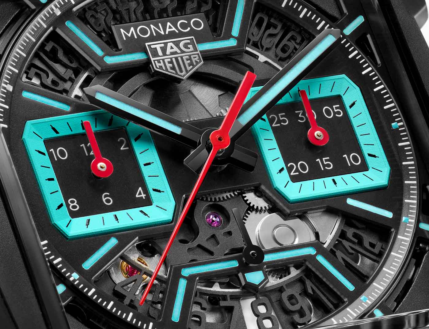 Released days before the event, the Monaco Chronograph Skeleton marks a new chapter in the evolution of the iconic Heuer Monaco, more than half a century after its inception. Available in Original Blue, Racing Red and Turquoise, the collection’s first-ever skeleton dial features luminescent details and intricate openwork inside a rugged 39-mm sandblasted titanium case. The Super-LumiNova treatment on the hands and indexes ensure optimum legibility in low-light conditions. TAG showcases the finishing on the in-house Heuer 02 movement that powers all three timepieces by using both a skeleton dial and a sapphire case back. This movement employs a conventional column wheel to activate the chronograph and boasts an 80-hour power reserve, one of the longest for a chronograph currently on the market.