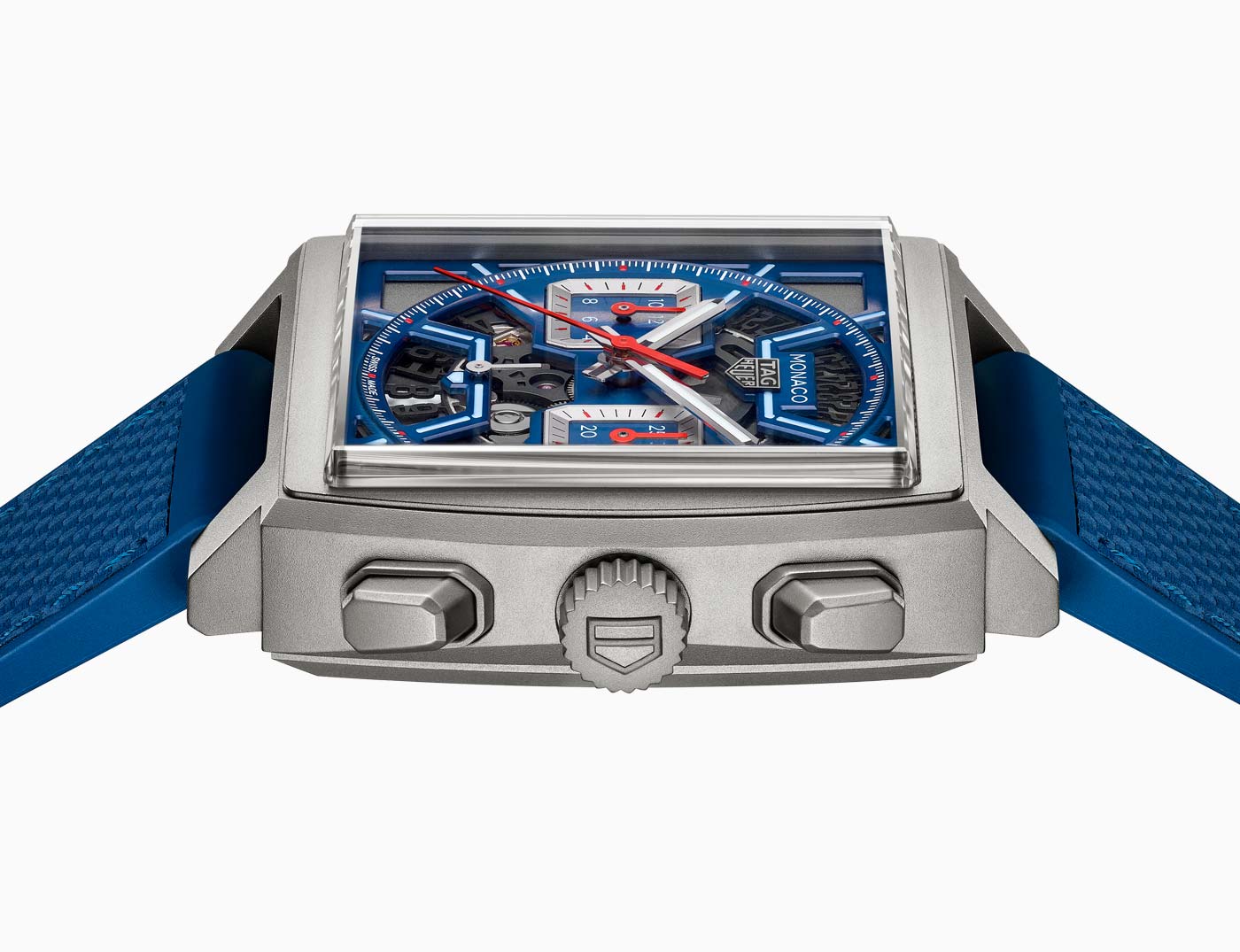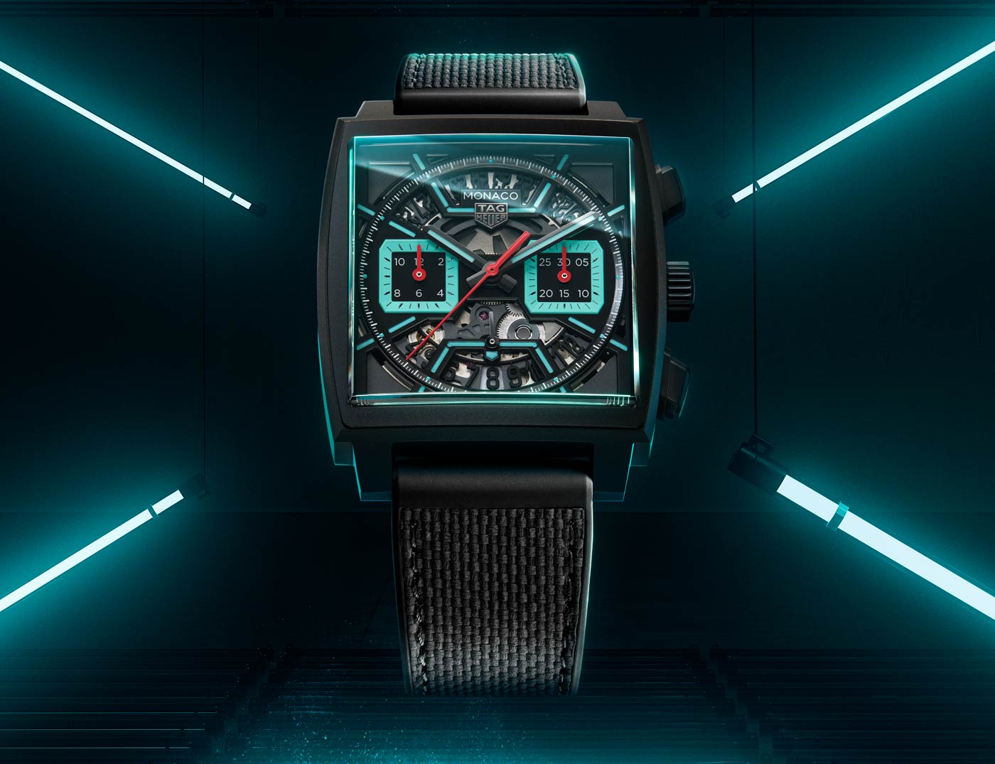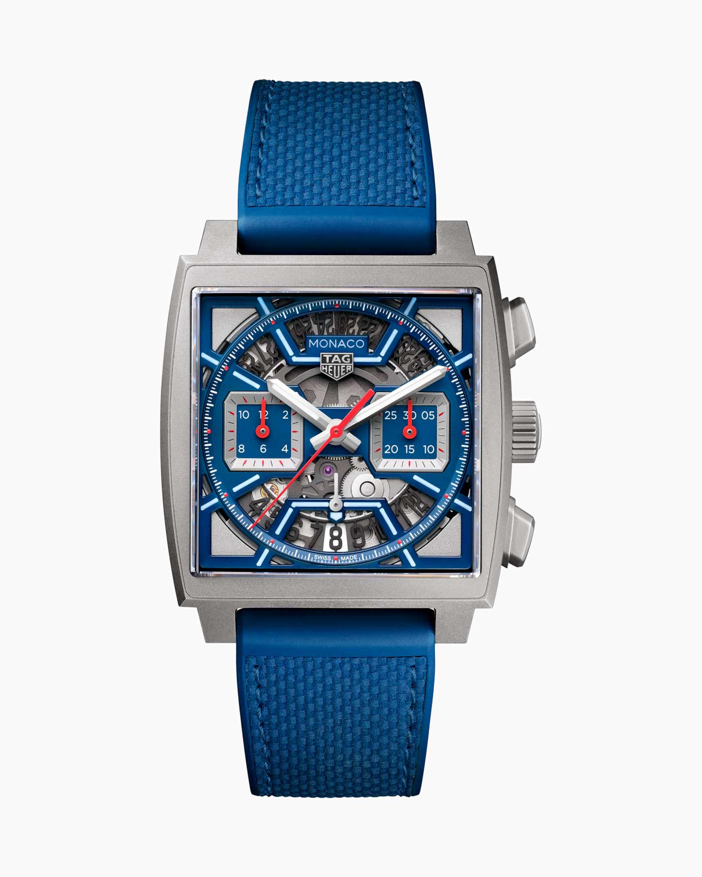 Released days before the event, the Monaco Chronograph Skeleton marks a new chapter in the evolution of the iconic Heuer Monaco, more than half a century after its inception. Available in Original Blue, Racing Red and Turquoise, the collection’s first-ever skeleton dial features luminescent details and intricate openwork inside a rugged 39-mm sandblasted titanium case. The Super-LumiNova treatment on the hands and indexes ensure optimum legibility in low-light conditions. TAG showcases the finishing on the in-house Heuer 02 movement that powers all three timepieces by using both a skeleton dial and a sapphire case back. This movement employs a conventional column wheel to activate the chronograph and boasts an 80-hour power reserve, one of the longest for a chronograph currently on the market.