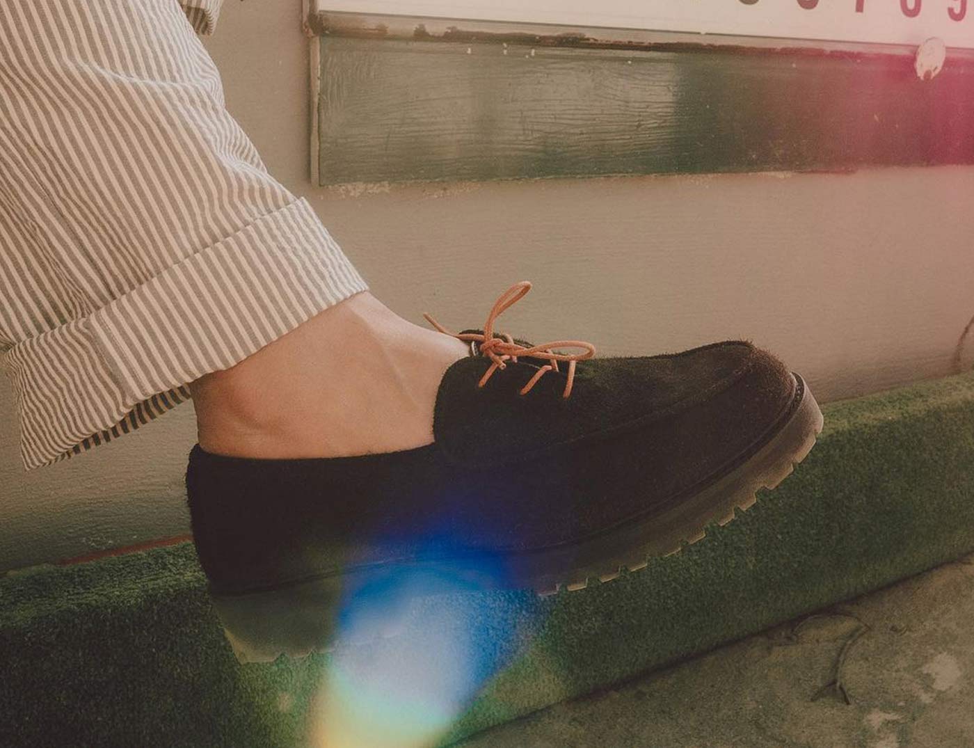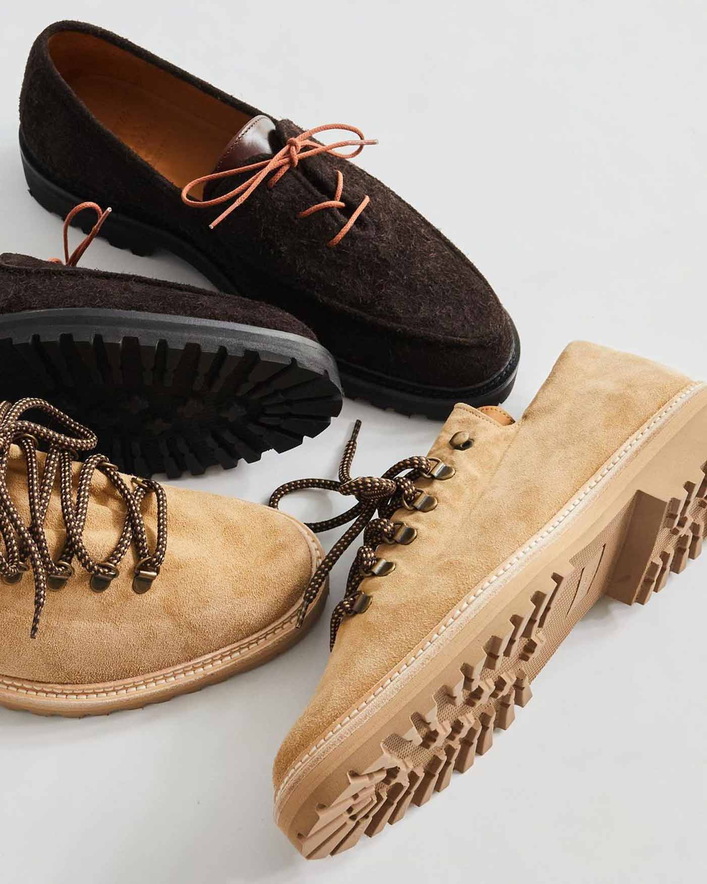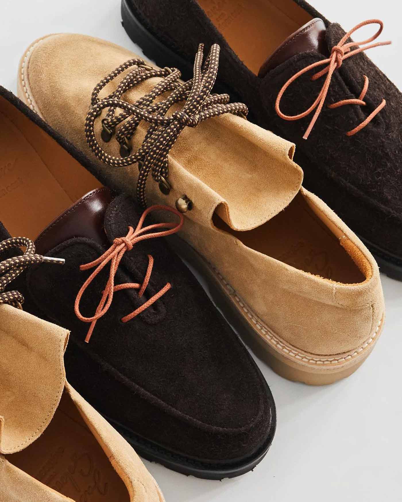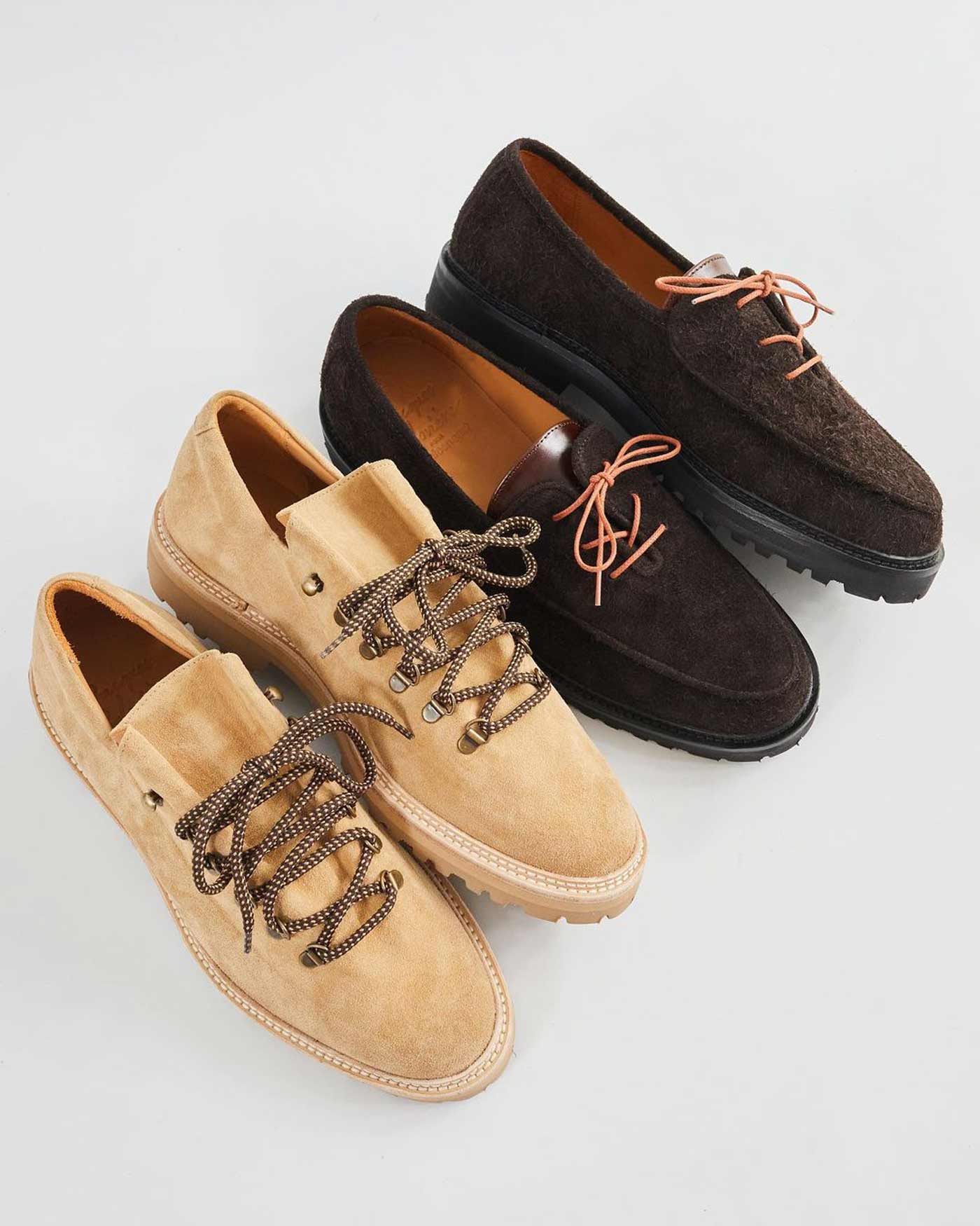 18 East’s first summer drop includes two exclusive styles from Parisian shoemaker Jacques Solovière. The first look is a customized version of the Rasmus Lug ($448.00). An elevated take on traditional hiking boots, the upper is whole cut from a single piece of undyed Italian calf suede and topped with D-ring lace loops cast from aged brass. The second style is a custom version of the Fleurus derby cut from hairy Italian chocolate suede with a contrasting glossy leather tongue, topped by melon colored laces. Both styles are double welted with rugged natural rubber lug soles, using Goodyear construction so the shoes can be resoled.