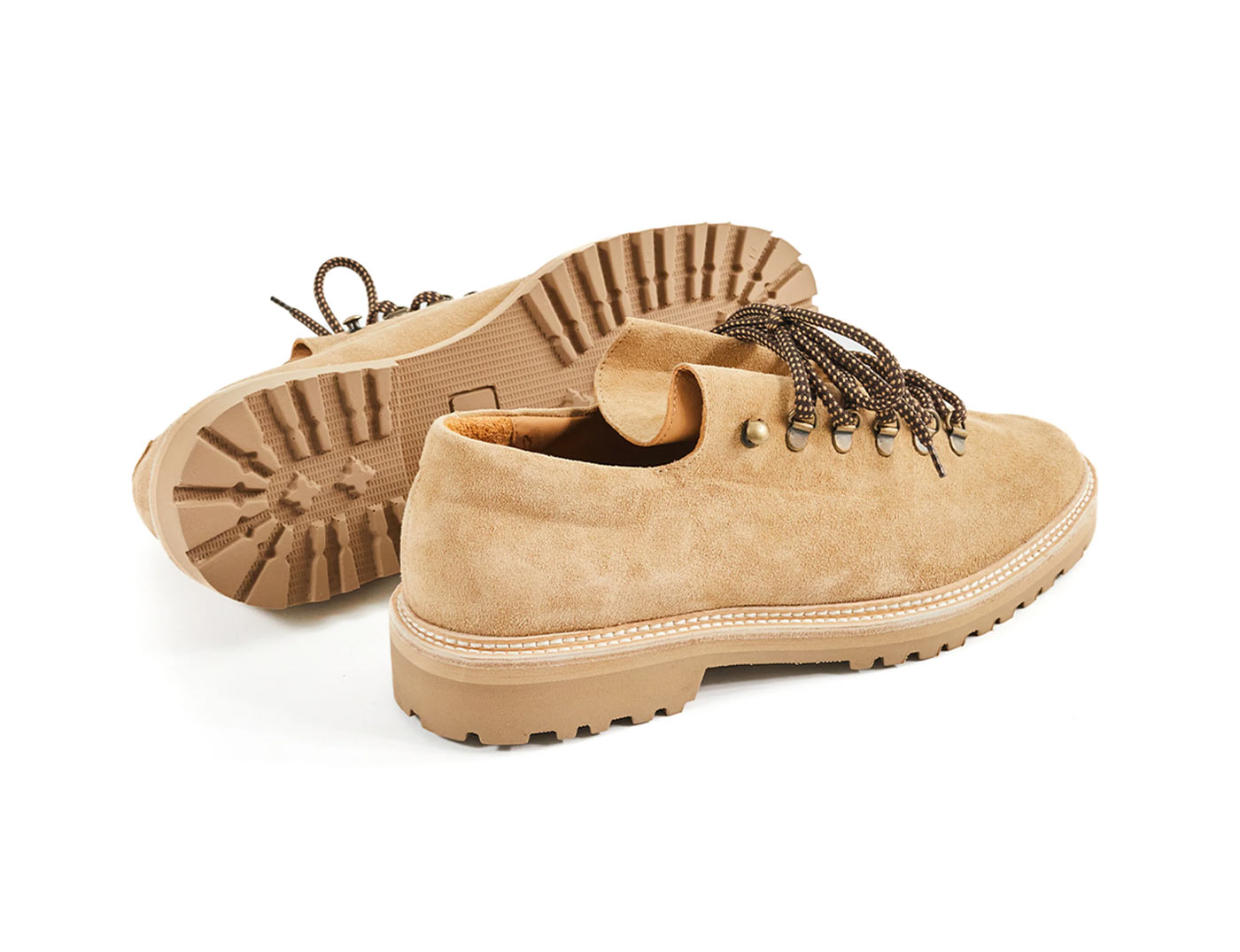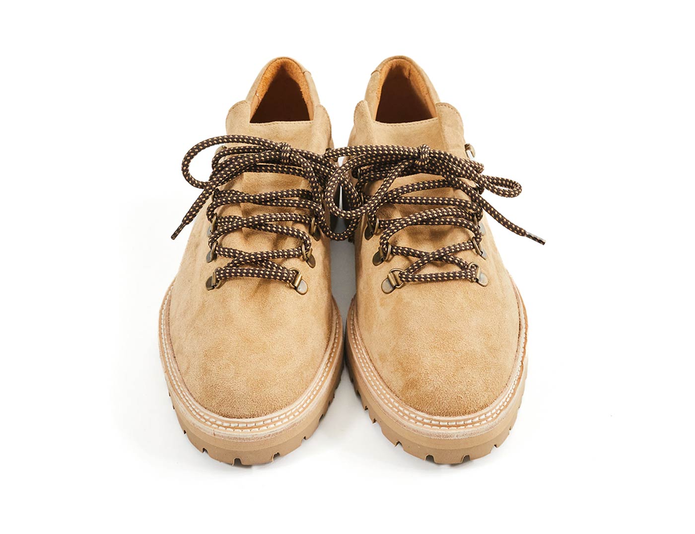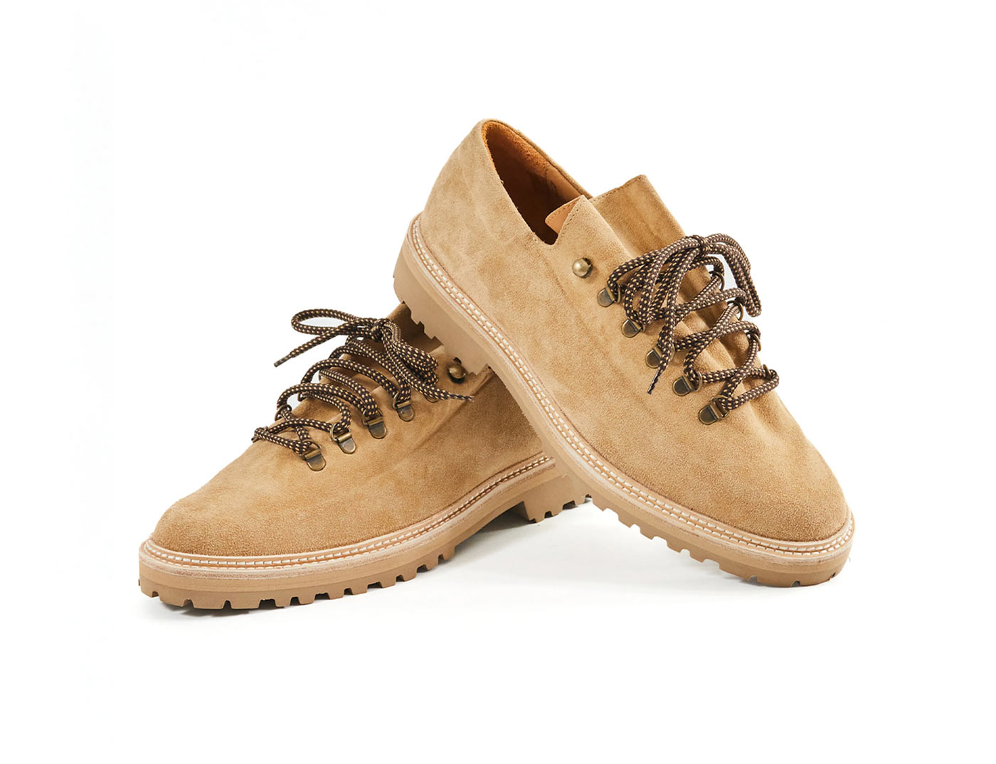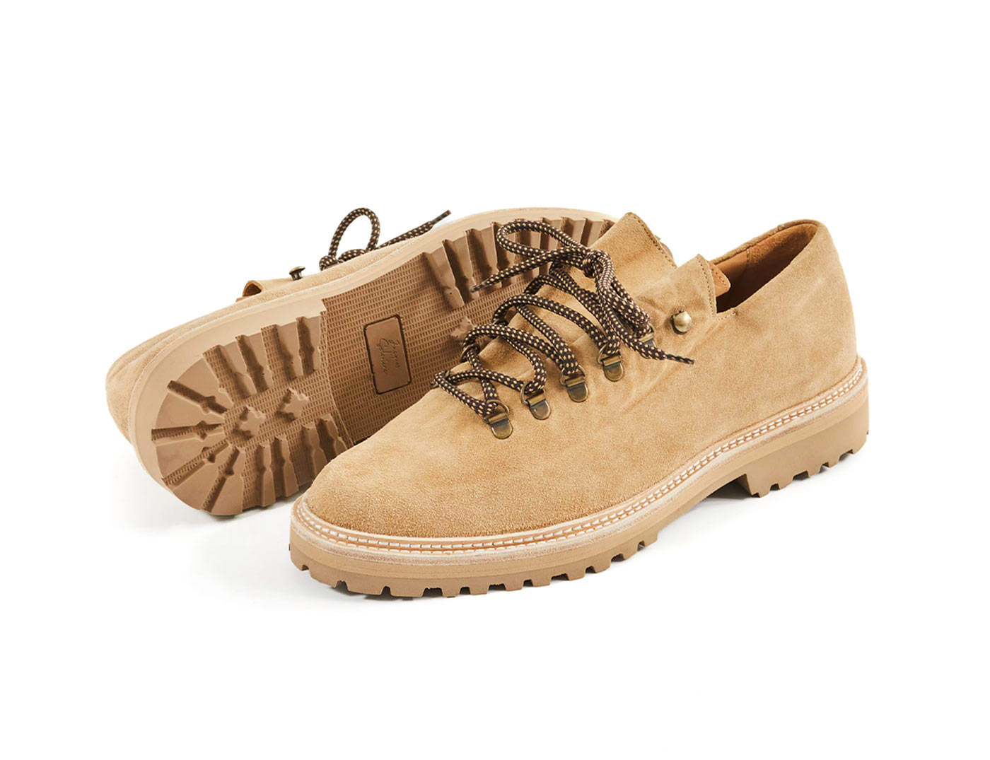 18 East’s first summer drop includes two exclusive styles from Parisian shoemaker Jacques Solovière. The first look is a customized version of the Rasmus Lug ($448.00). An elevated take on traditional hiking boots, the upper is whole cut from a single piece of undyed Italian calf suede and topped with D-ring lace loops cast from aged brass. The second style is a custom version of the Fleurus derby cut from hairy Italian chocolate suede with a contrasting glossy leather tongue, topped by melon colored laces. Both styles are double welted with rugged natural rubber lug soles, using Goodyear construction so the shoes can be resoled.