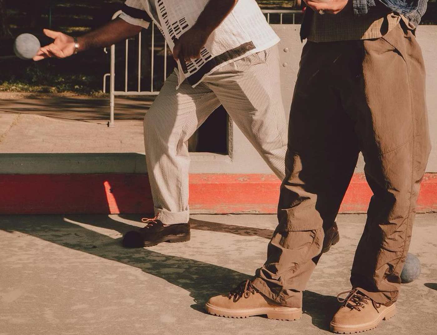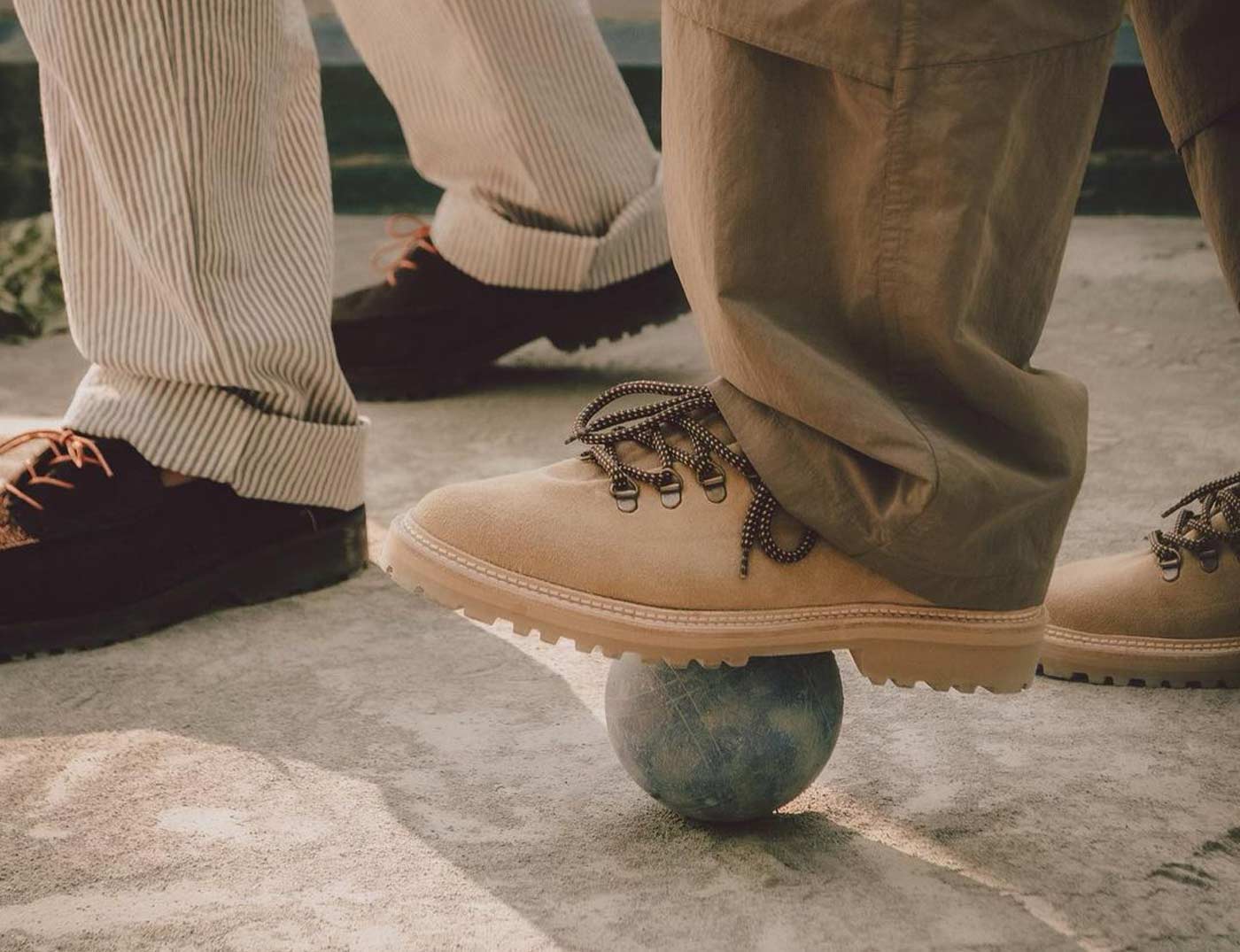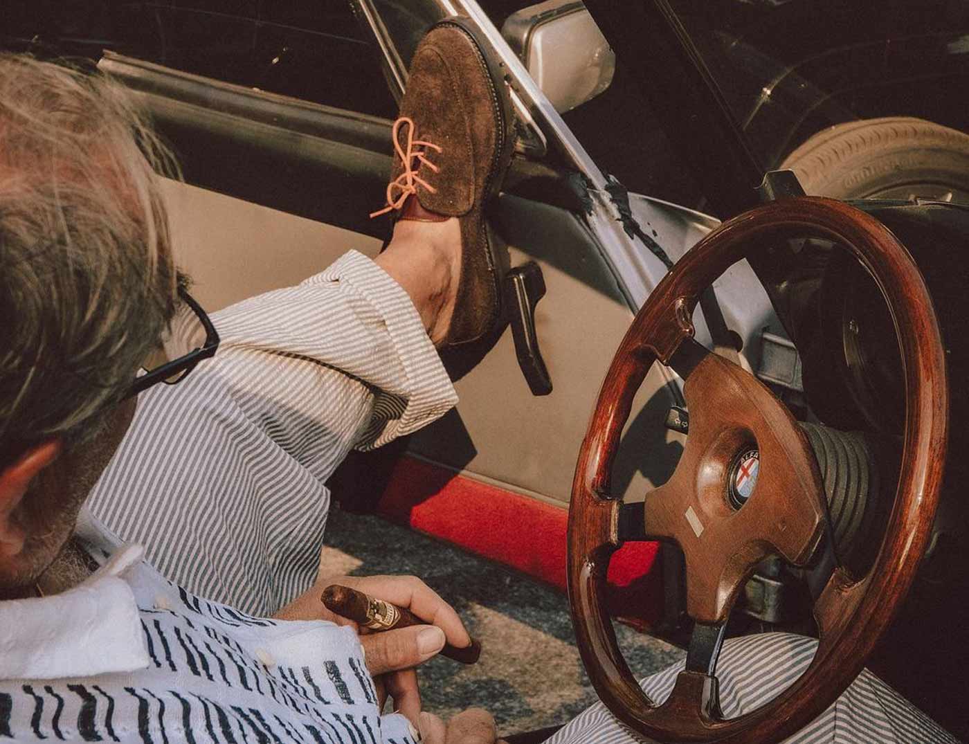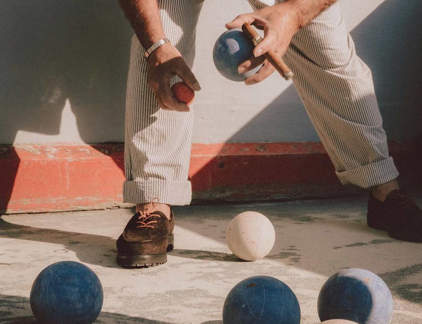 18 East’s first summer drop includes two exclusive styles from Parisian shoemaker Jacques Solovière. The first look is a customized version of the Rasmus Lug ($448.00). An elevated take on traditional hiking boots, the upper is whole cut from a single piece of undyed Italian calf suede and topped with D-ring lace loops cast from aged brass. The second style is a custom version of the Fleurus derby cut from hairy Italian chocolate suede with a contrasting glossy leather tongue, topped by melon colored laces. Both styles are double welted with rugged natural rubber lug soles, using Goodyear construction so the shoes can be resoled.