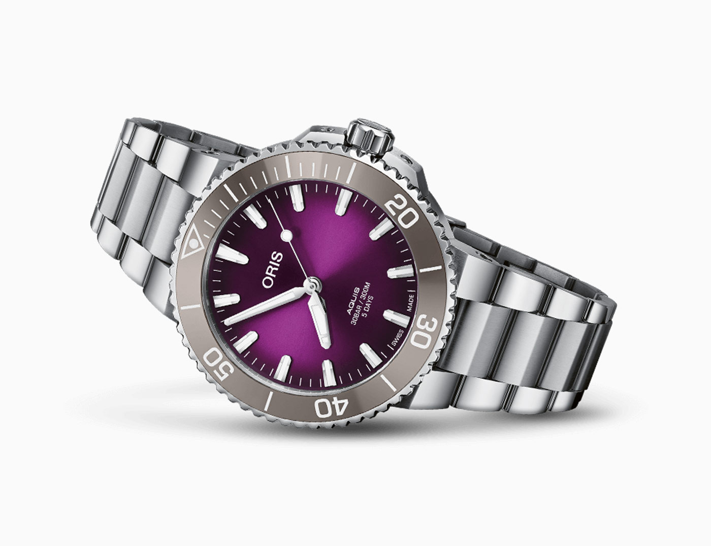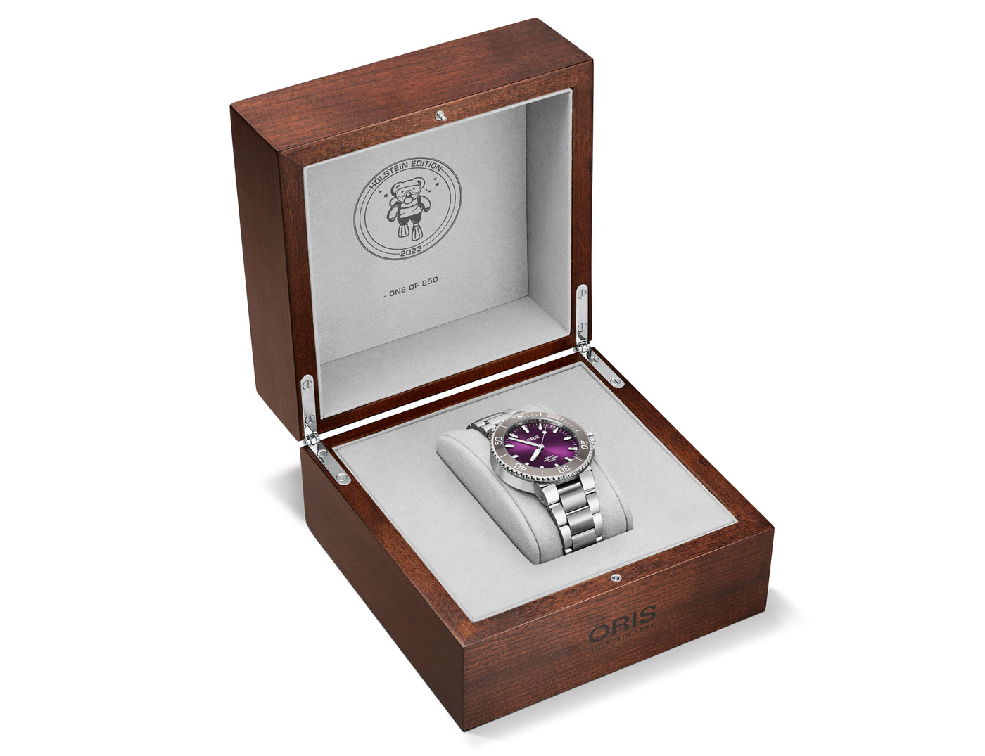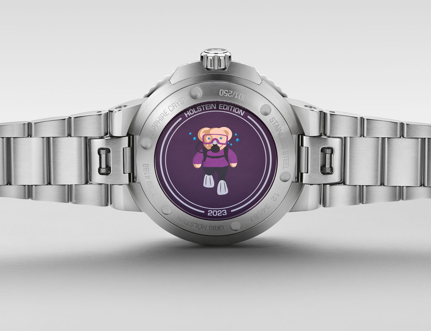 Oris designs its annual Hölstein Editions for loyal customers and mechanical watch enthusiasts. These timepieces are produced in limited quantities and include ‘features that will never come together again.’ Packed with firsts and special requests, the Hölstein Edition 2023 is strictly for the fans. For the first time Oris selected a model from the best-selling Aquis diver collection for a Hölstein Edition, with the brands first-ever purple dial – requested by the Oris community – as the design centerpiece. Also unique is that this Aquis dial has no date, in response to another request from fans. But the purple dial is still easily legible, with luminescent inserts in the hands and extra large hour markers. As a finishing touch, the back of the 41.50-mm stainless steel case is engraved with the edition number and printed with an illustration of the Oris Bear, diving in his scuba gear. Limited to 250 pieces.