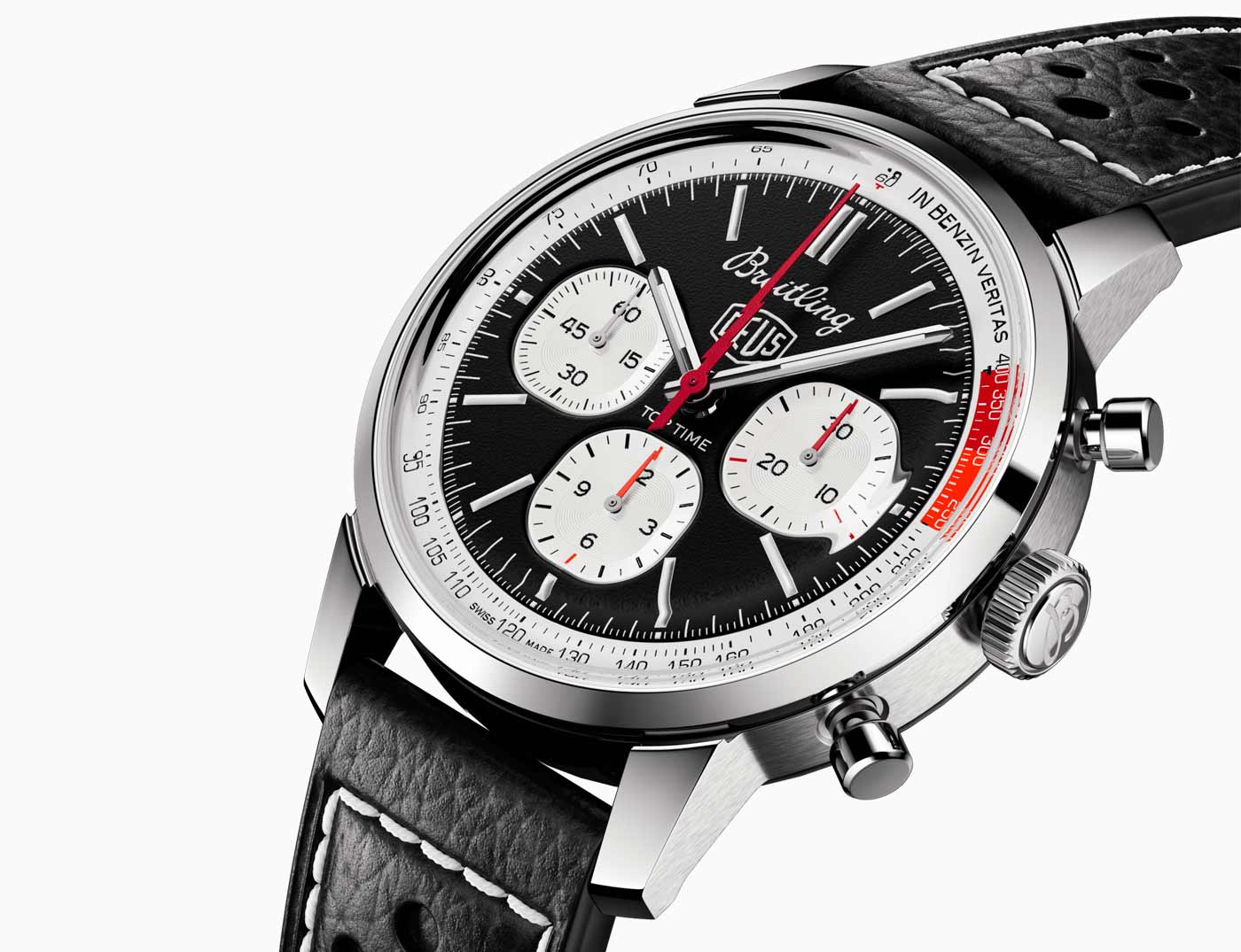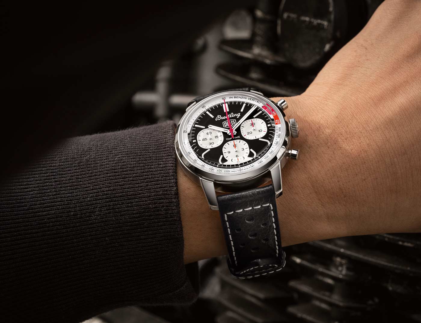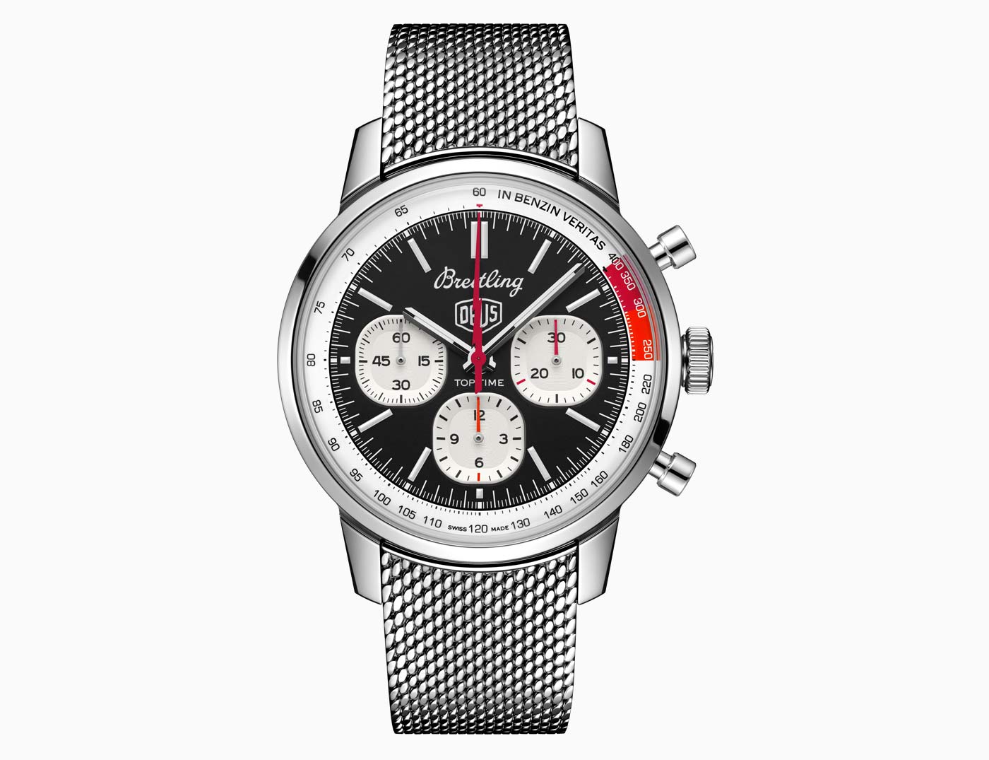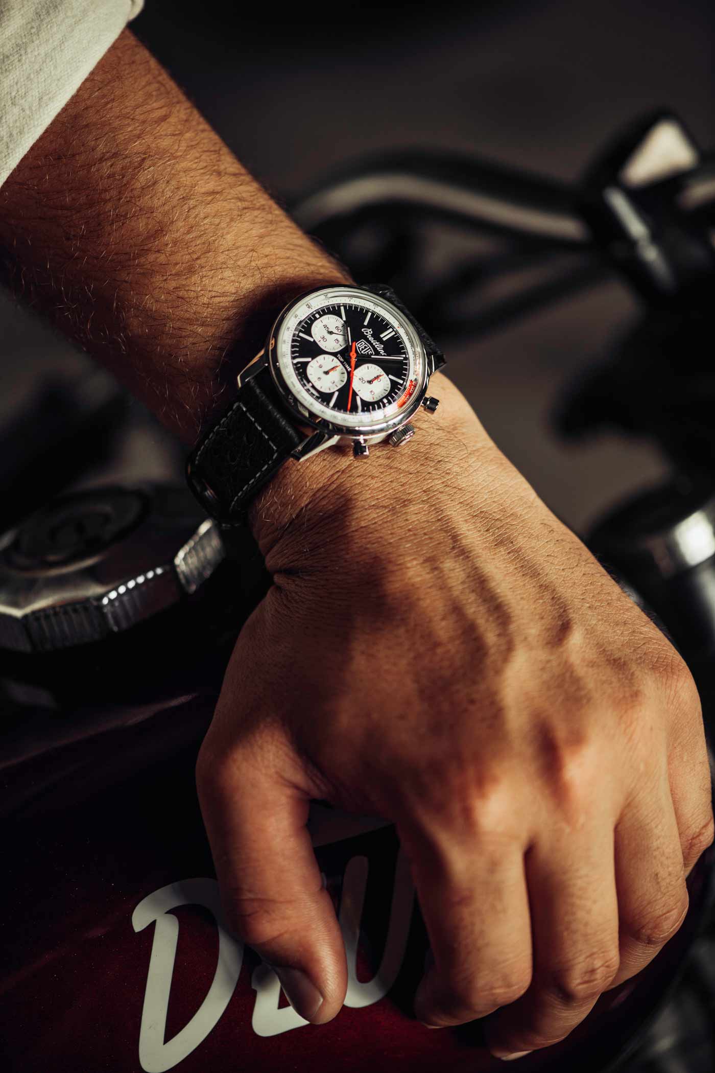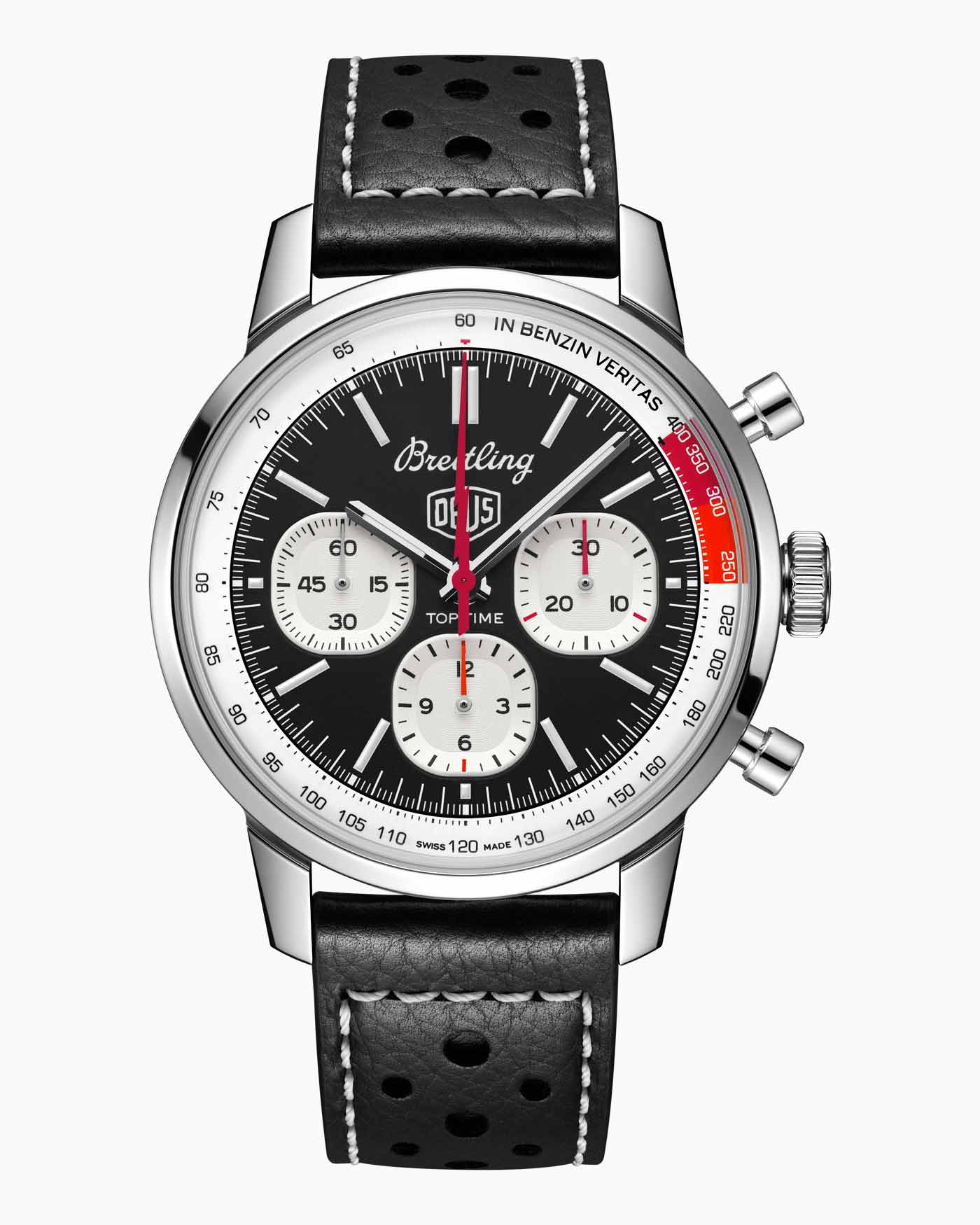 Breitling used the backdrop of this year’s Wheels & Waves festival in Biarritz to launch its latest collaboration with Australian surf-and-motorcycle outfitter Deus Ex Machina. The Top Time B01 Deus features a co-branded black dial with three white sub-dials and a red lightning-bolt-shaped chronograph hand. A speed-measuring tachymeter scale, printed on a white background alongside the adage In benzin veritas, circles the edge of the dial. The ‘squircle’ sub-dials – not quite square, not quite round, and similar to vintage dashboard gauges – combined with the perforated leather racing strap give the watch a retro feel. Made of stainless steel, it’s powered by Breitling’s Caliber 01 and has an impressive 70-hour power reserve.
