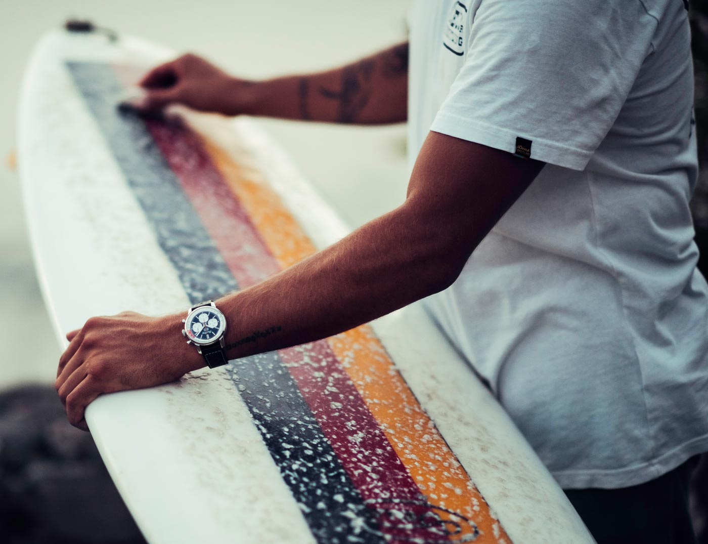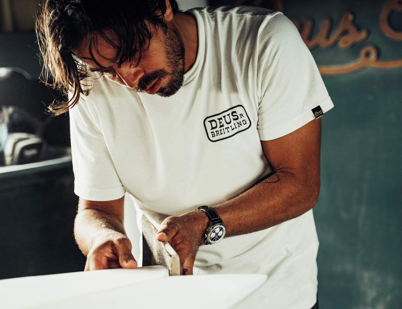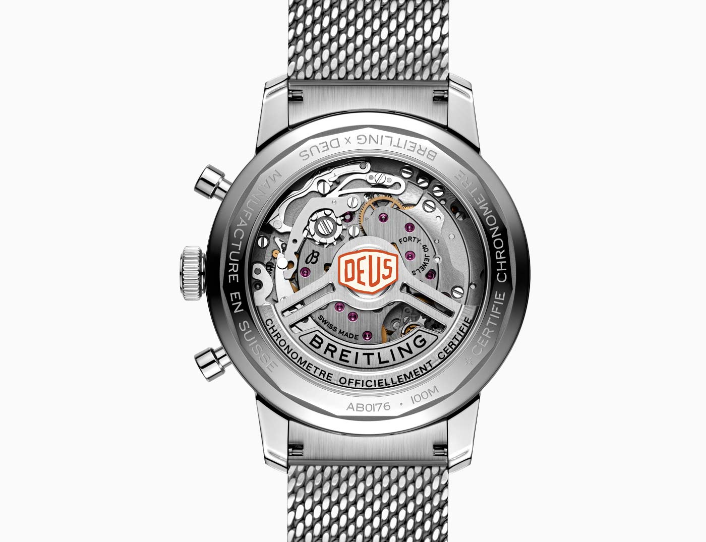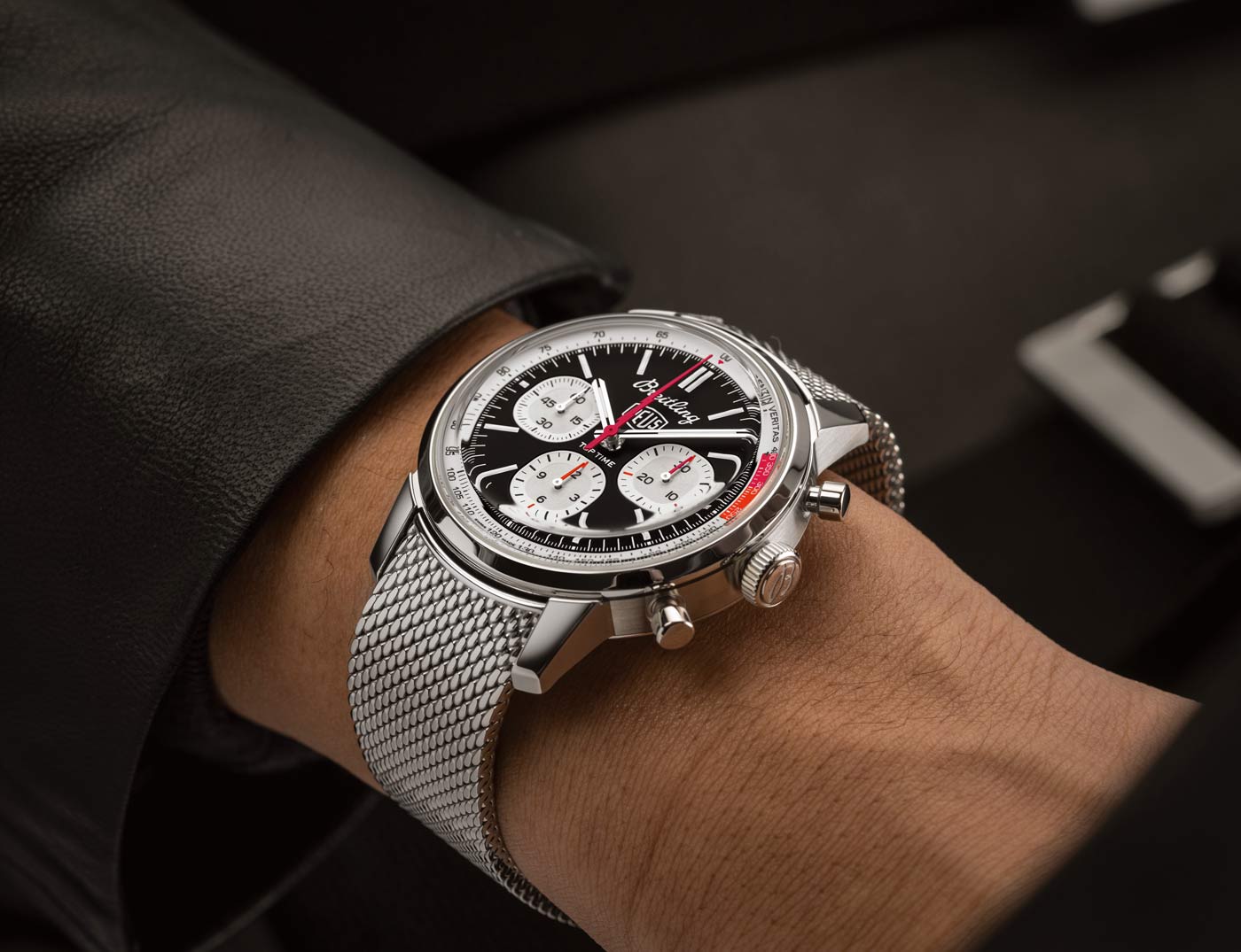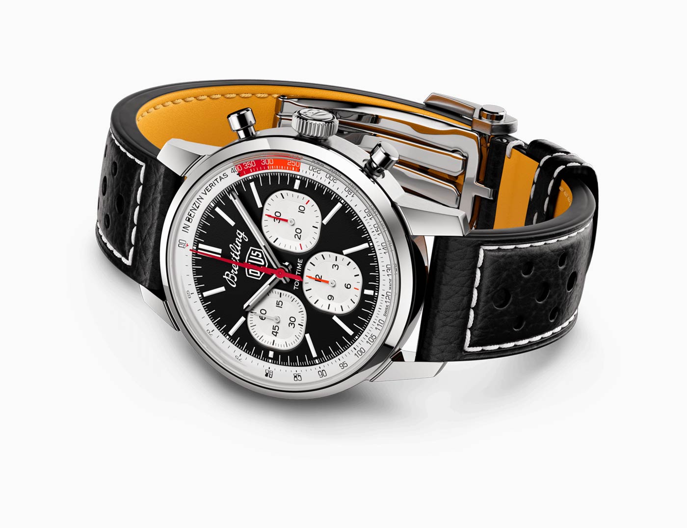 Breitling used the backdrop of this year’s Wheels & Waves festival in Biarritz to launch its latest collaboration with Australian surf-and-motorcycle outfitter Deus Ex Machina. The Top Time B01 Deus features a co-branded black dial with three white sub-dials and a red lightning-bolt-shaped chronograph hand. A speed-measuring tachymeter scale, printed on a white background alongside the adage In benzin veritas, circles the edge of the dial. The ‘squircle’ sub-dials – not quite square, not quite round, and similar to vintage dashboard gauges – combined with the perforated leather racing strap give the watch a retro feel. Made of stainless steel, it’s powered by Breitling’s Caliber 01 and has an impressive 70-hour power reserve.