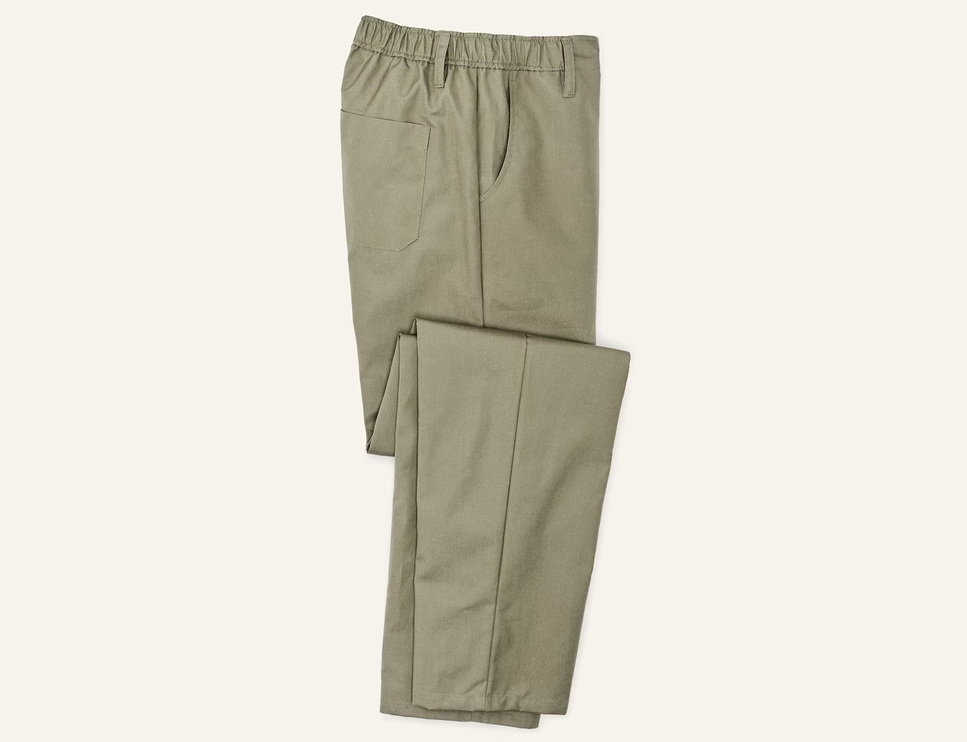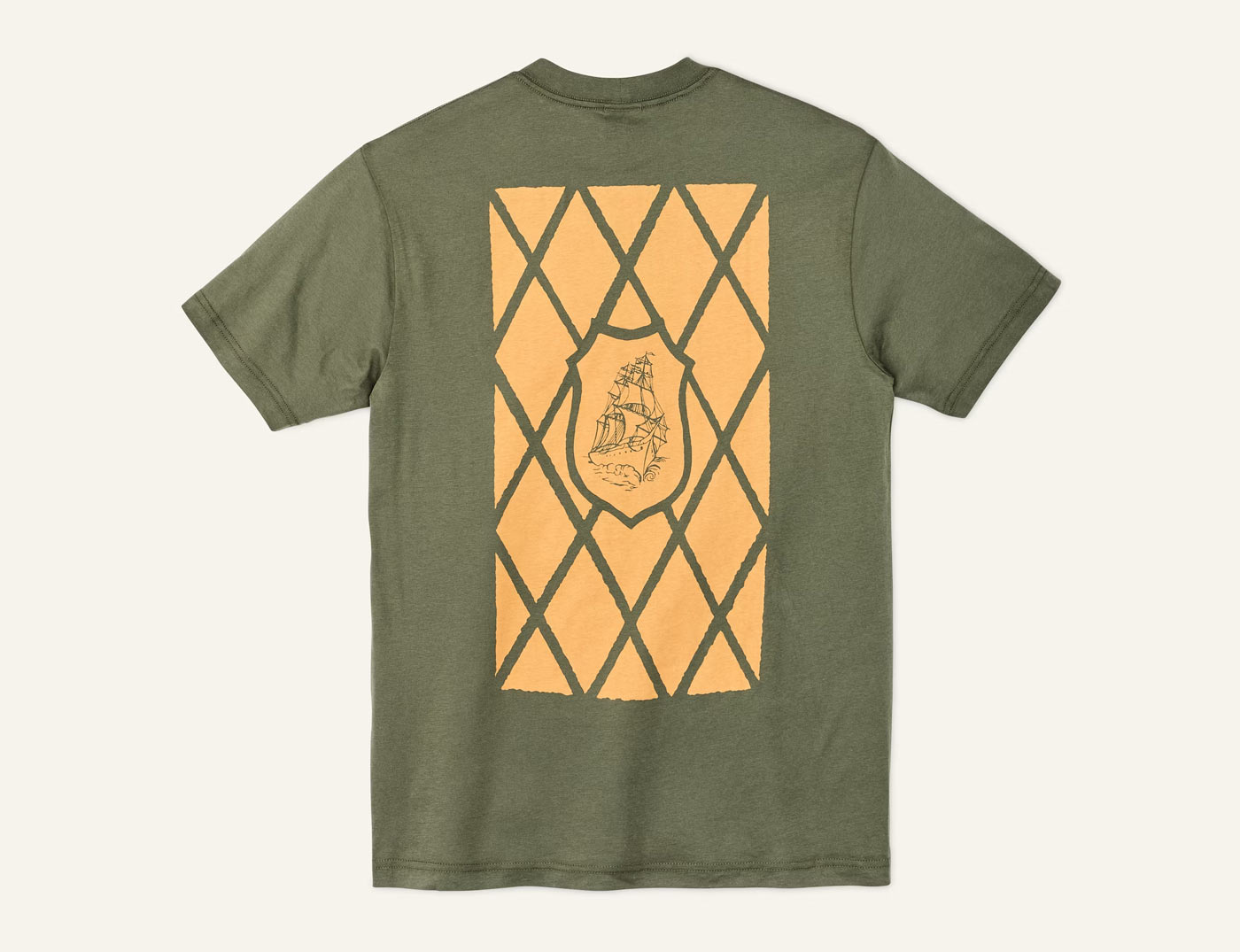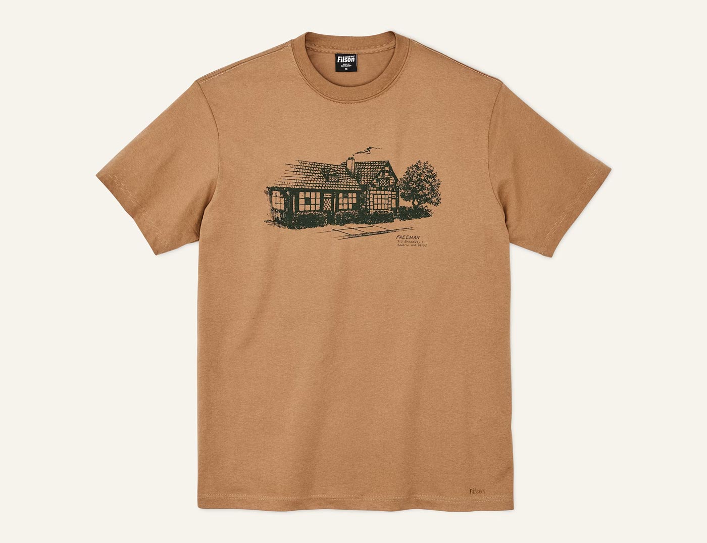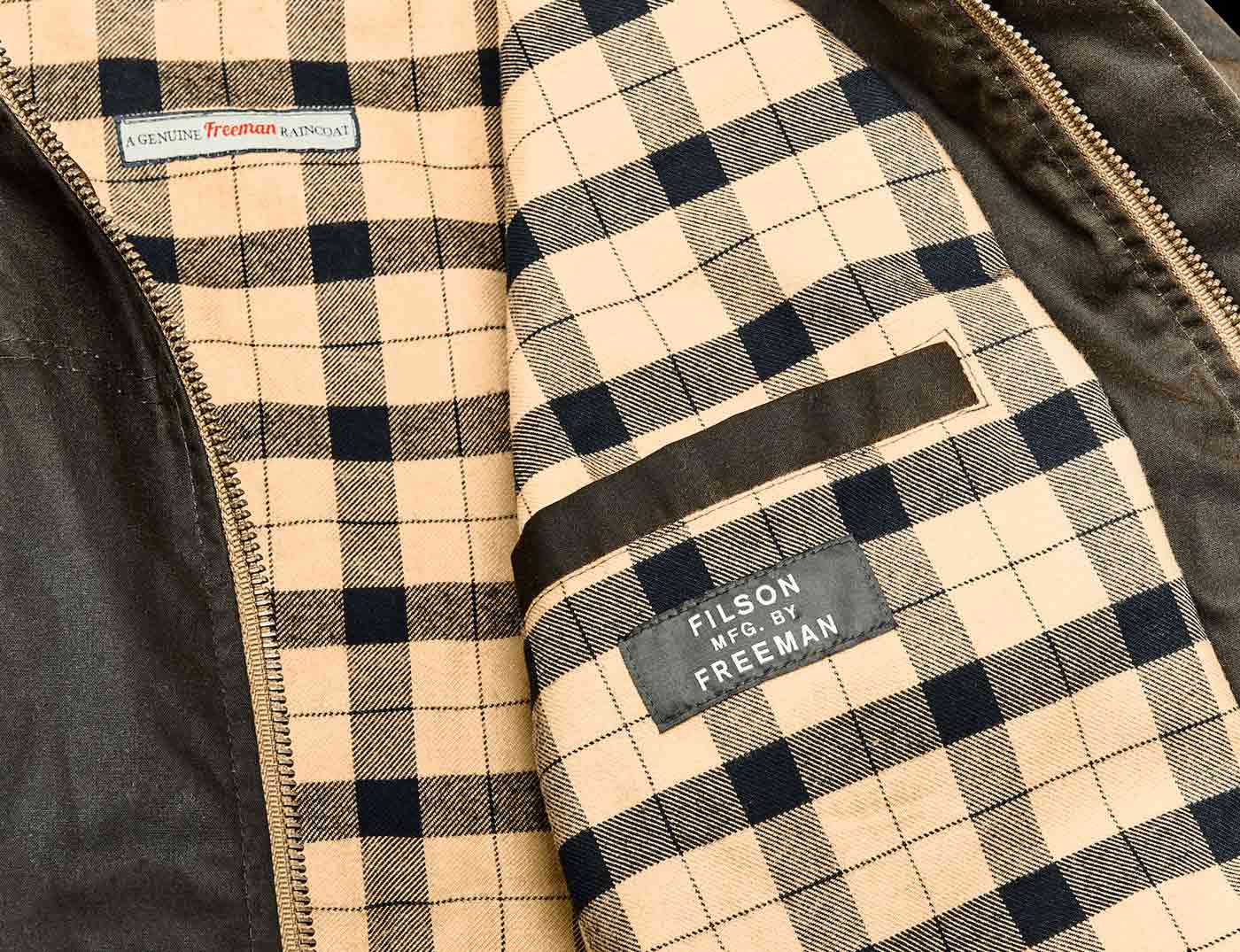 Seattle neighbors Filson and Freeman teamed up on a 10-piece collection inspired by a shared passion for American sportswear and workwear. Combining Filson’s heritage fabrics with Freeman’s modern silhouettes, the capsule includes a waxed cotton raincoat, an overshirt cut from 14-wale cotton corduroy, flannel shirts, all-purpose pants, graphic tees and baseball caps. Freeman made the Raincoat ($495.00) and elastic waist Studio Pants ($195.00) in Seattle with Filson’s signature oil finish Cover Cloth, a water-resistant waxed cotton light enough for year-round wear. The raincoat is lined with Filson’s iconic Alaskan Guide flannel, a brushed-cotton fabric ‘trusted by bush pilots and outdoorsmen for nearly three decades.’ Freeman also used the dense Alaskan Guide flannel to make the Weathervane Shirt ($225.00), one in navy and a second in the same camel & black check pattern used to line the raincoat.